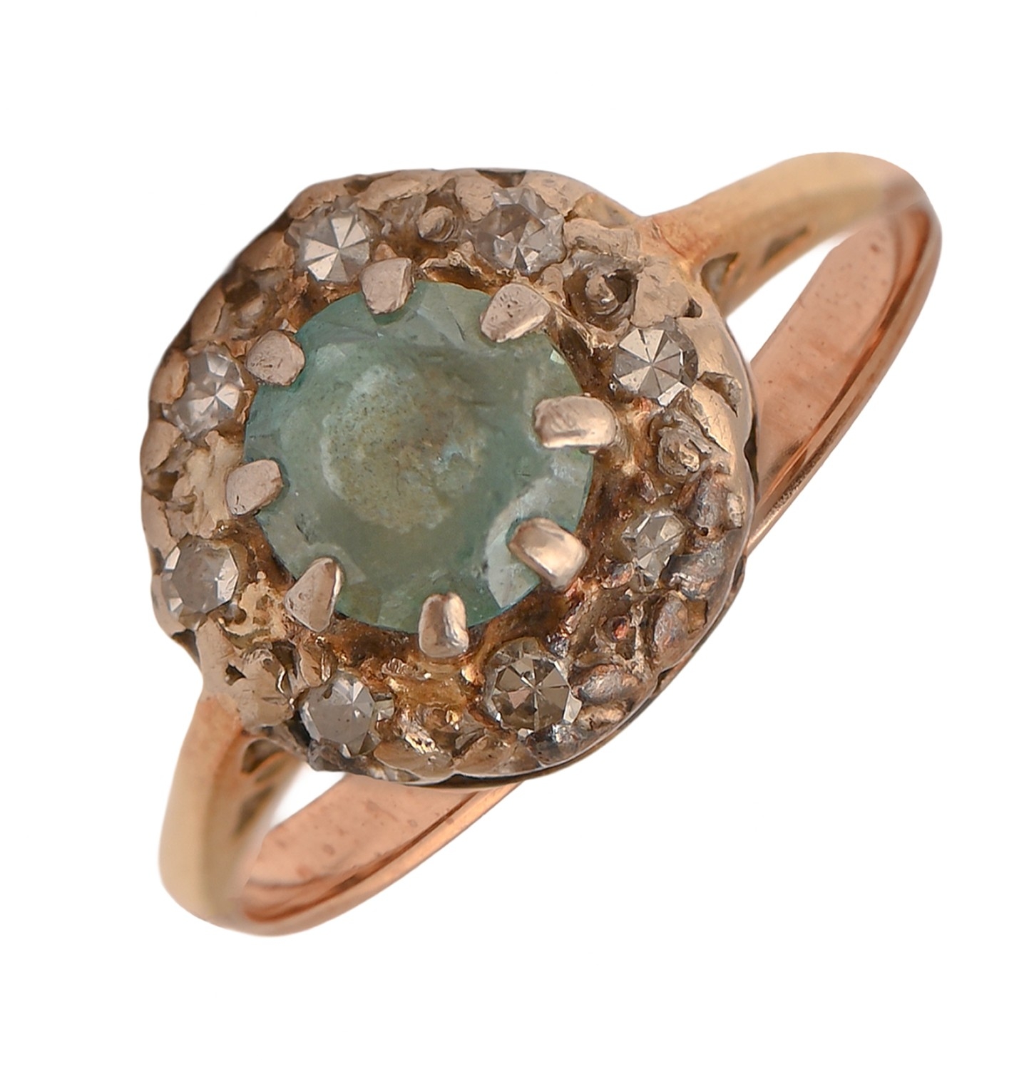 Aquamarine very worn, diamonds generally clean and white, gold hoop worn