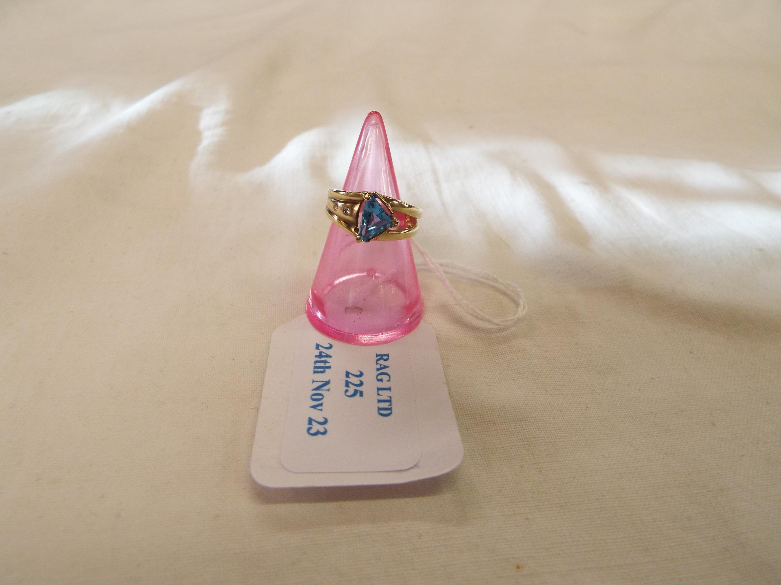 A 14k gold ring inset with a trillion-cut aquamarine gemstone and diamonds, size I