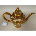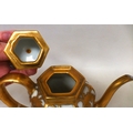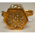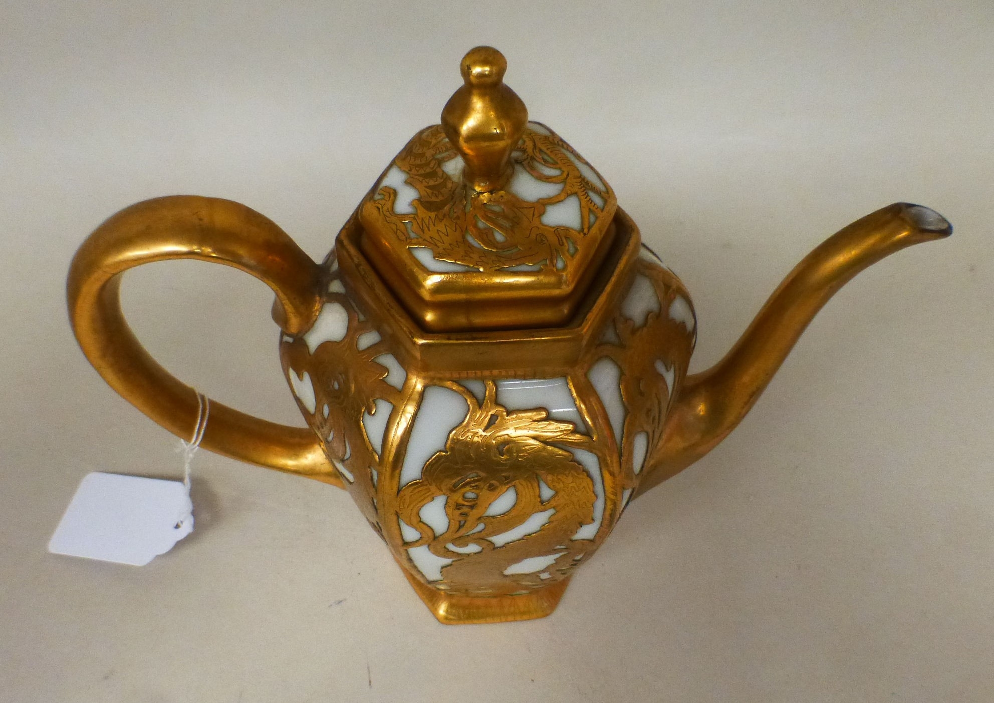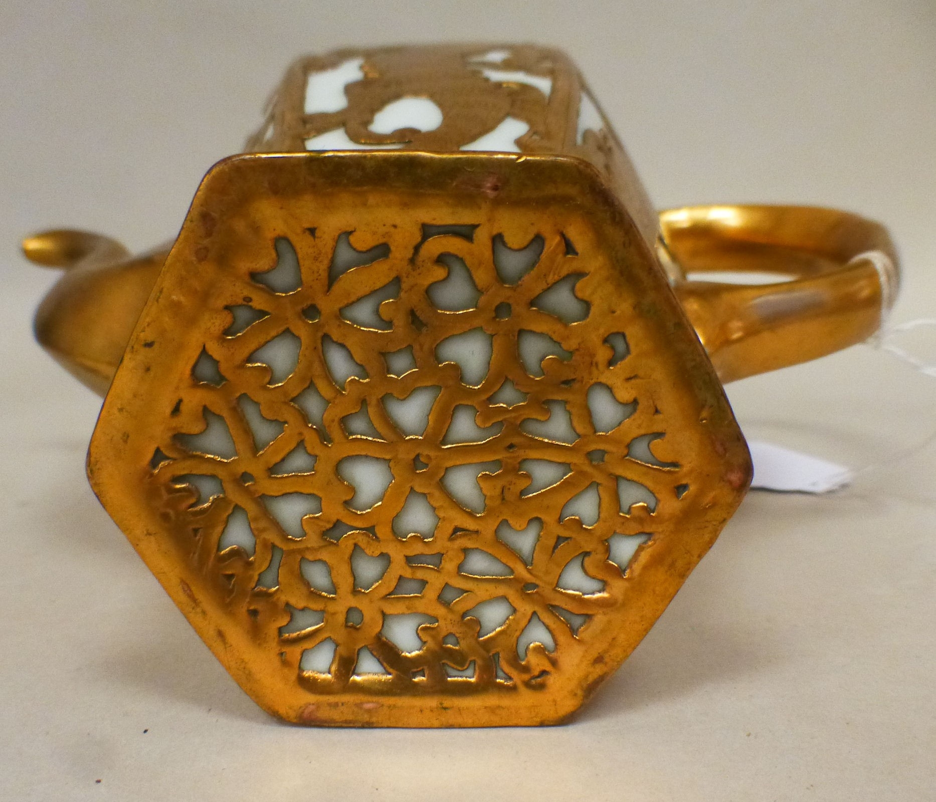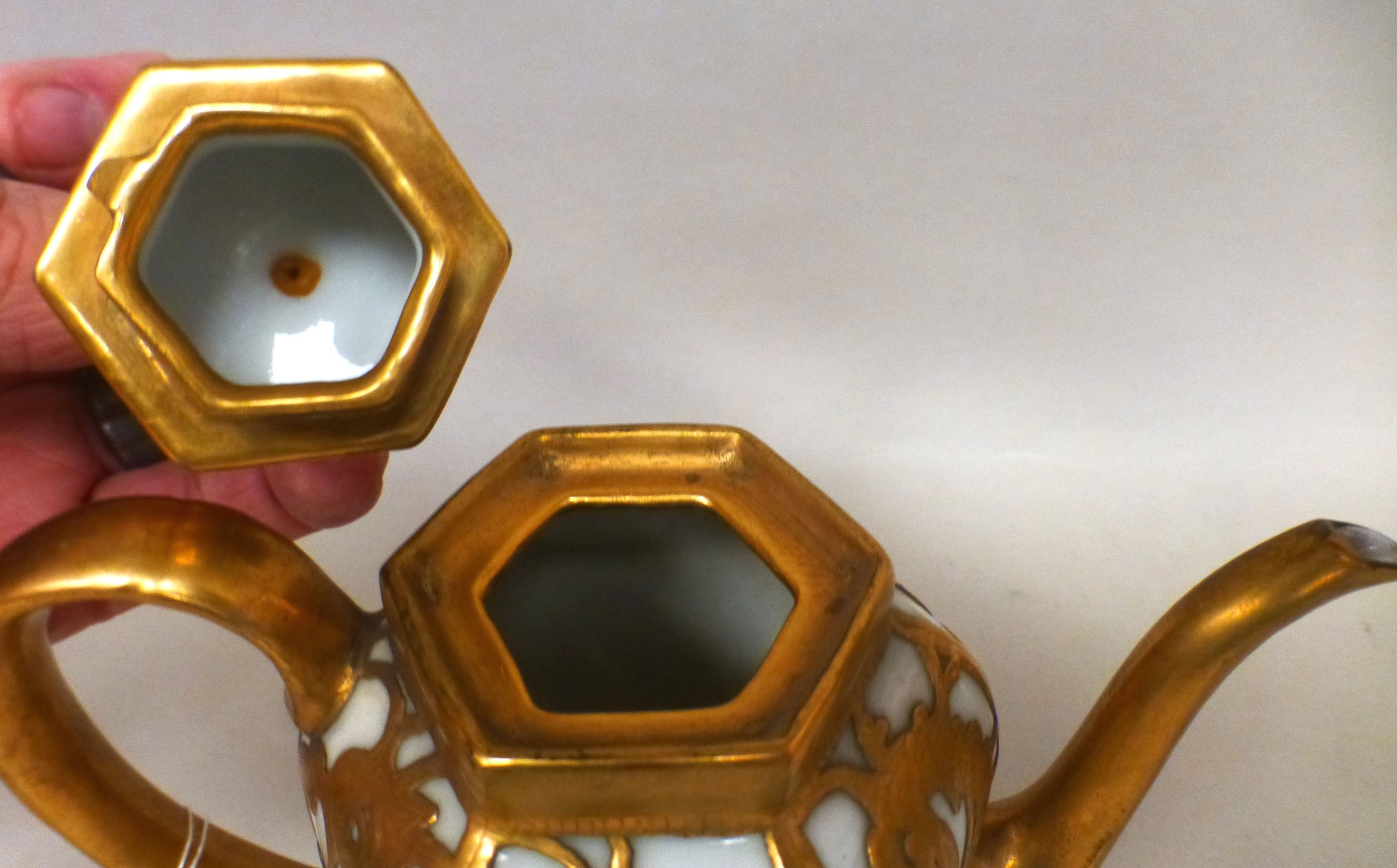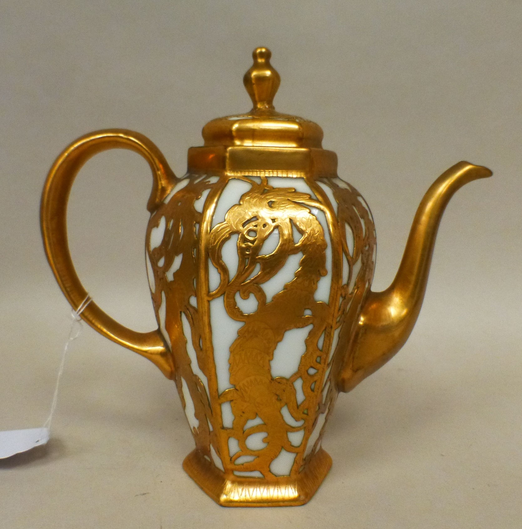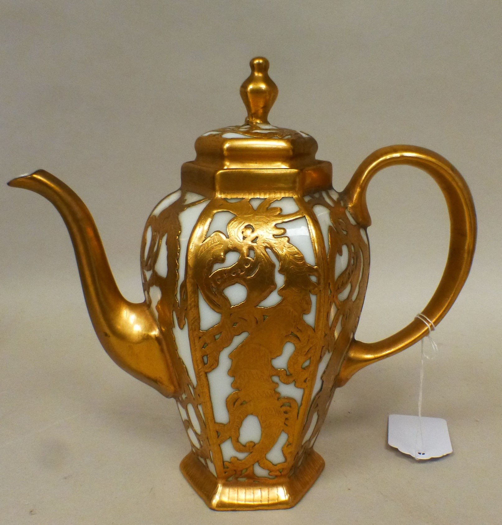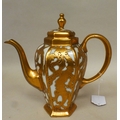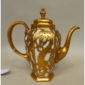A mid/late 19thC (possibly French) coffee pot, in milk coloured porcelain, decorated in relief with gilded overlay, on an hexagonal footrim