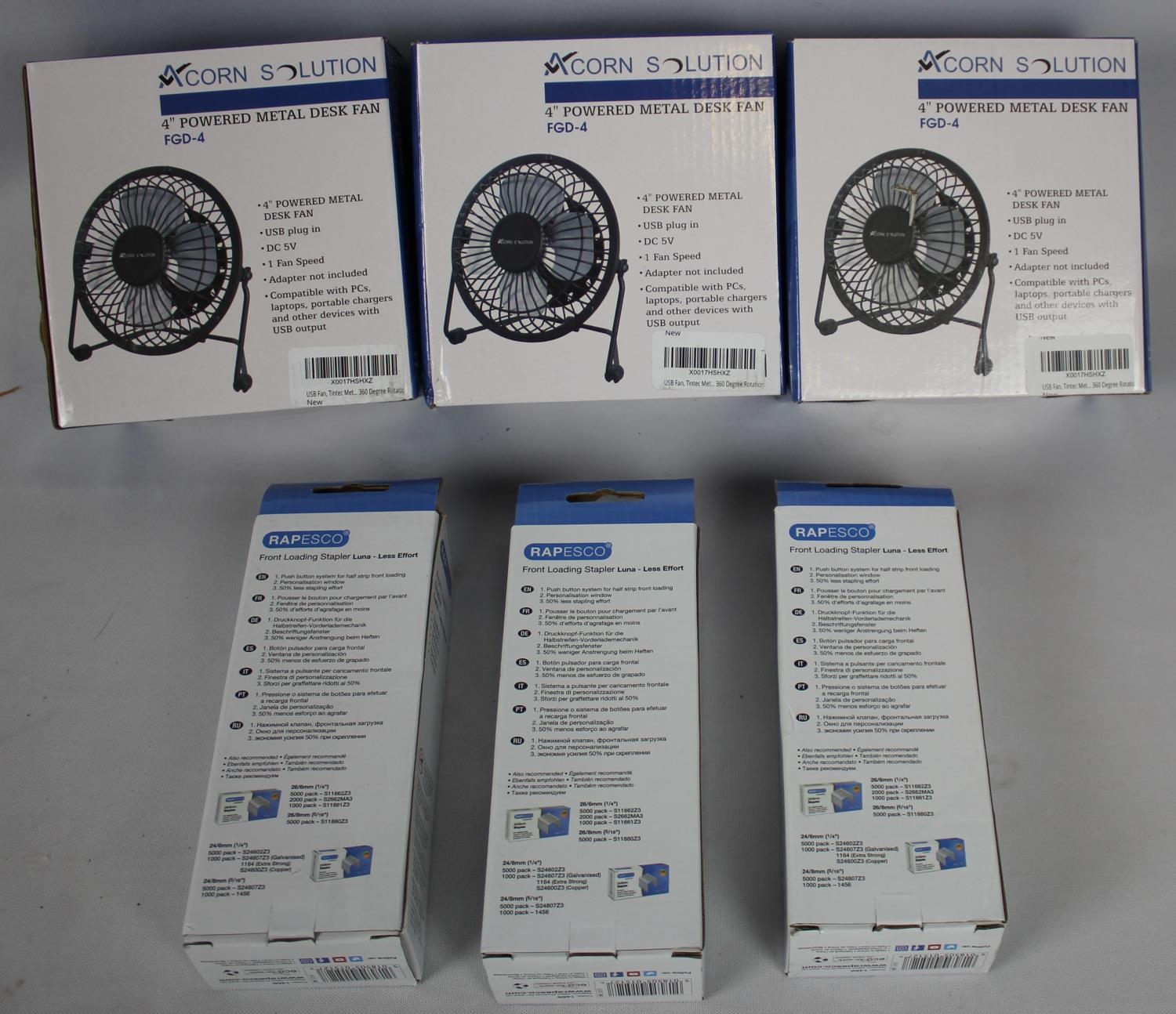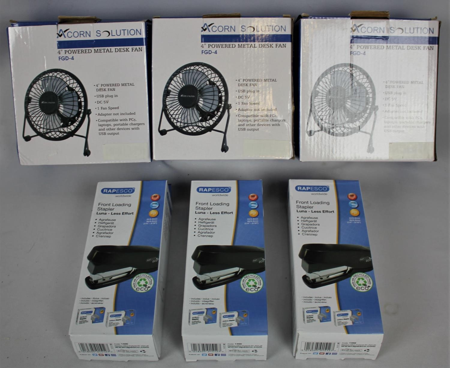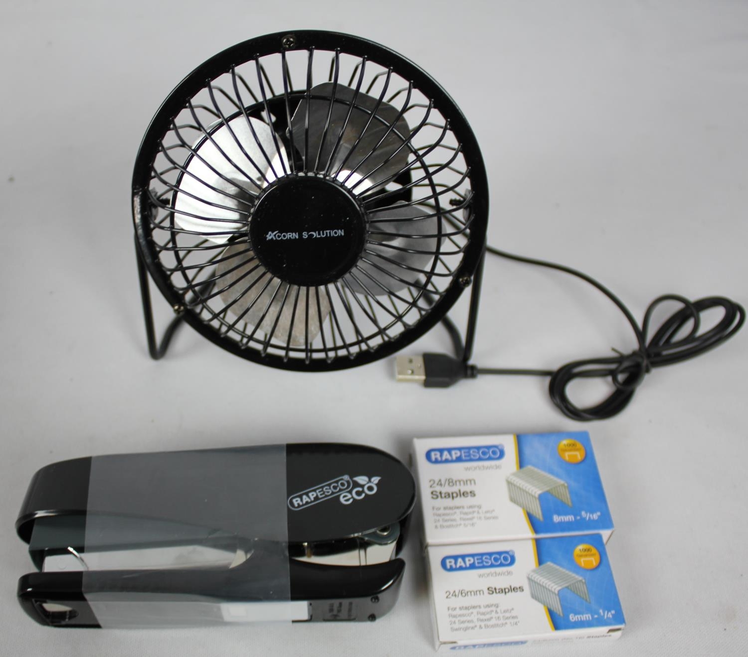 3 ACORN SOLUTIONS USB DESK FANS & 2 RAPESCO STAPLERS