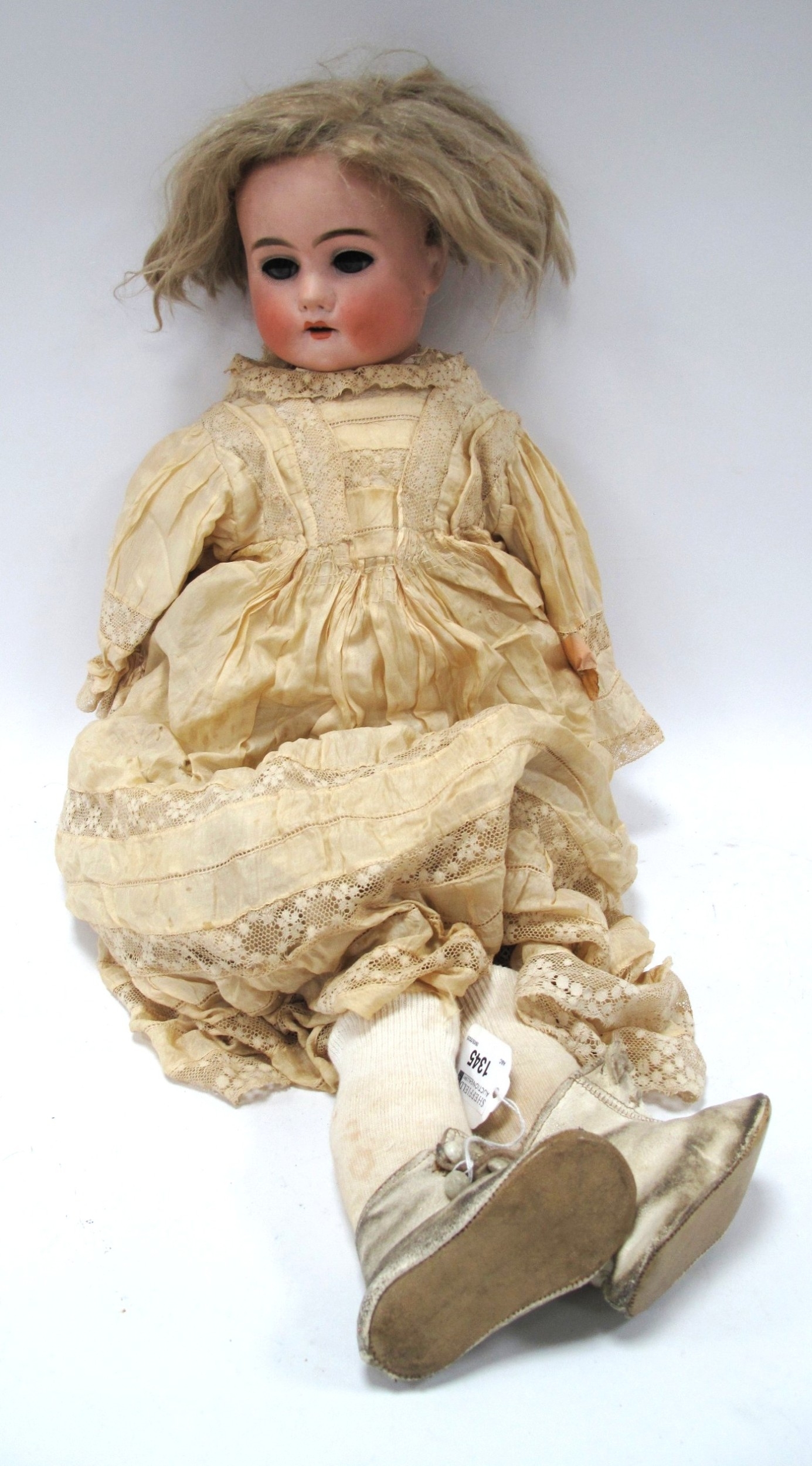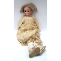 H..S German Pottery Headed Doll, circa 1900, 'Victoria' with movable eyes, composition limbs and period clothing, approximately 60cm high.