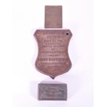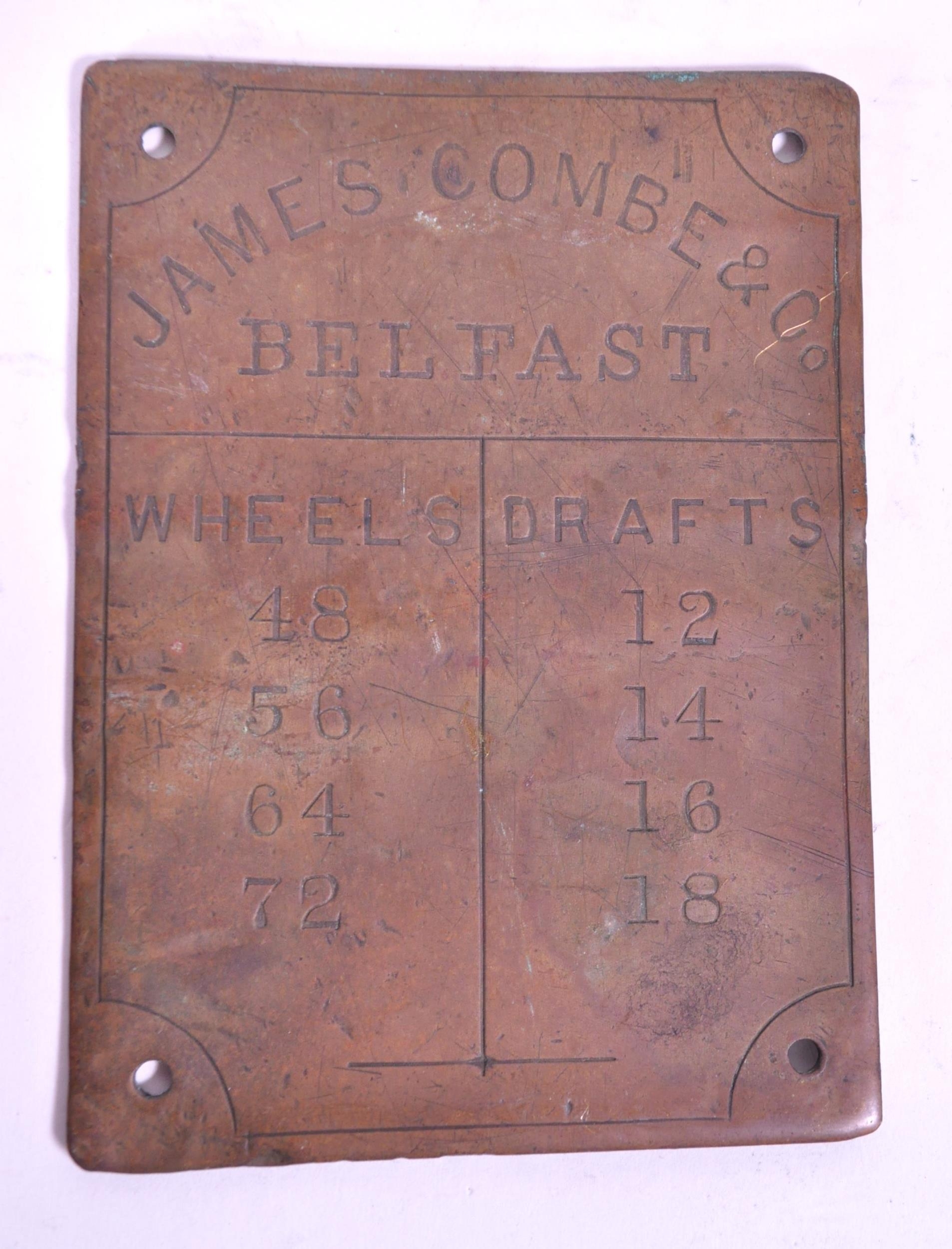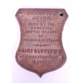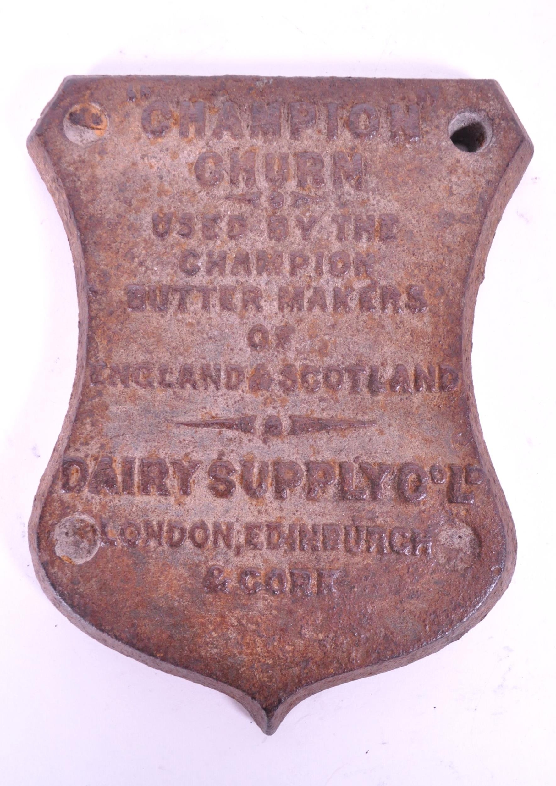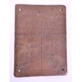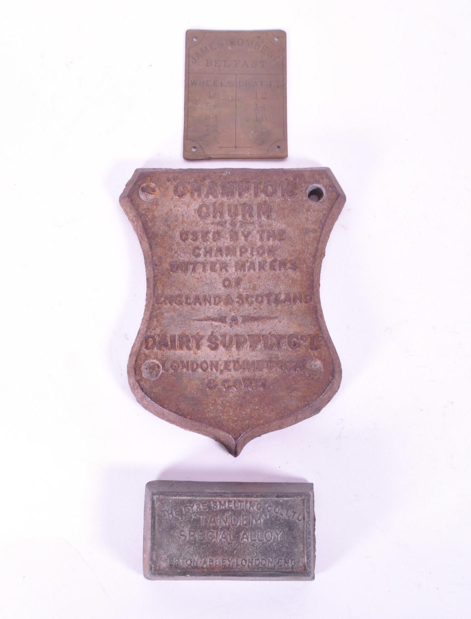 Three late 19th / early 20th century metal plaques, comprised of a Champion Churn Dairy Supply Co Ltd cast iron plaque, The Eyre Smelting Co Ltd Tandem Special Alloy bar and a James Combe & Co Belfast brass plaque. Largest measuring approx. 19cm x 15.5cm.