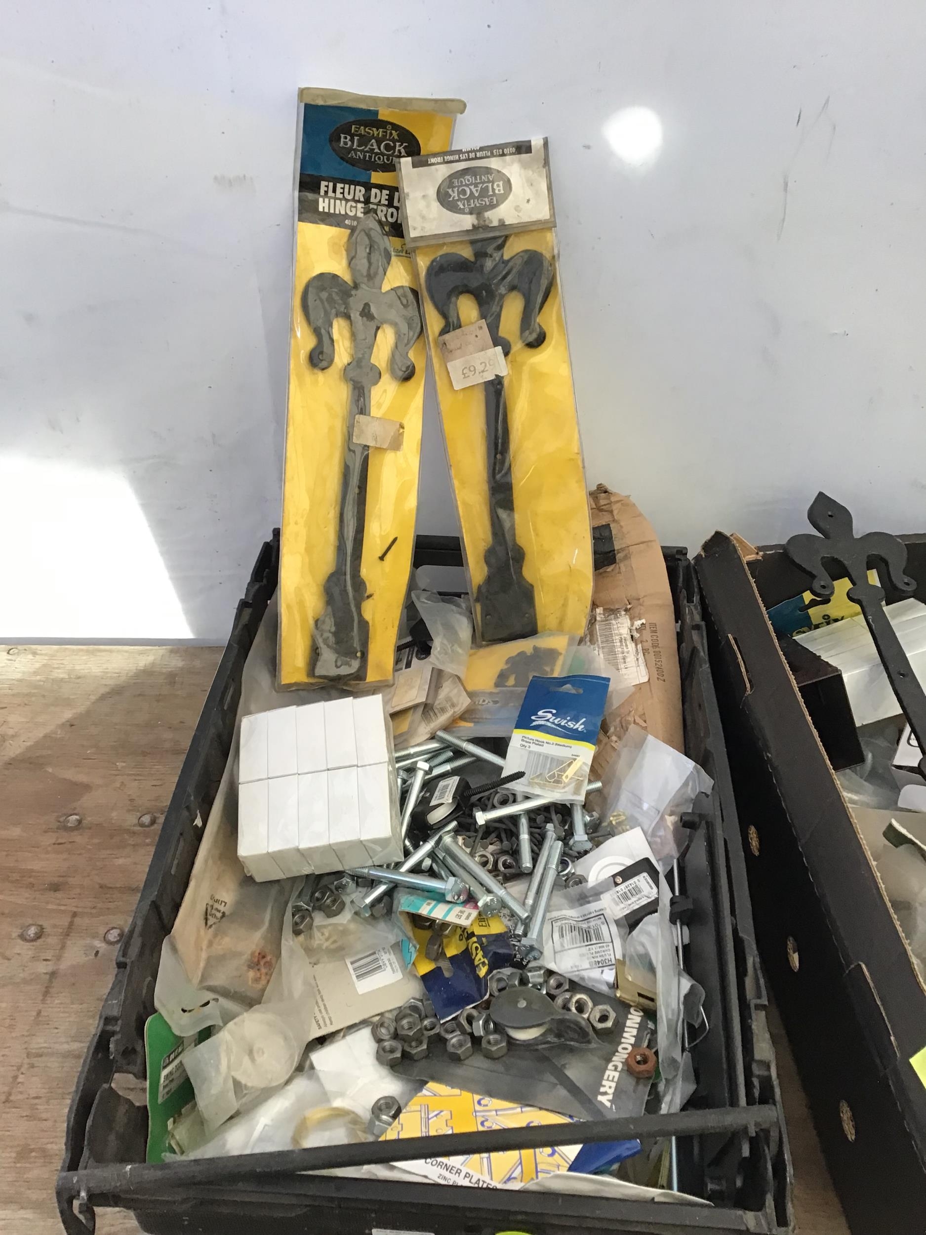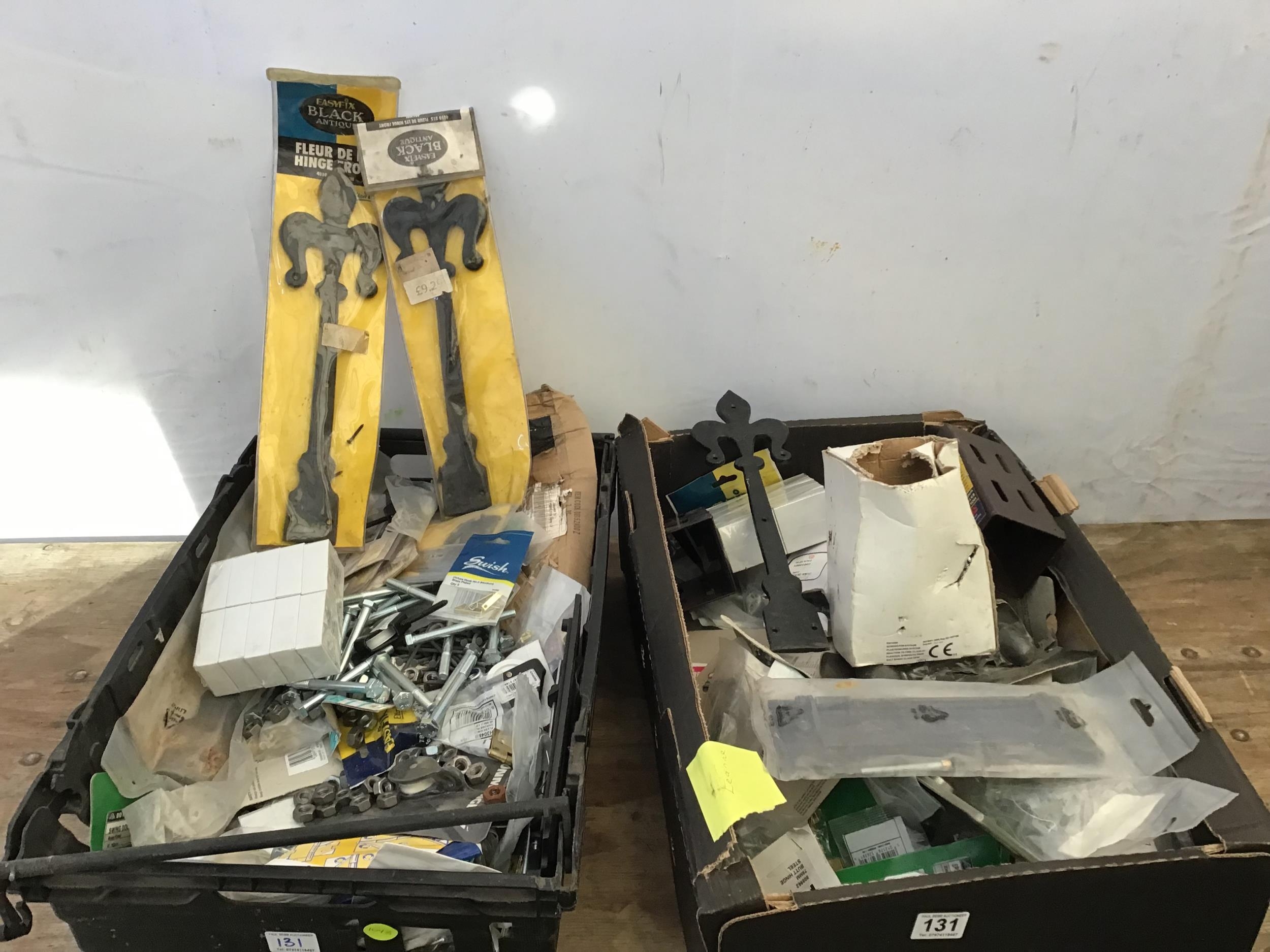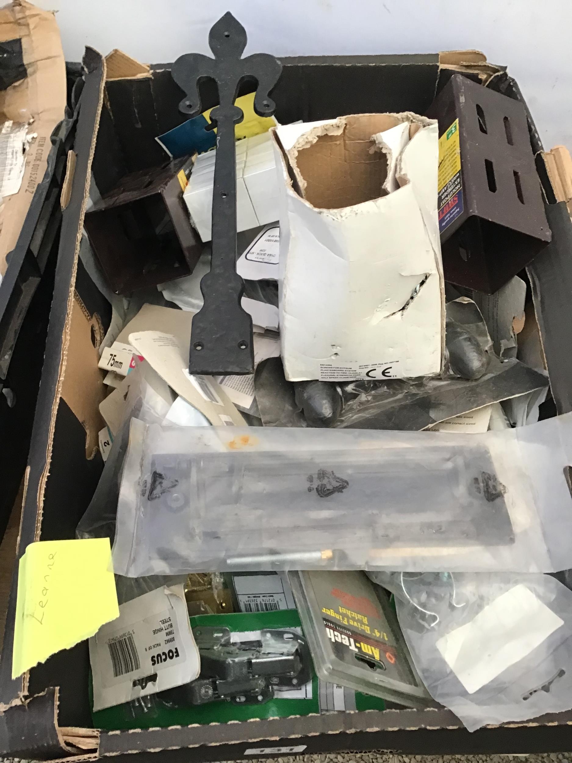 2 BOXES OF HARDWARE TO INCLUDE ELECTRIC WIRE CLIPS HINGES SCREWS ETC