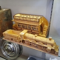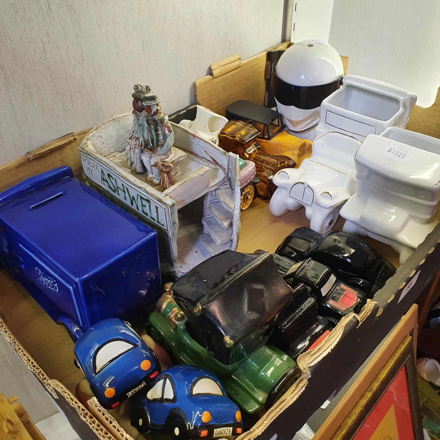 Assorted ceramic and other model vehicles, a Stig helmet clock, a locomotive model, constructed from matches, 57 cm, and a similar tram, 43 cm