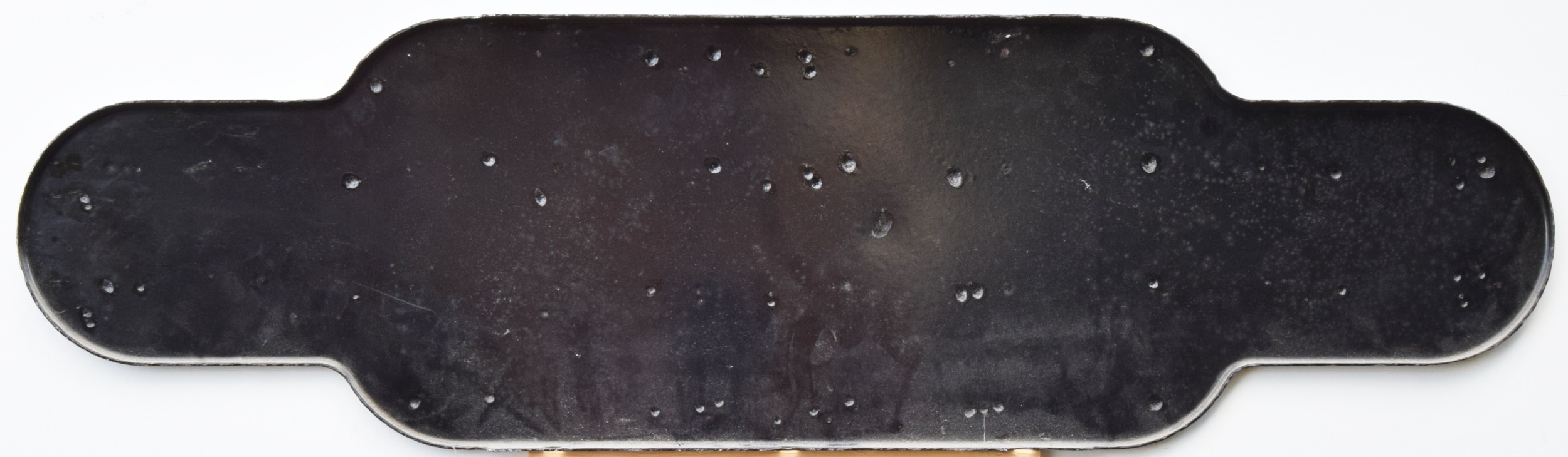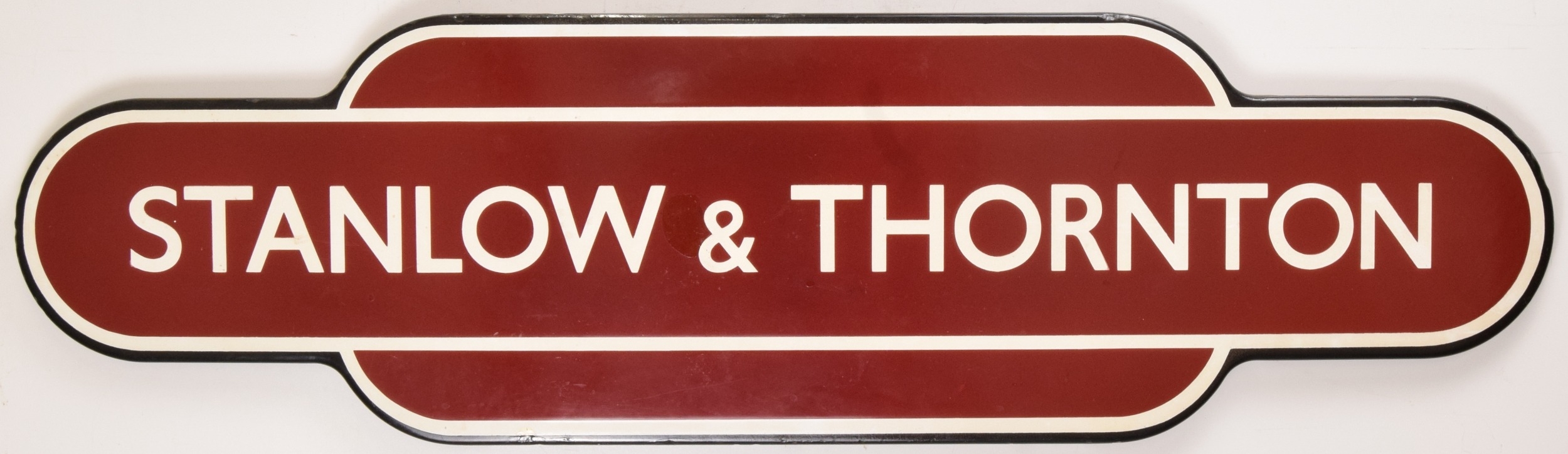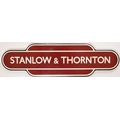 British Railways, Midland Region totem, STANLOW & THORNTON, from the Cheshire location on the Hooton to Helsby line. Some edge touch ups and a some face touch ups, the largest is left of the ampersand, good colour and minor gloss loss, 36 x 10 inches. Shipping band - D.
