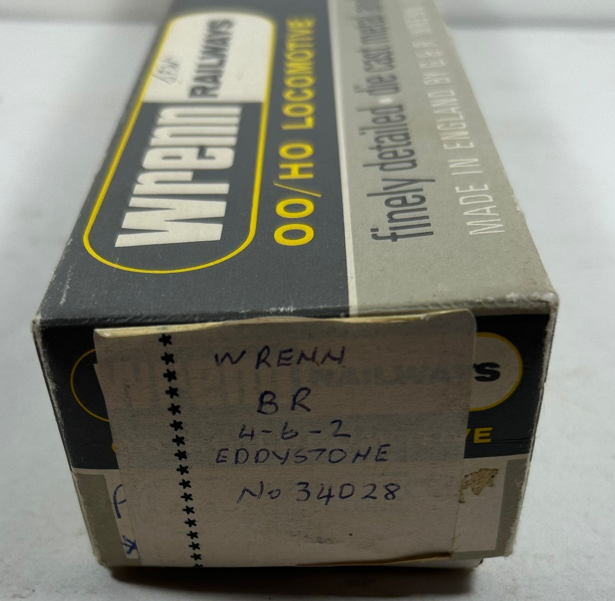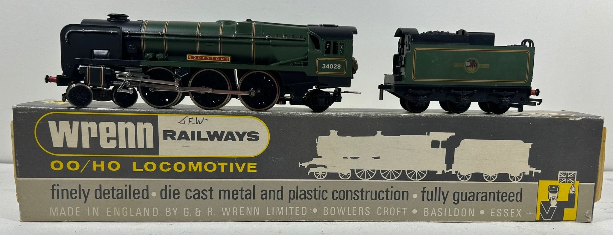 Wrenn Railways OO Locomotive. A BR rebuilt West Country Class 4-6-2 tender locomotive Eddystone 34028. In lined Brunswick Green livery. Boxed, associated. Contents. VGC minor blemish/wear.