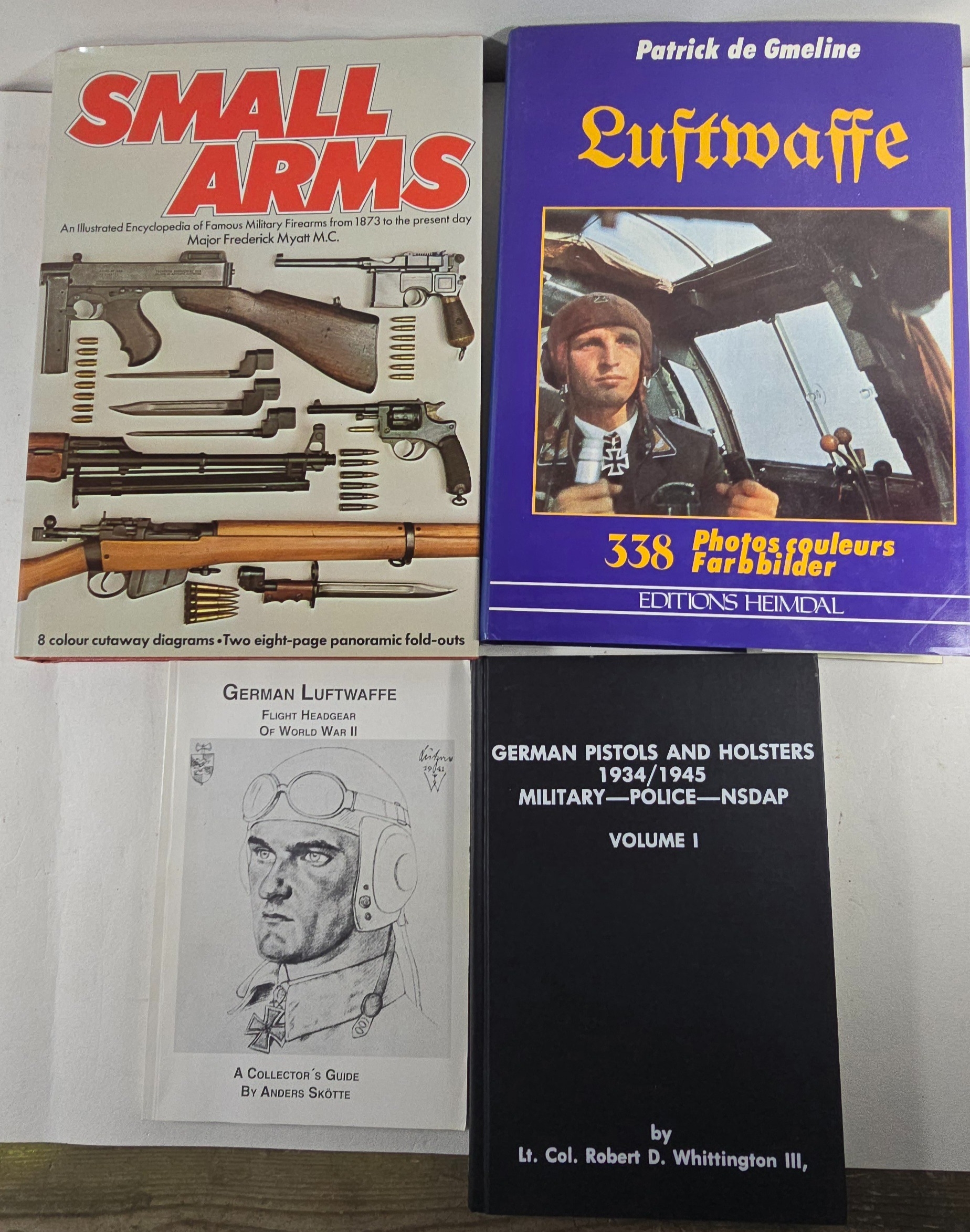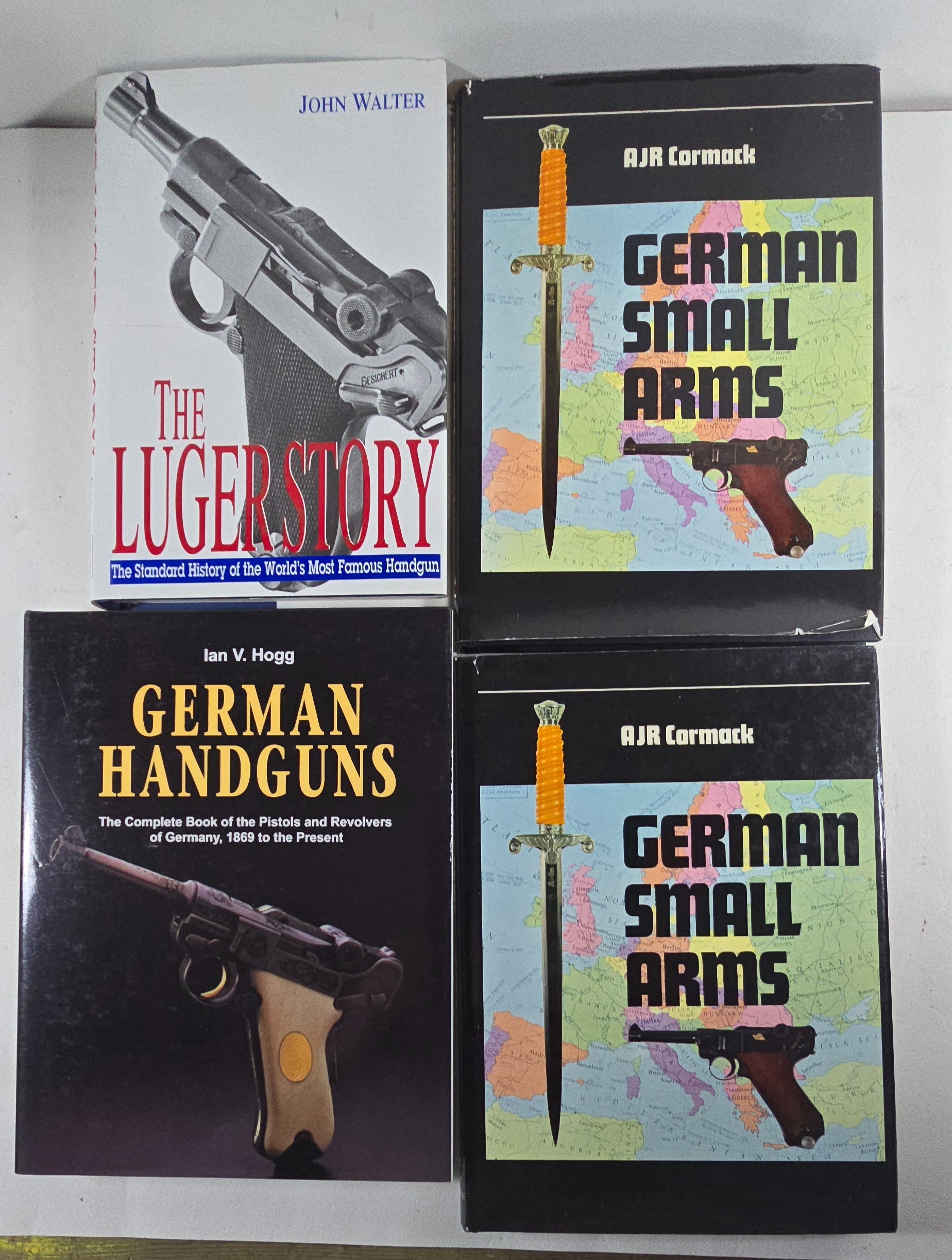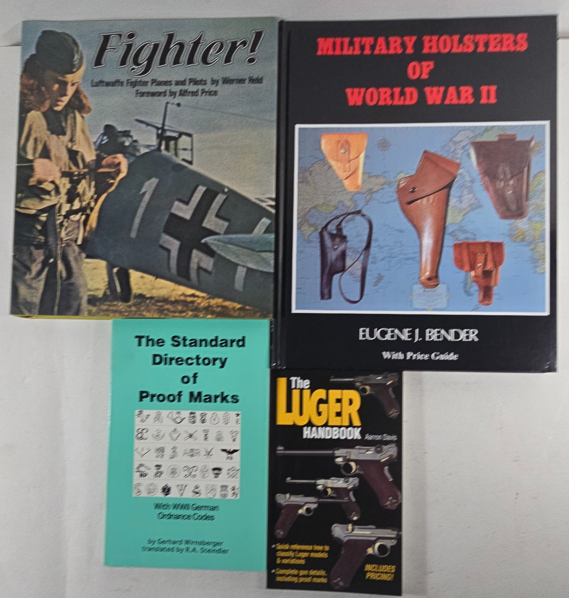 Military Holsters of WW2, E. Bender; Fighter, Luftwaffe Fighter Planes etc. W. Held; Luftwaffe, P. de Gmeline; Small Arms, F Myatt M.C.; The Luger Story, J Walter; German Handguns, I. Hogg; German Small Arms, A Cormack (2 copies); all with D.W’s, and 4 further related titles including 3 with soft covers. Average Good condition.