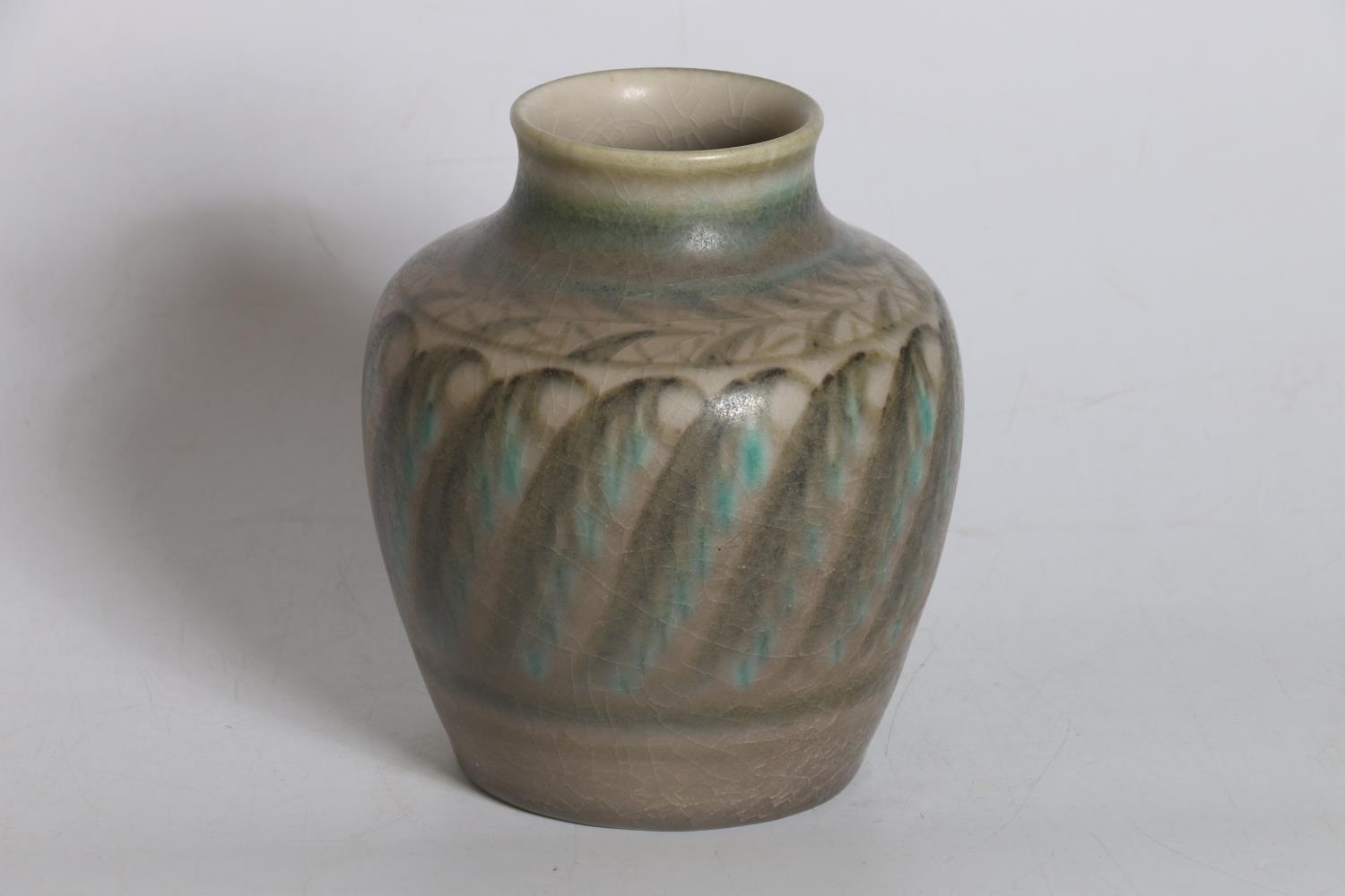 Pilkington's Royal Lancastrian vase, #2922, 'R' in shield monogram for Gladys Rogers, 15cm tall.