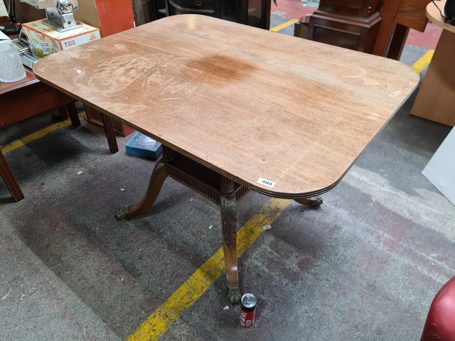 Lovely pod table in mahogany, foliage carved legs and brass lion claw feet, with an ornate carved pineapple on the shelf. Looks great from the waist down could do with a french polish up top.