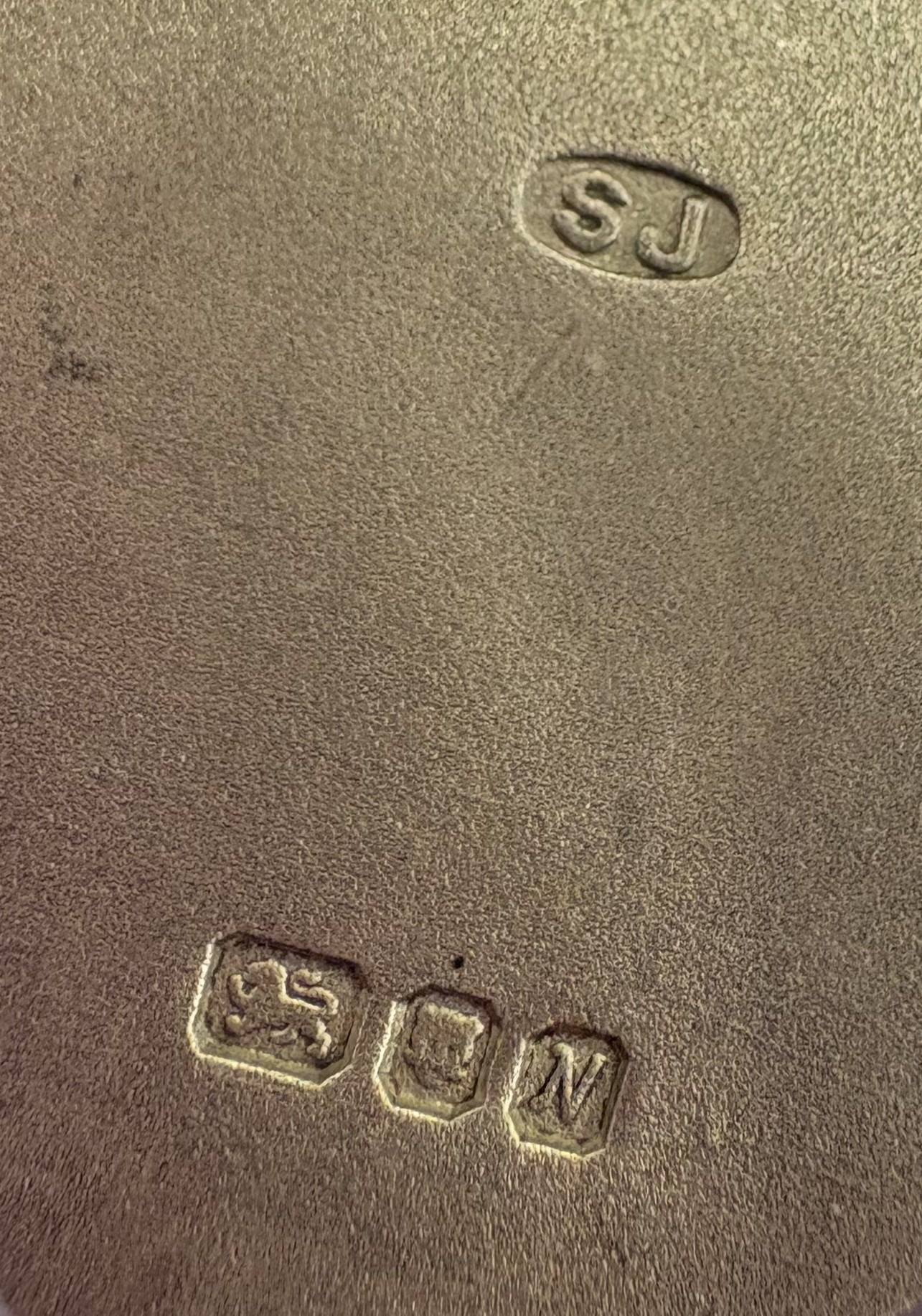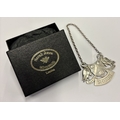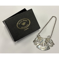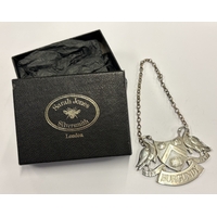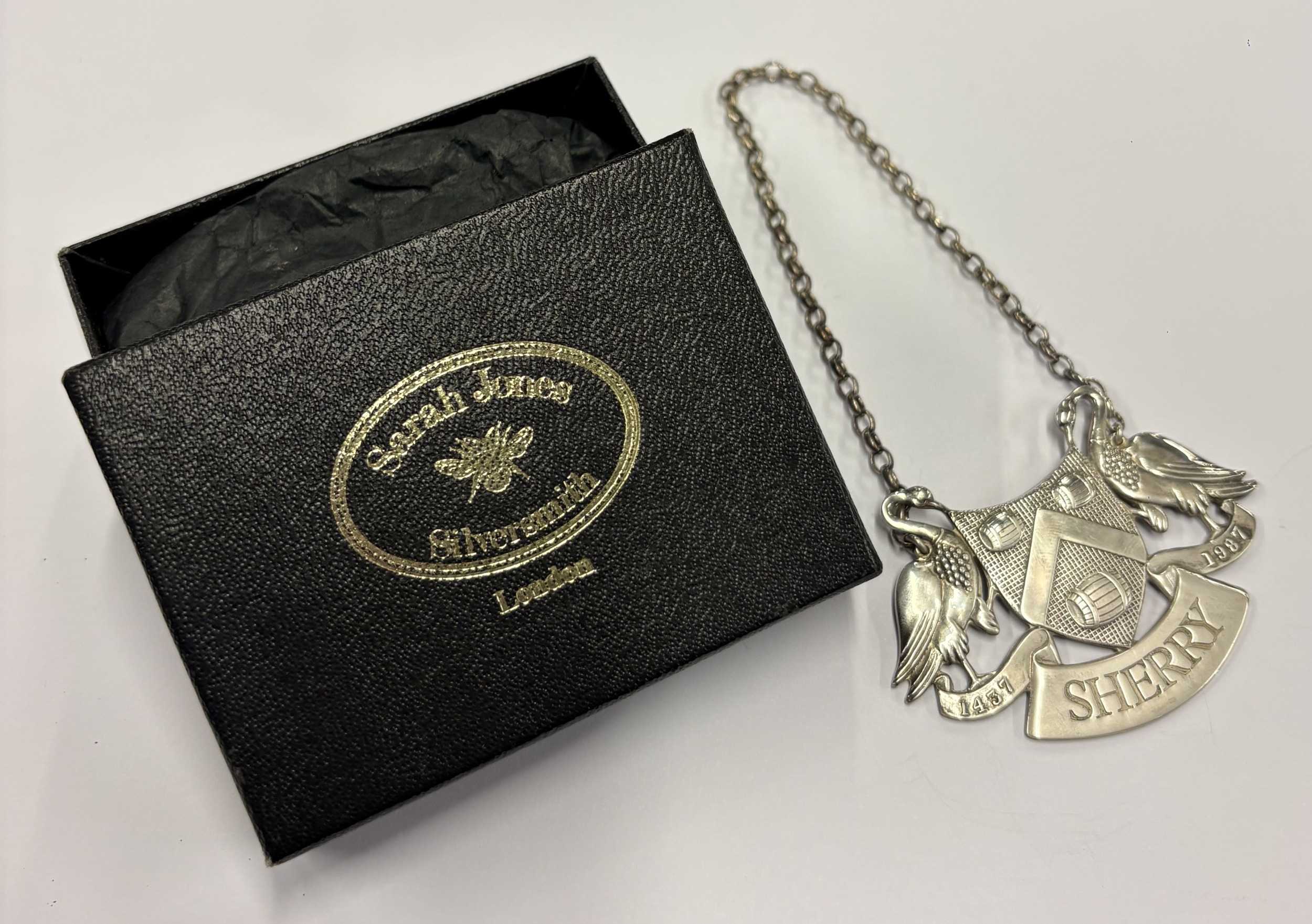 A silver wine label for 'Sherry' decorated with swans and crest, contained within original box. London 1987. By Sarah Jones. Approx. 26 grams. Est. £120 - £150.