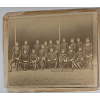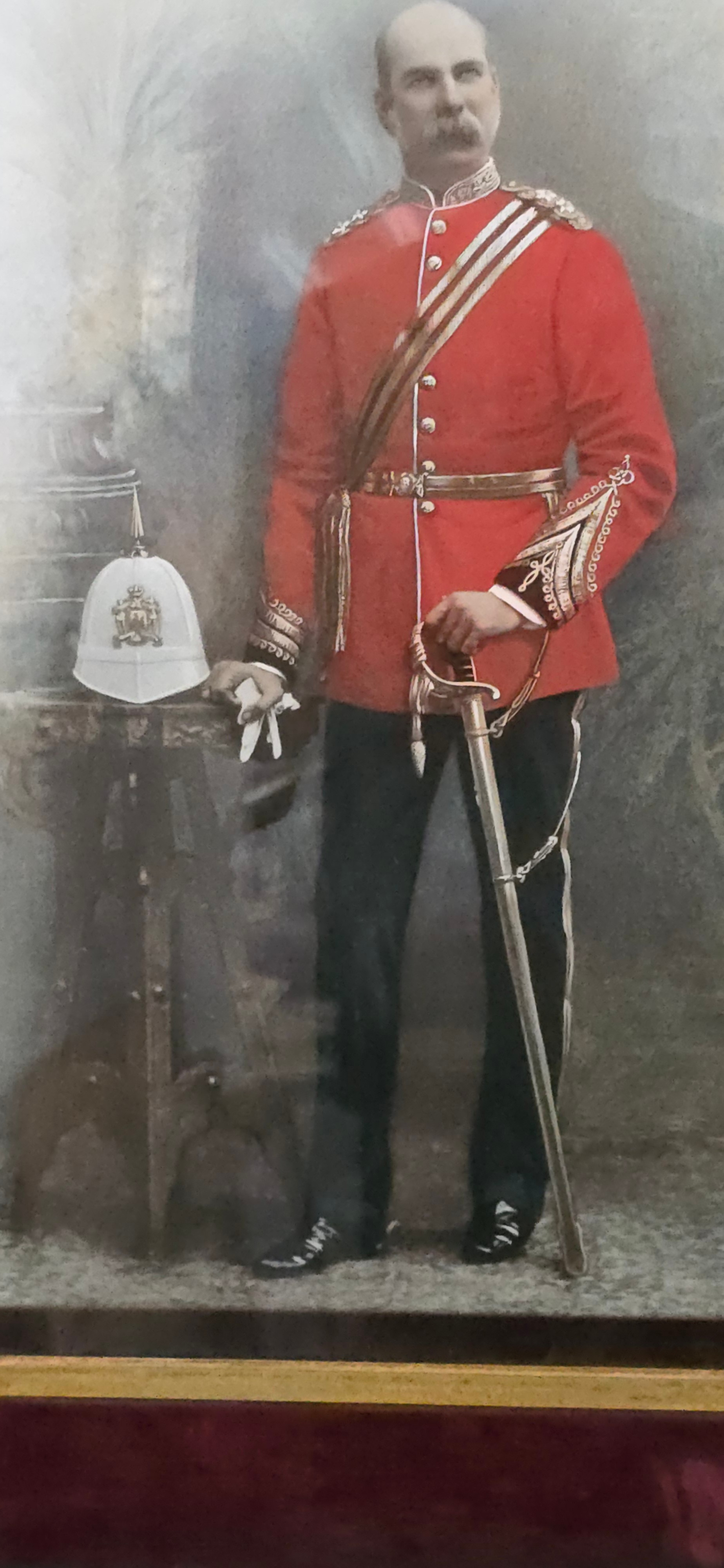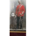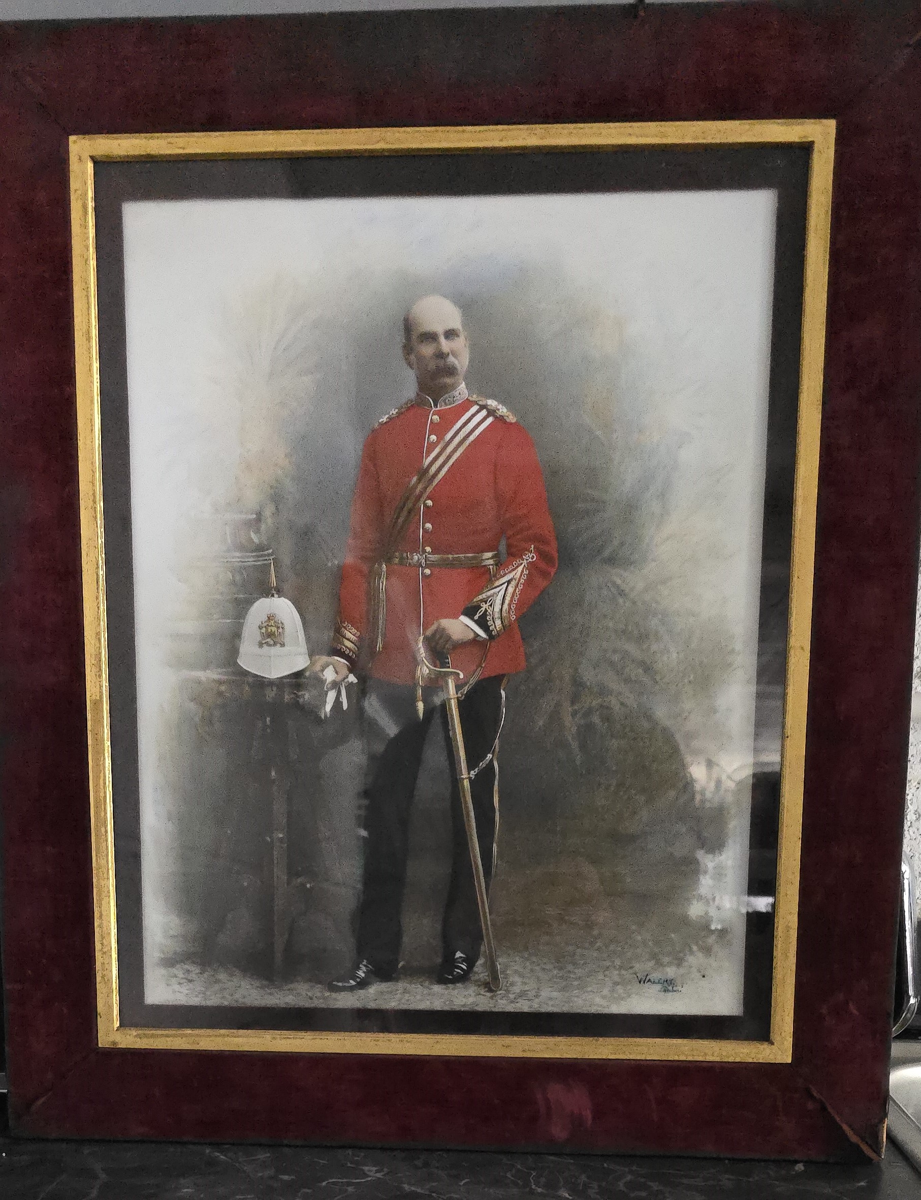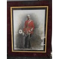 A well executed late nineteenth century hand coloured full length photgraphic portrait of an officer of the Jamaica Militia, with scarlet tunic, sword and white tropical helmet on a table at the side. Signed Walery London, in a free standing glazed frame with velvet surround 27"x23". GC velvet worn. Walery, photographer active 1884-1898, represented in the National Portrait Gallery.