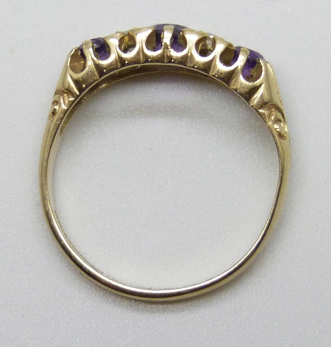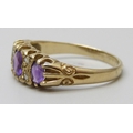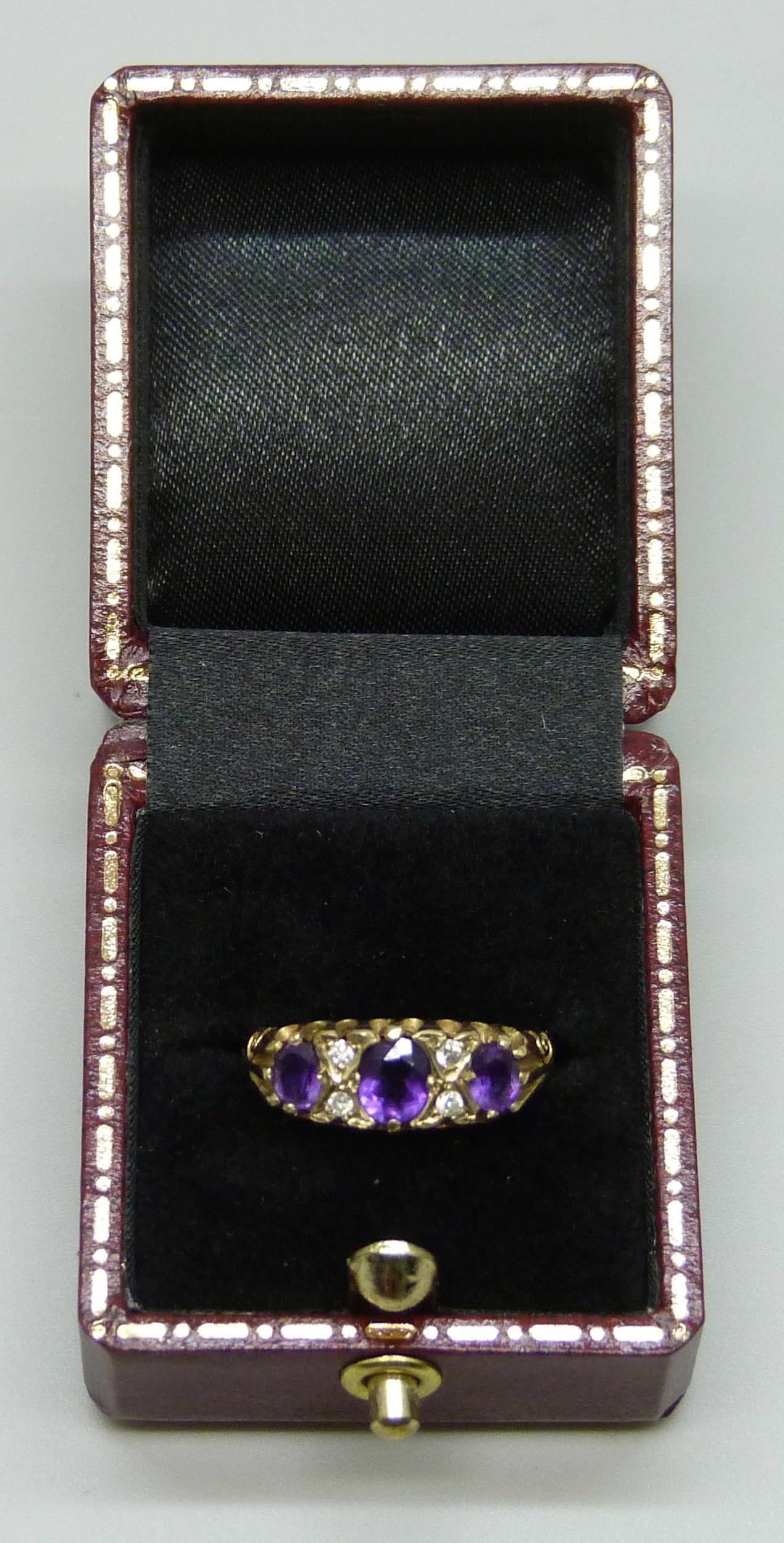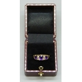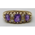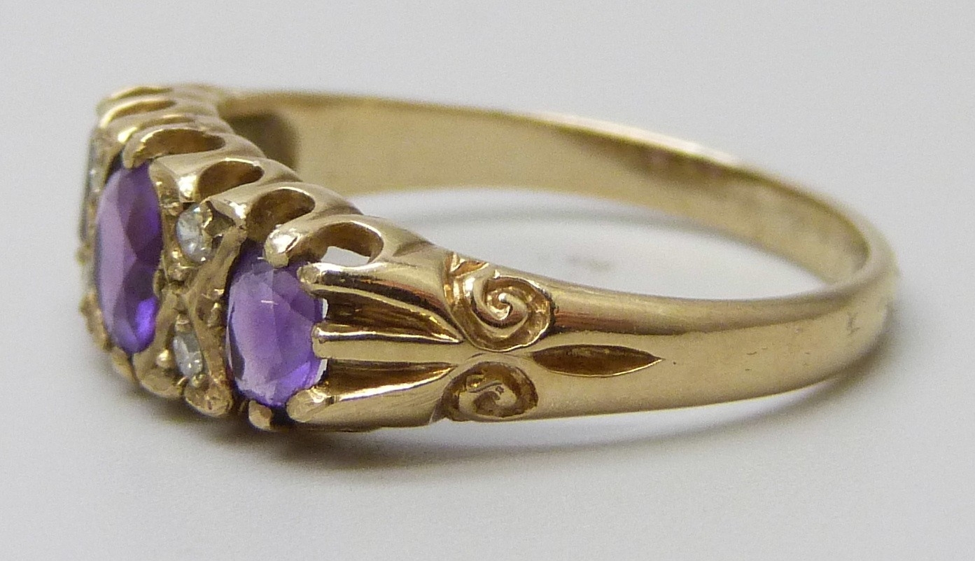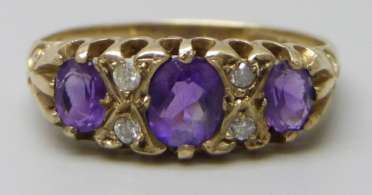 A 9ct gold, amethyst and diamond ring, 2g, M