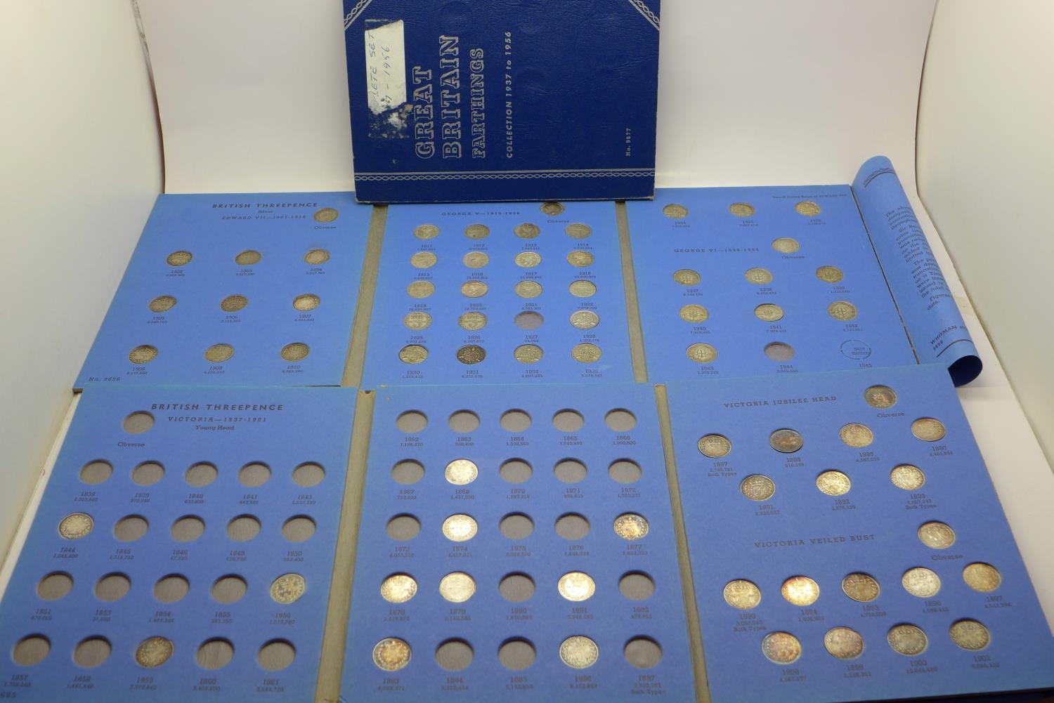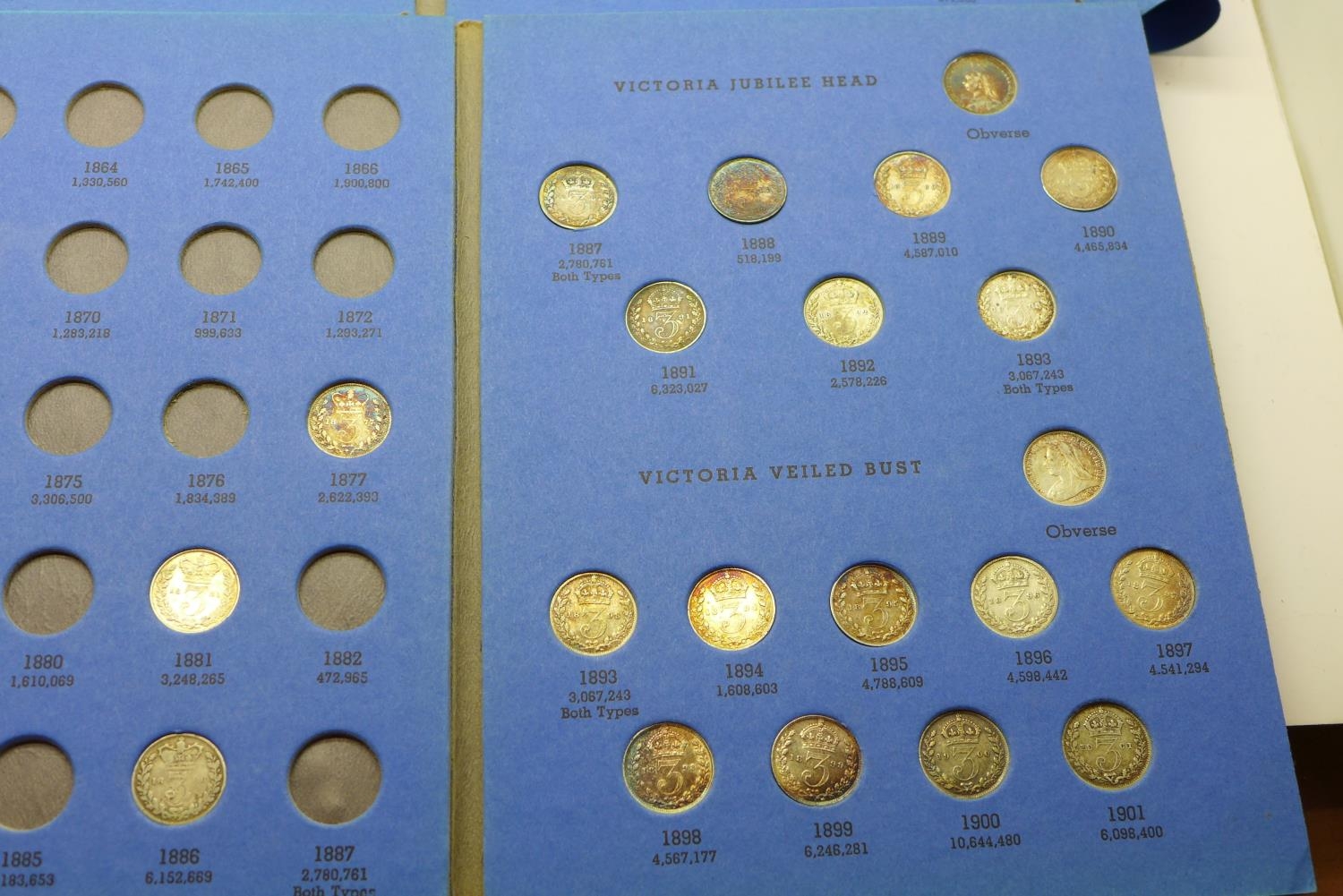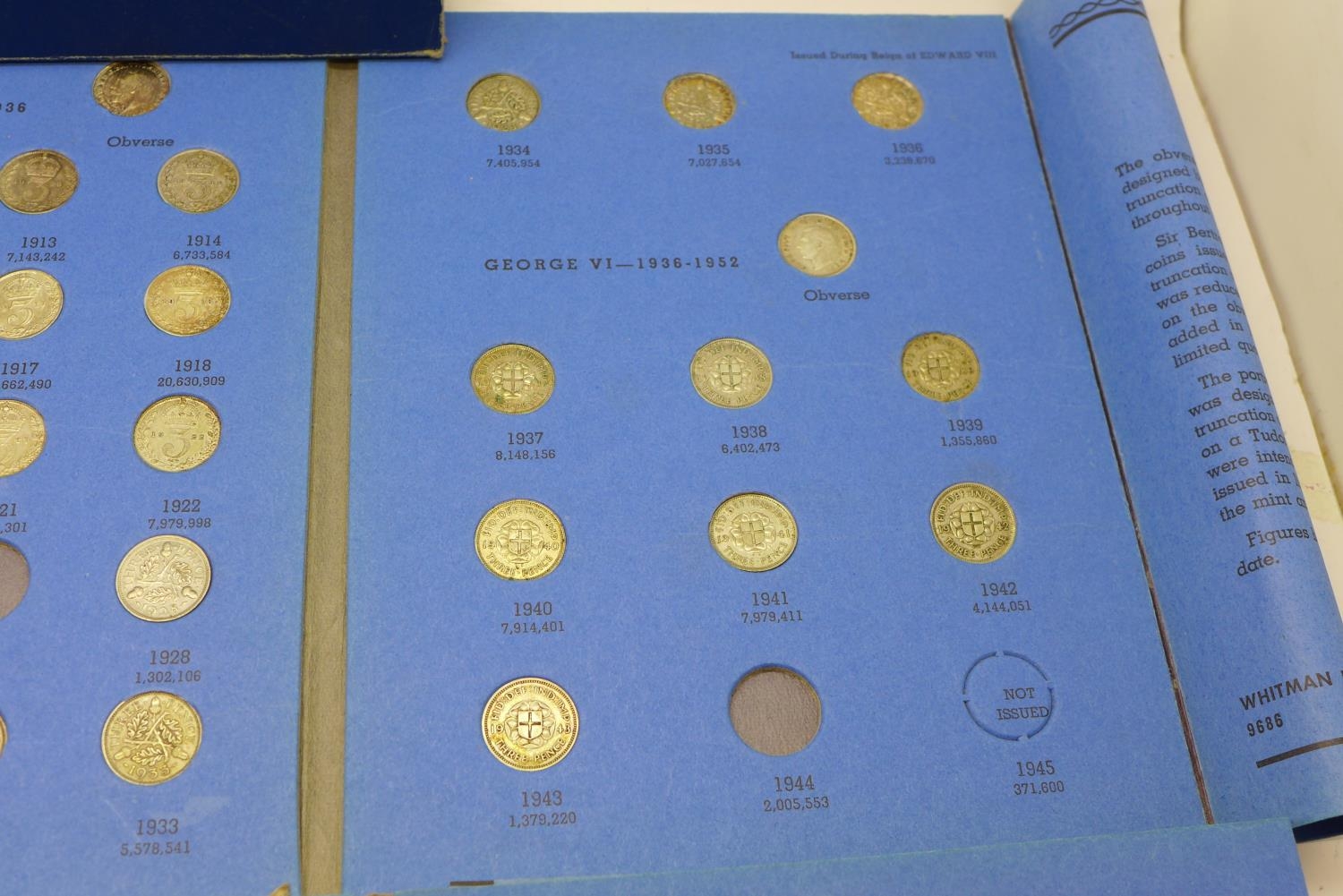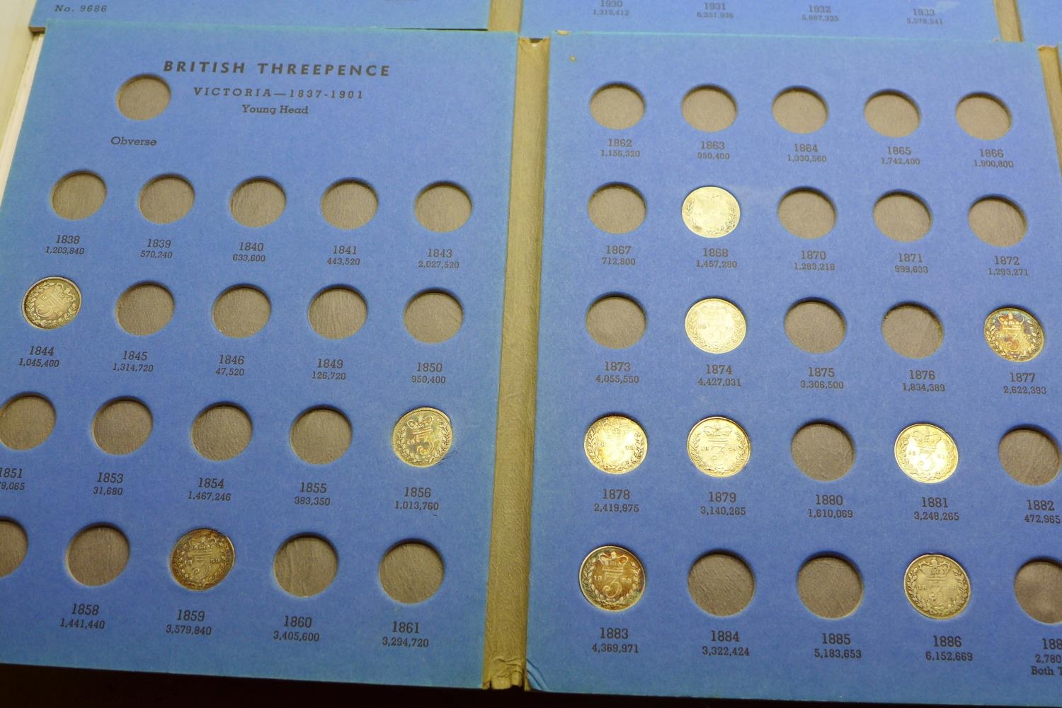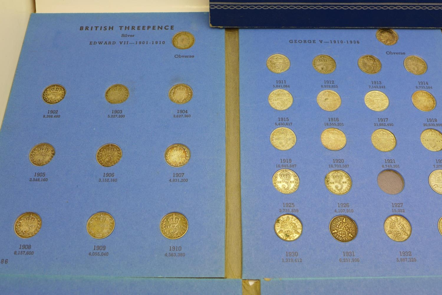 Three coin folders including silver three pence coins, 1902-1945 and 1838-1901, all incomplete