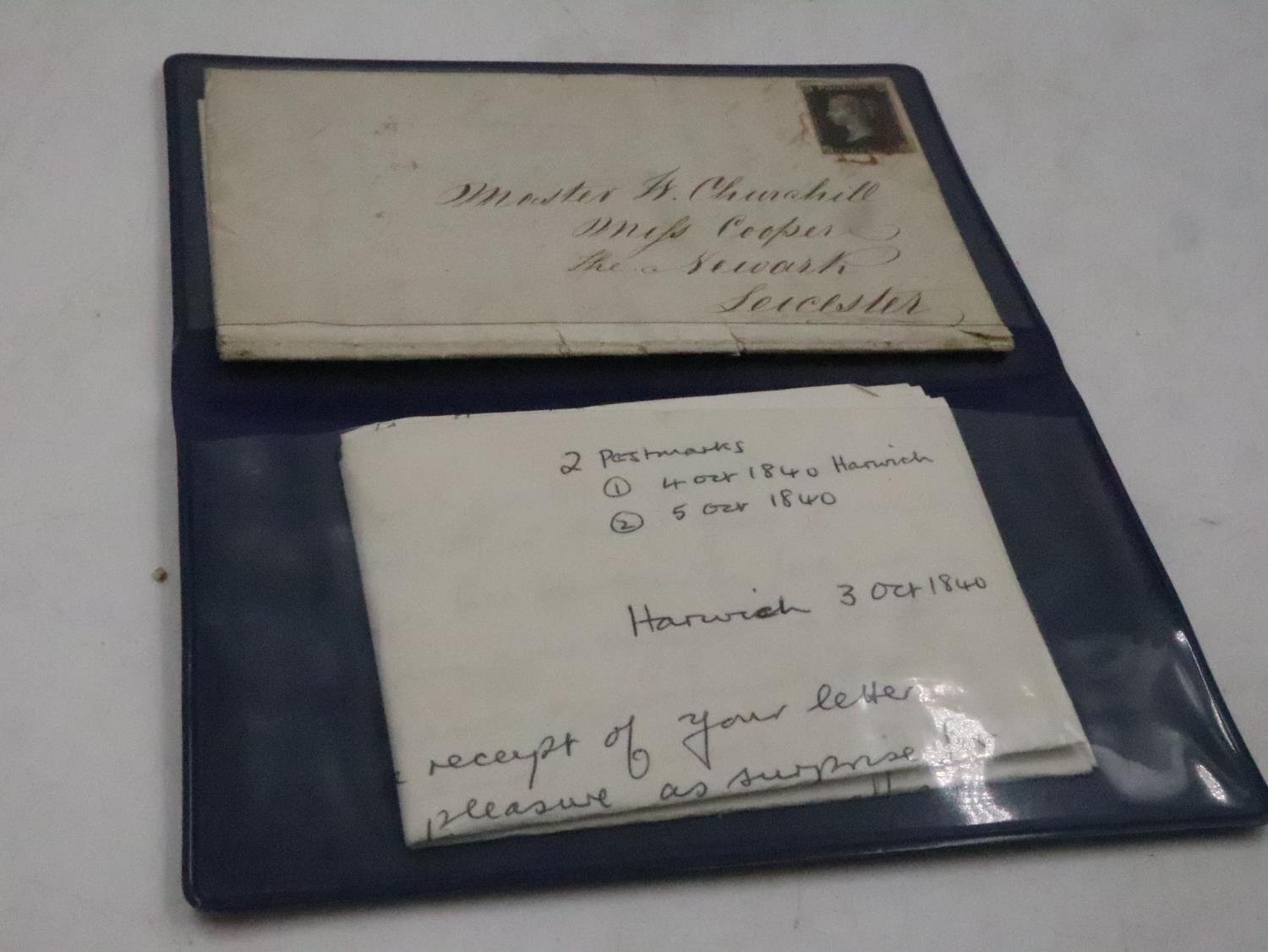 1840 letter and Penny Black stamped envelope to A W Churchill in Leicester, postmarked 4th Oct 1840 Harwich, signed Charles Septimus Miall. UK P&P Group 1 (£16+VAT for the first lot and £2+VAT for subsequent lots)