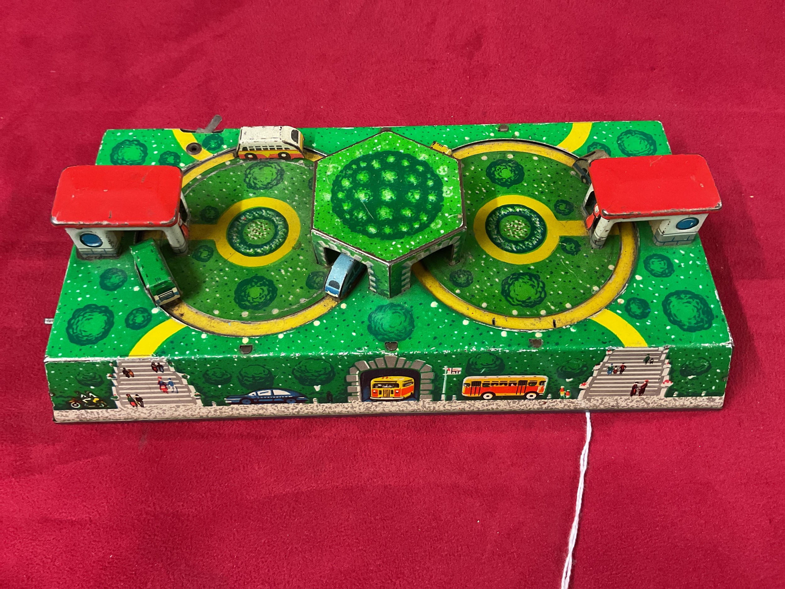A vintage 1950's Abtotpacca tin wind up toy depicting a bus depot