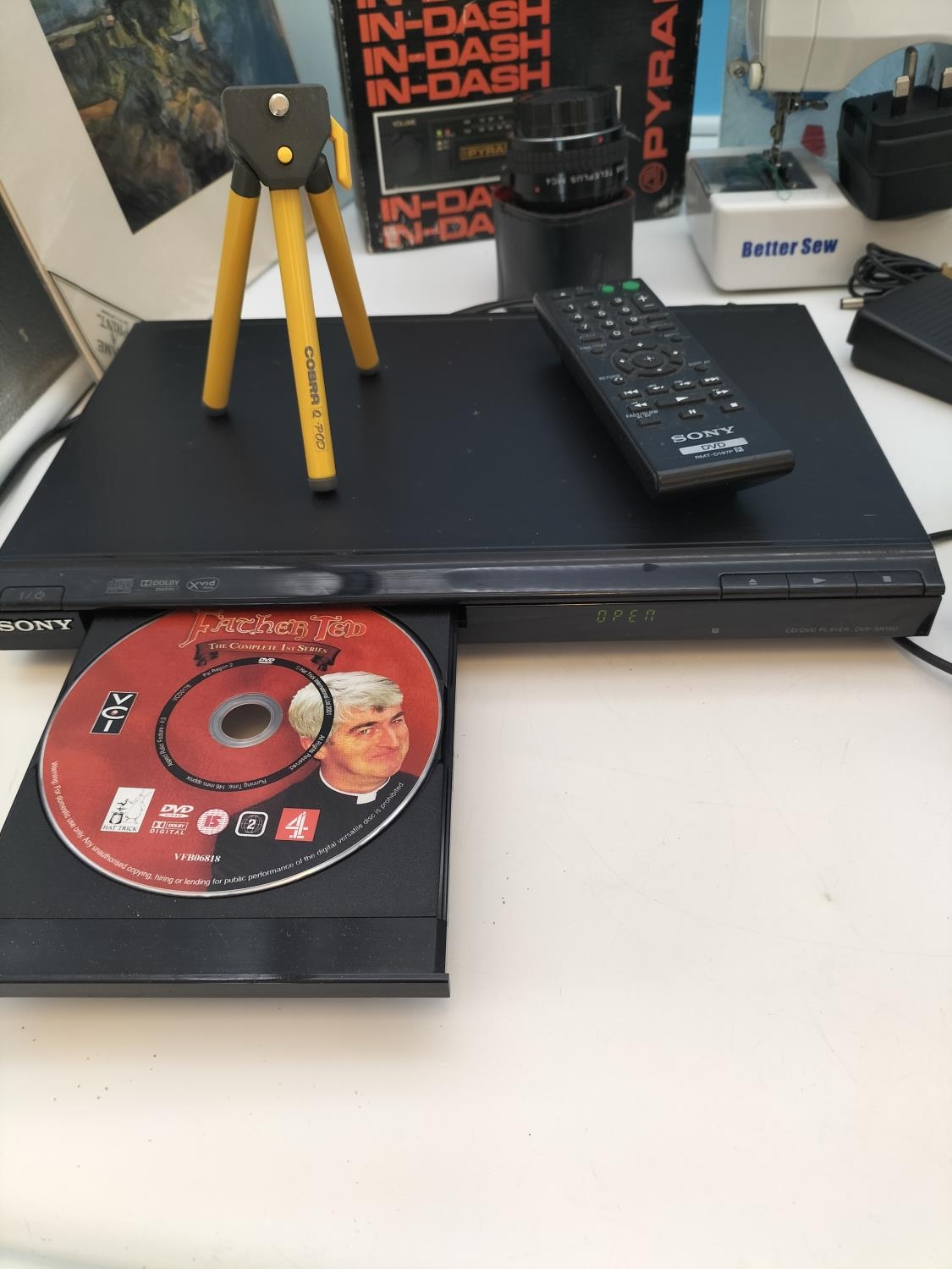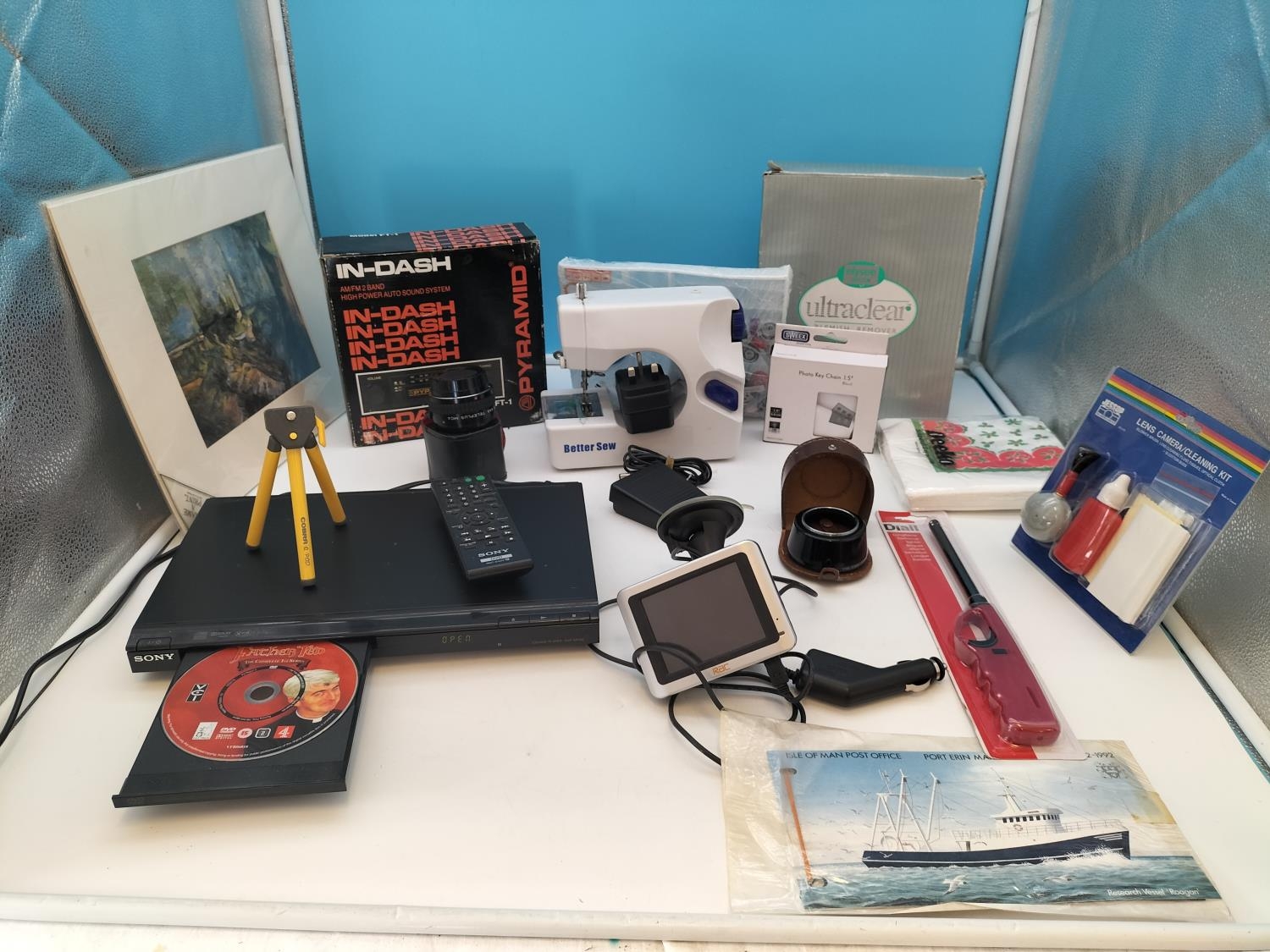 Box of Mixed Items to include Sony DVD Player (W/O), Long Flame BBQ Lighter, New Mini Sewing Machine, etc.