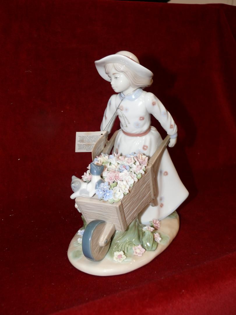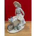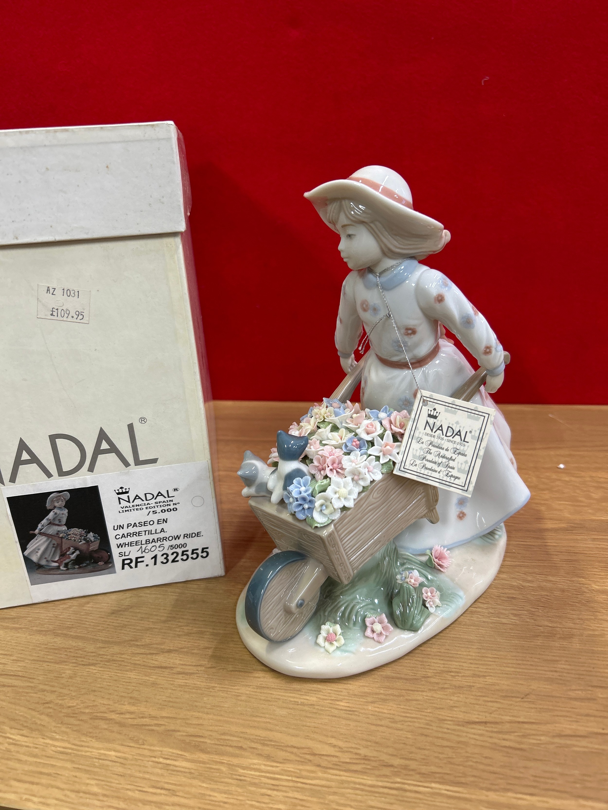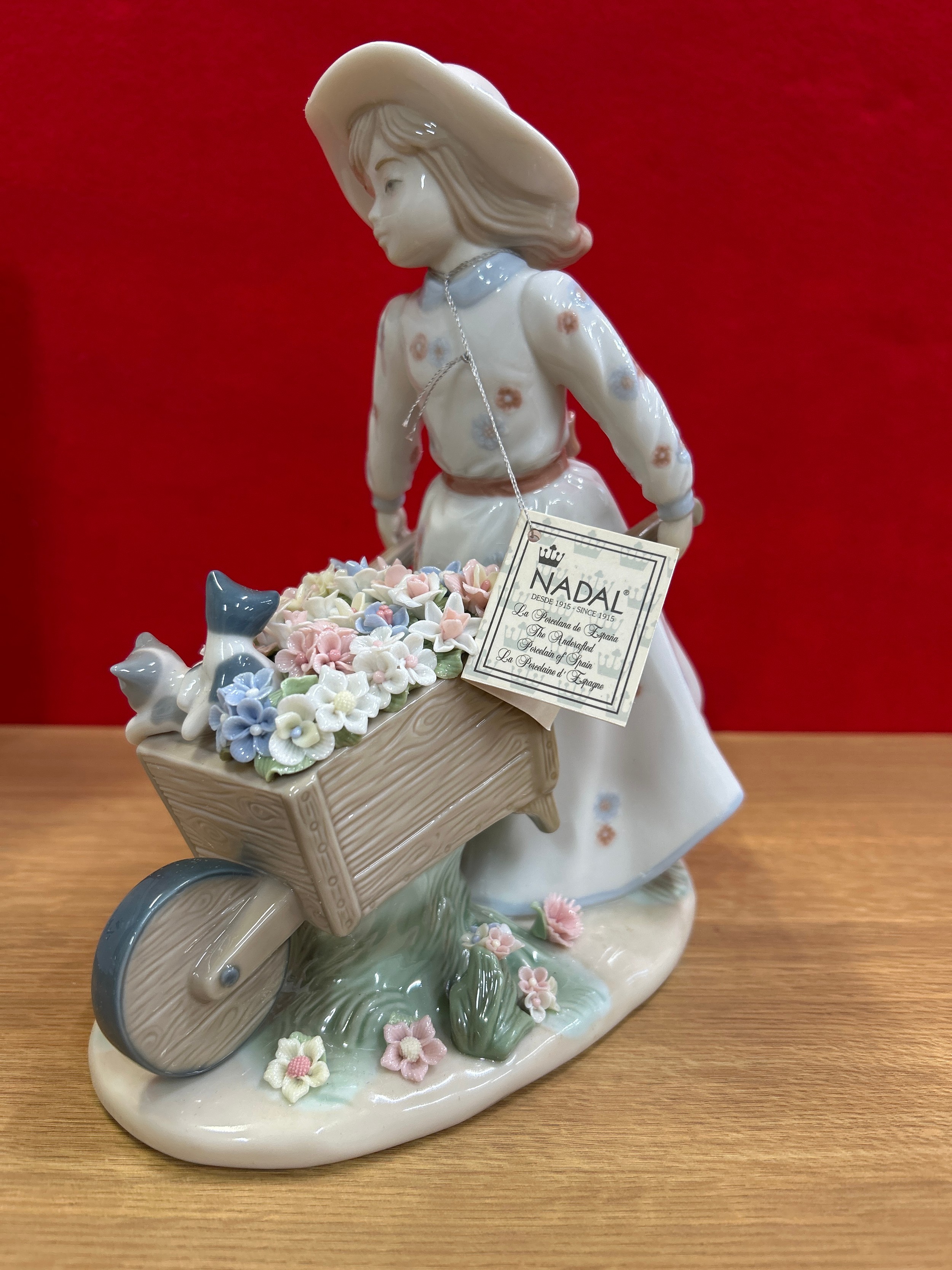 Nadal Spanish porcelain figurine of a girl pushing a wheelbarrow, new with box and packaging