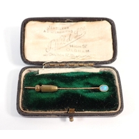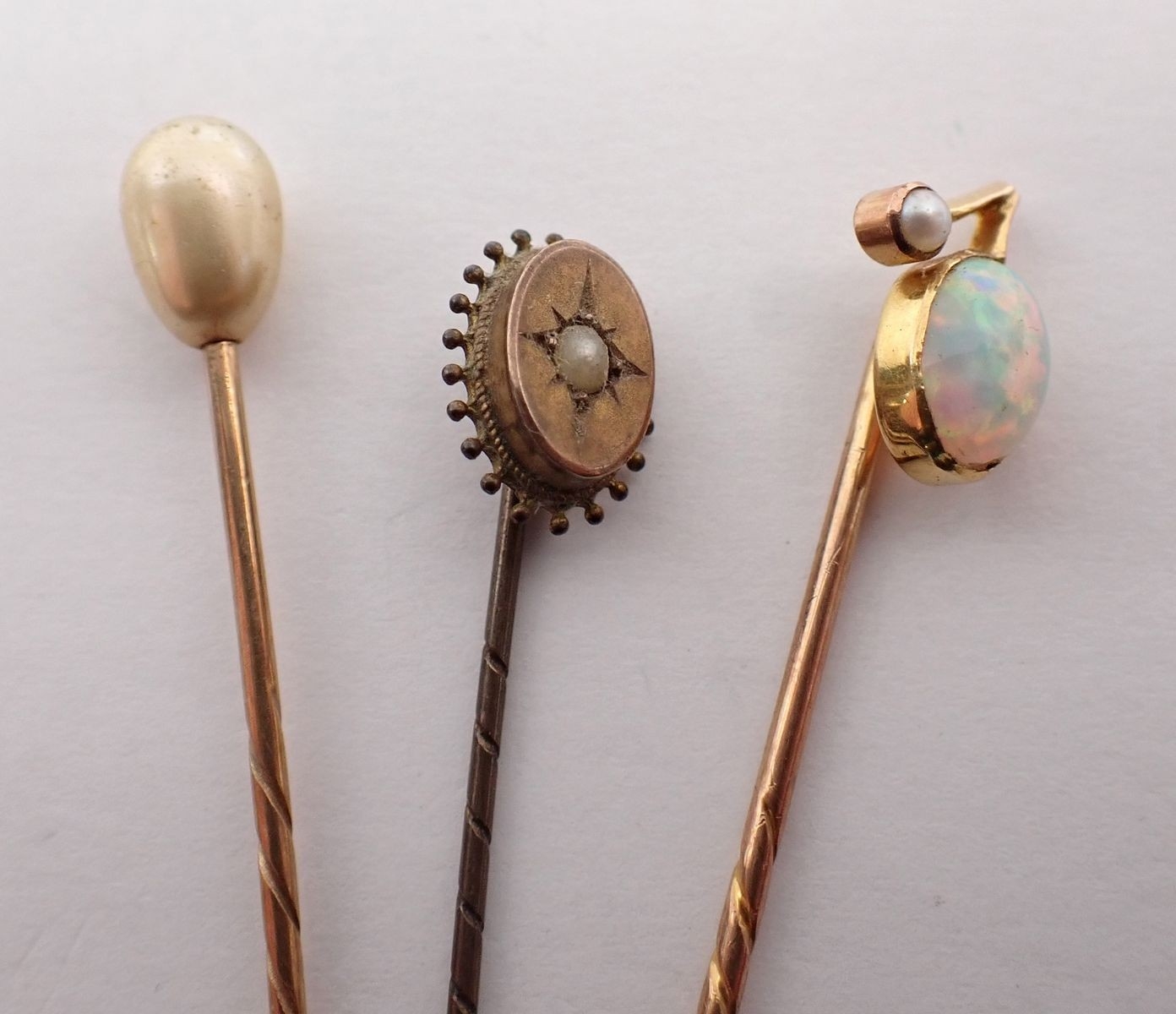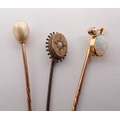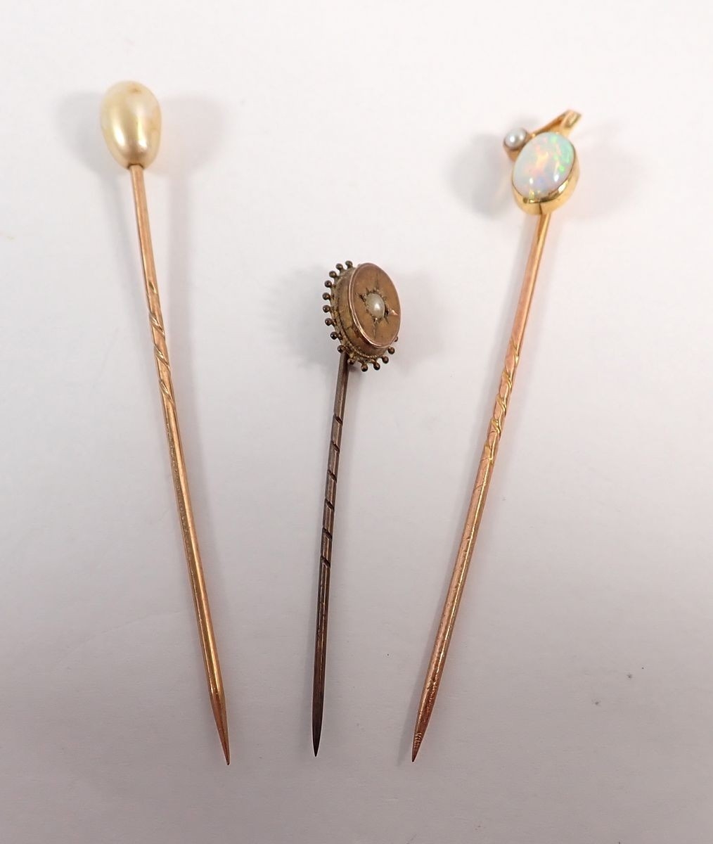 A gold opal and pearl stick pin, a 9 carat gold stick pin and one other unmarked, total 4g