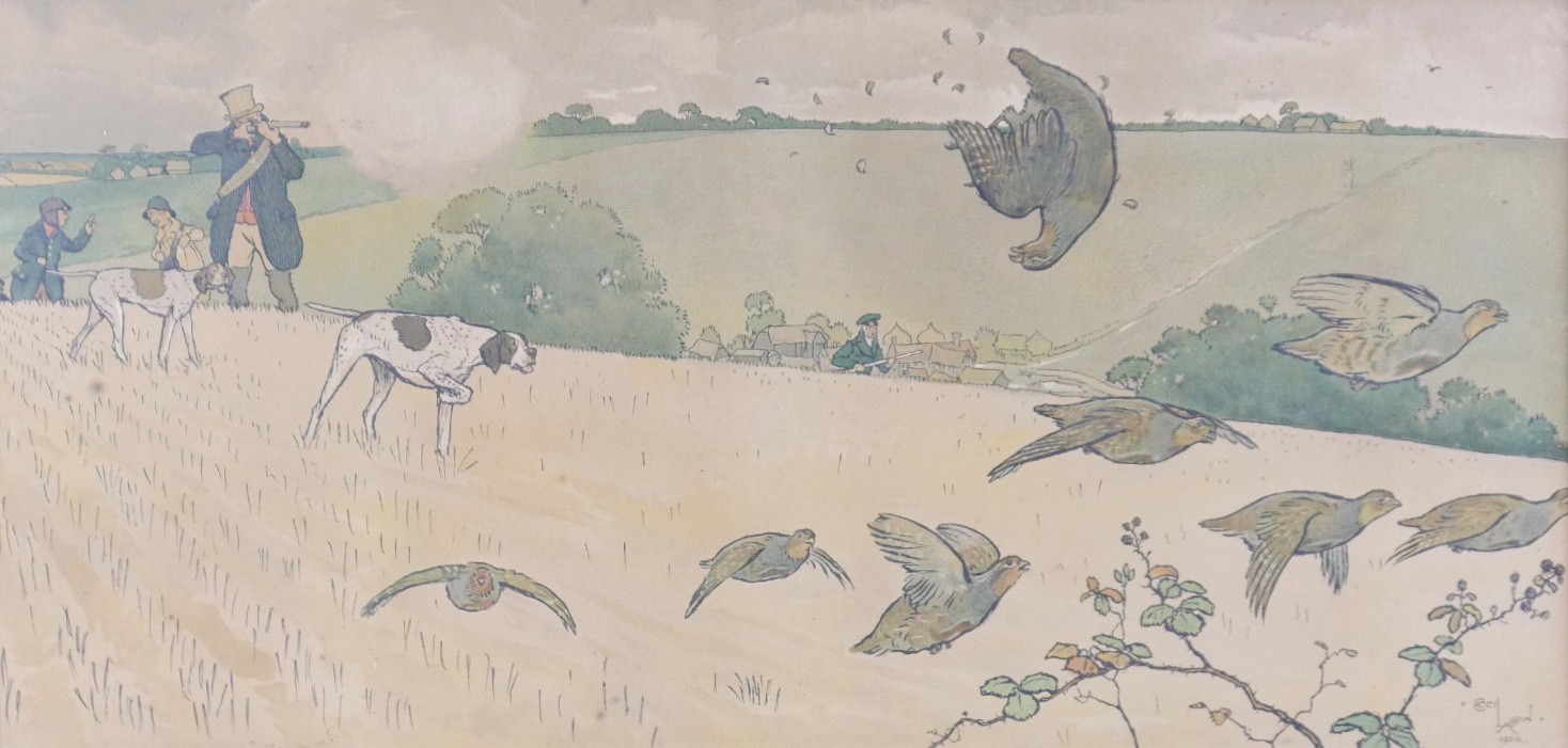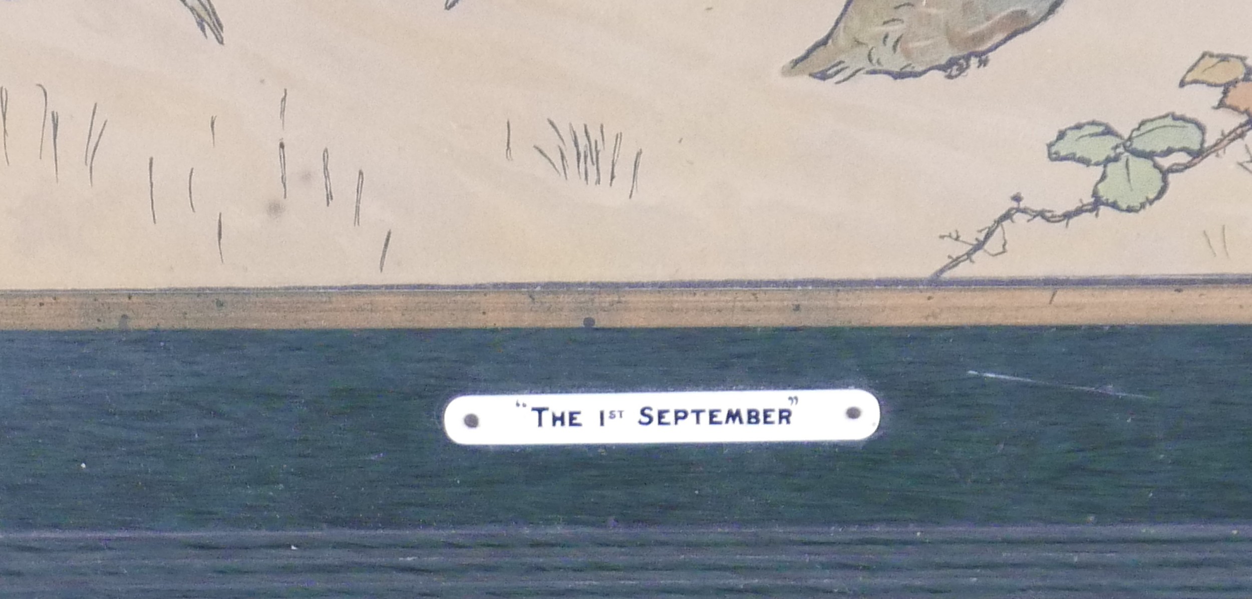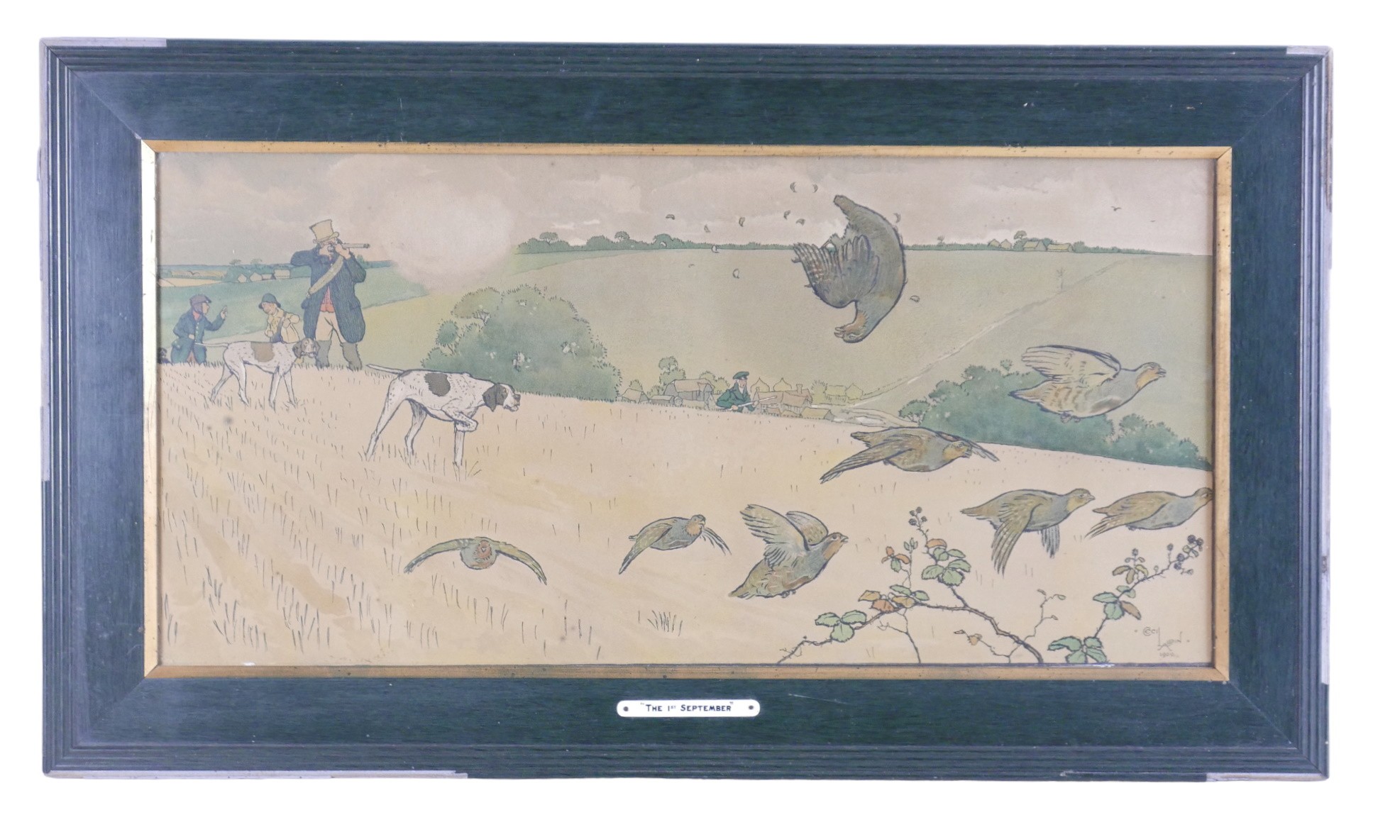 After Cecil Aldin (1870-1935): '1st September' print, 29.5 by 60.5cm, with handwritten label verso 'A contribution to the gun room from Edmund...', glazed and framed, 42.5 by 74cm.