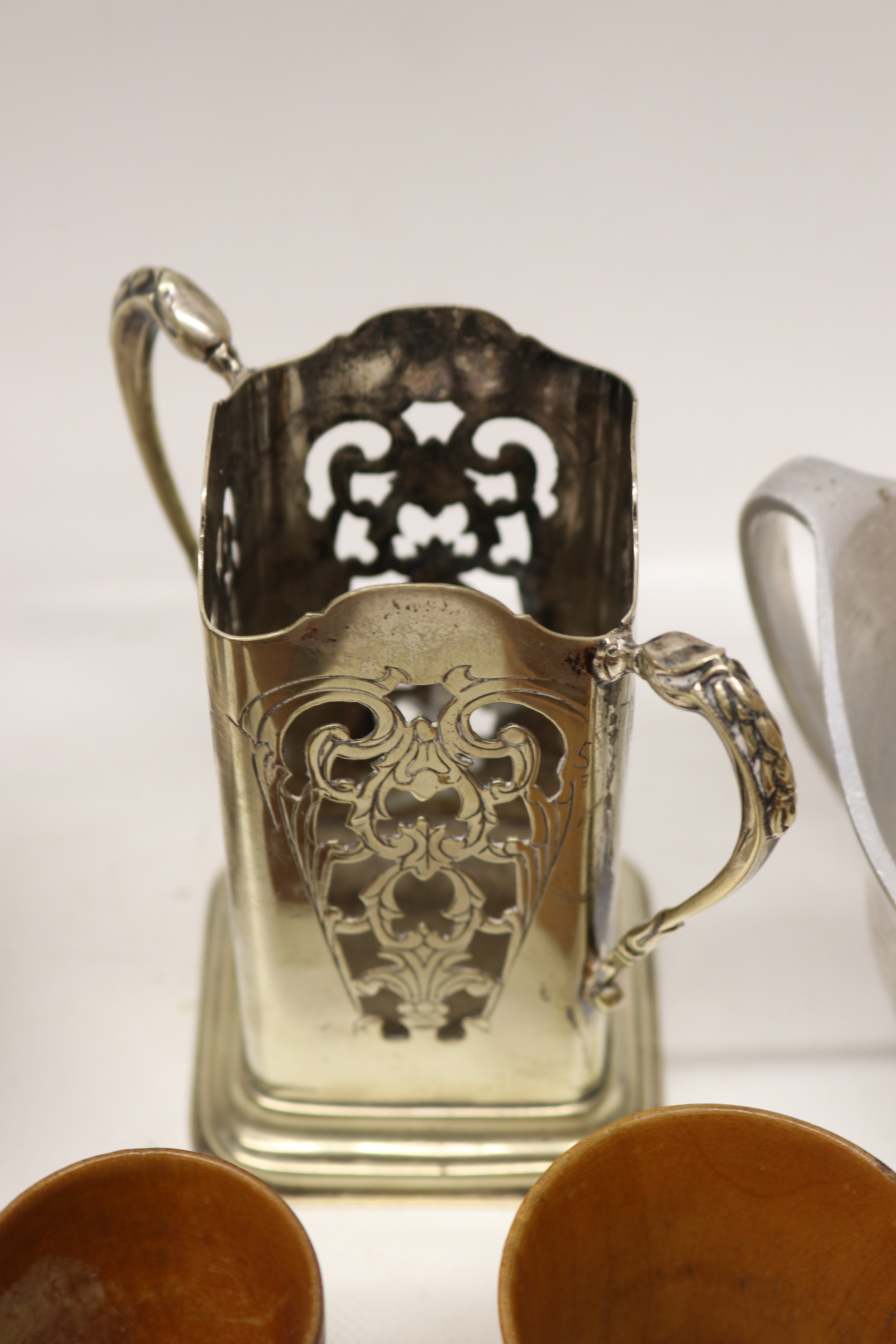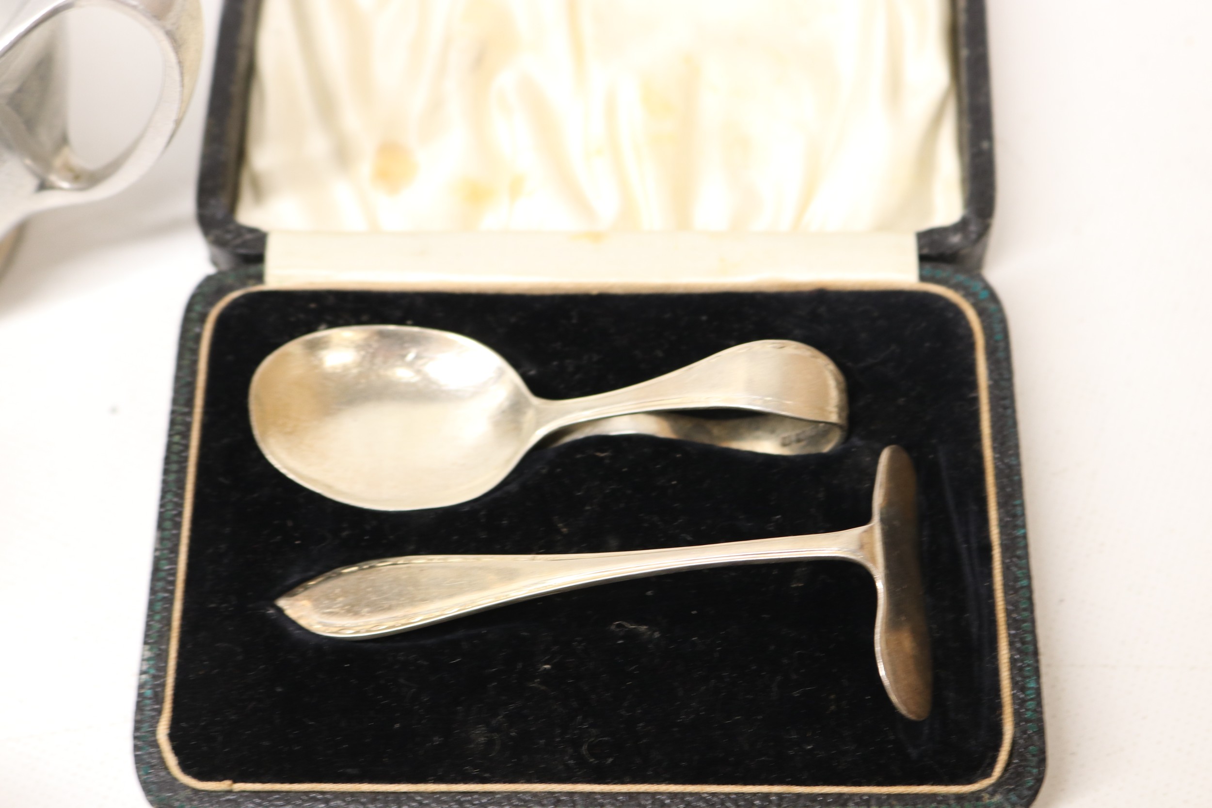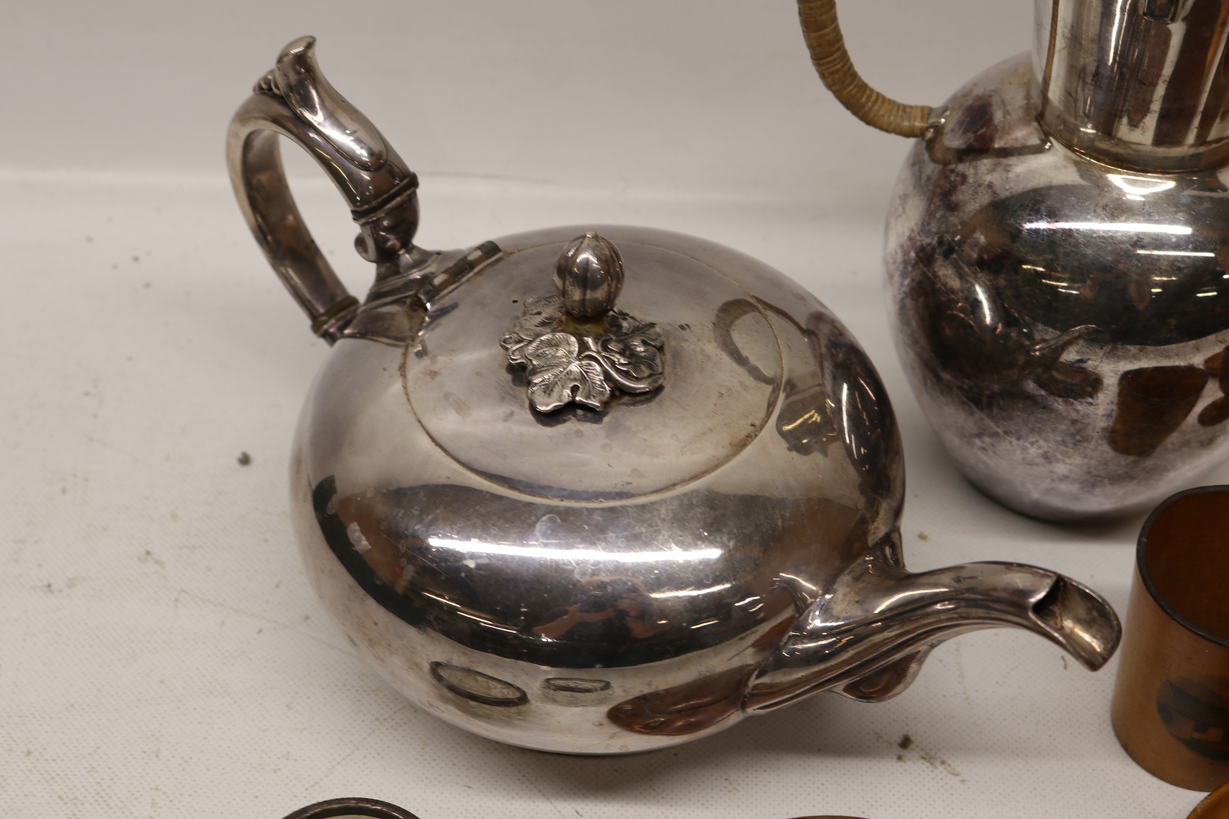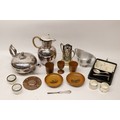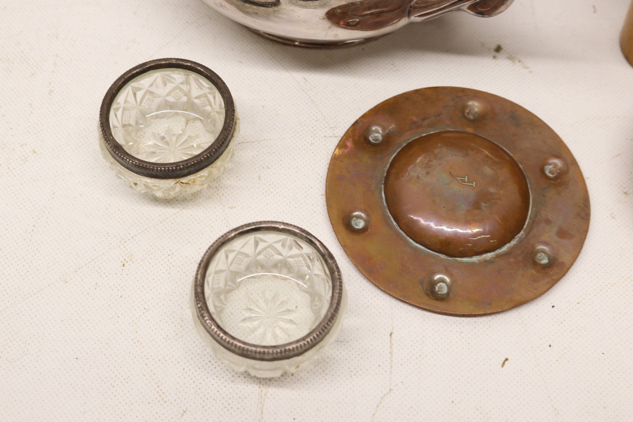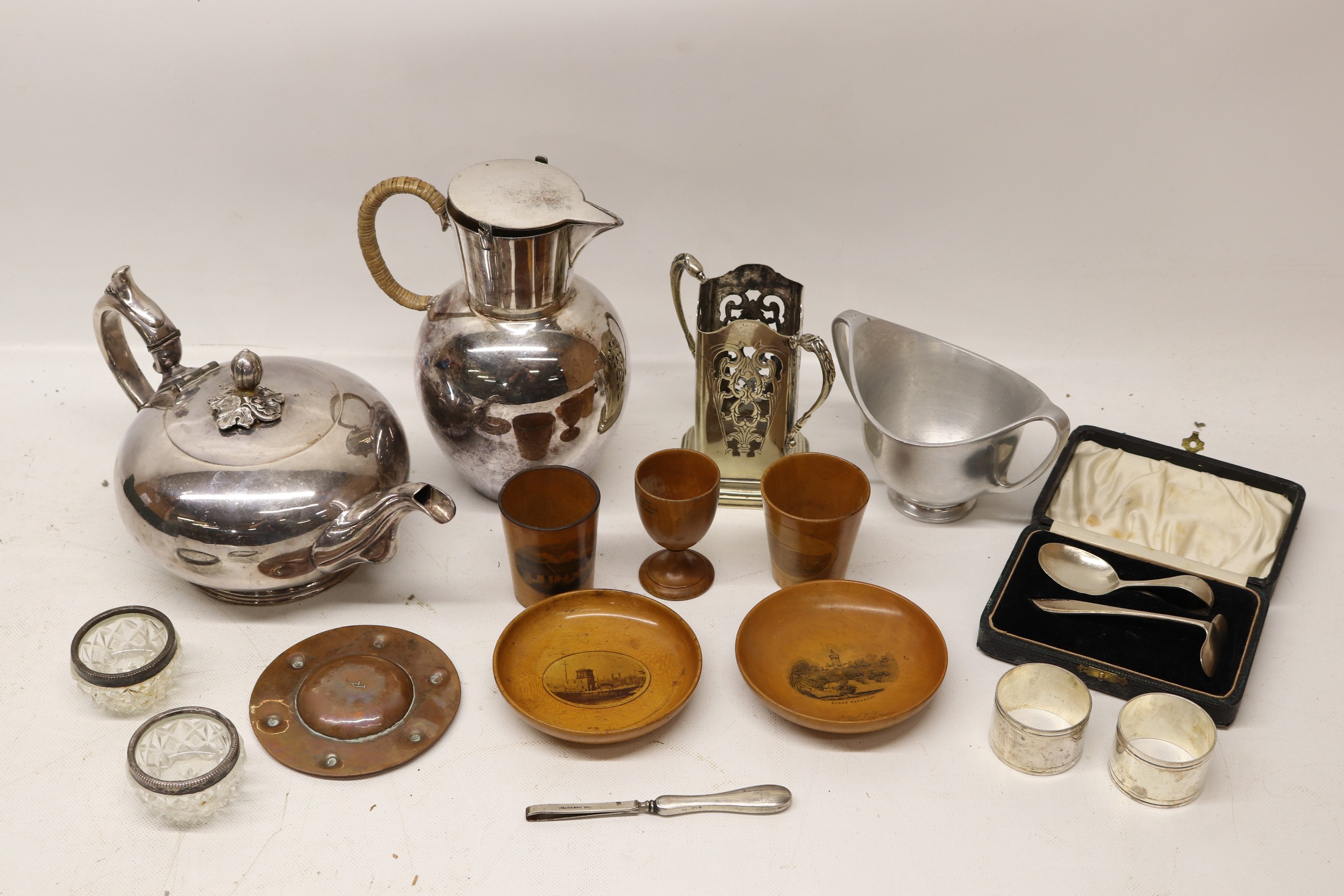 Tableware inc. George V cased christening set with spoon & pusher by Arthur Price & Co Ltd; Birmingham 1932, approx. 1.13ozt gross; silver collared salt cellar pair by Marson & Jones, Birmingham 1926; Chester silver handled tweezers, rubbed marks; WMF plated water pitcher with rattan handle, approx. H18.5cm; EPBM teapot with pomegranate finial by James Dixon & Sons, Sheffield; Art Nouveau-inspired EPNS openwork bottle holder; 2 plated napkin rings; magnalium sugar bowl; Arts & Crafts hammered copper dish, stamped JJ; Mauchline printed sycamore ware, etc. (16)
