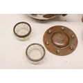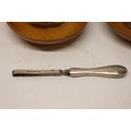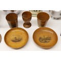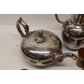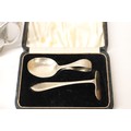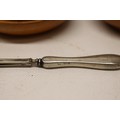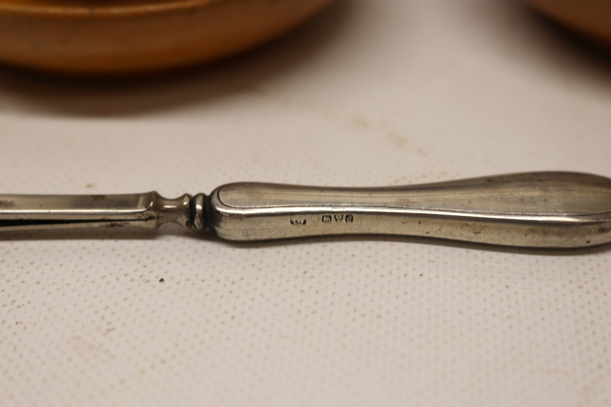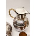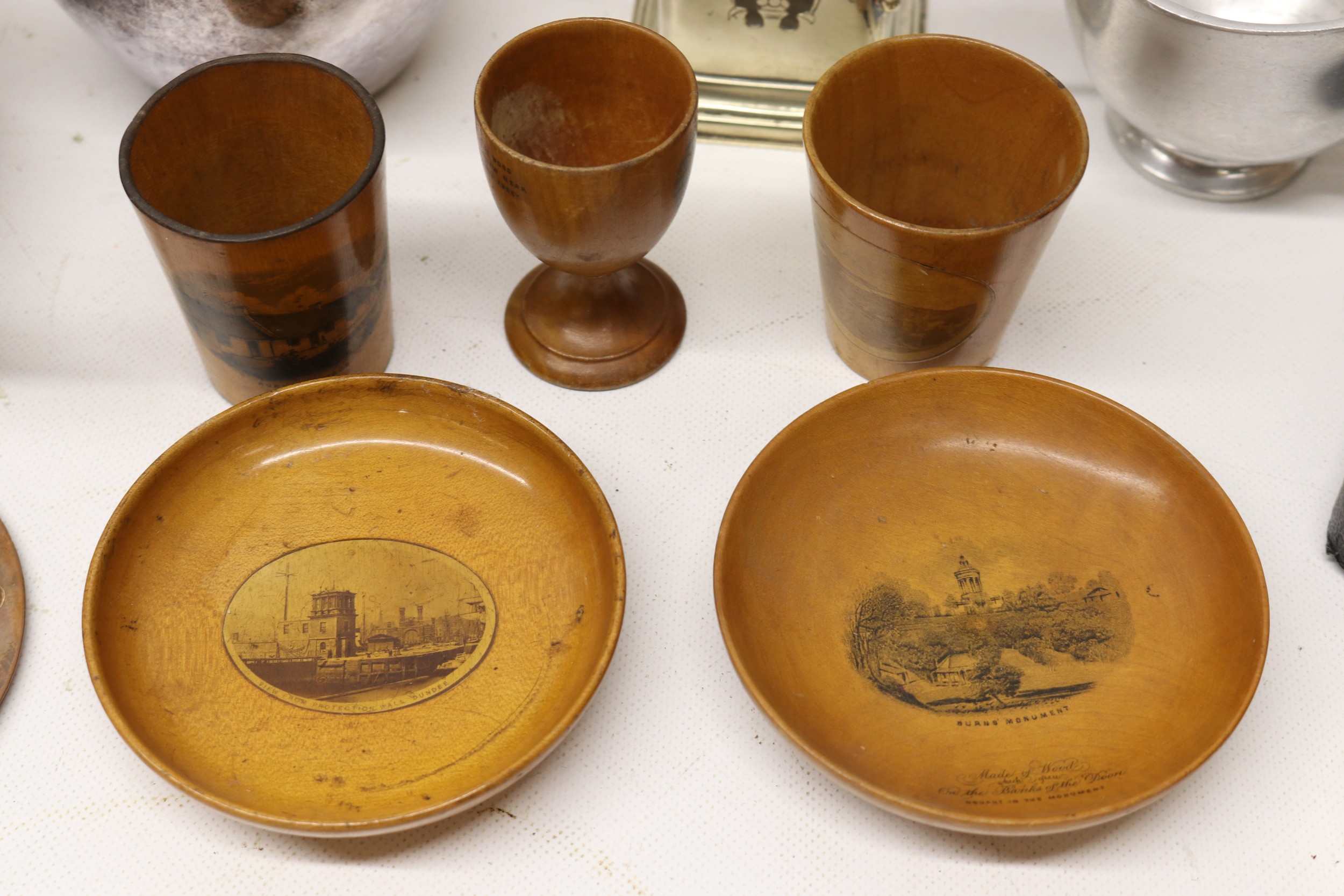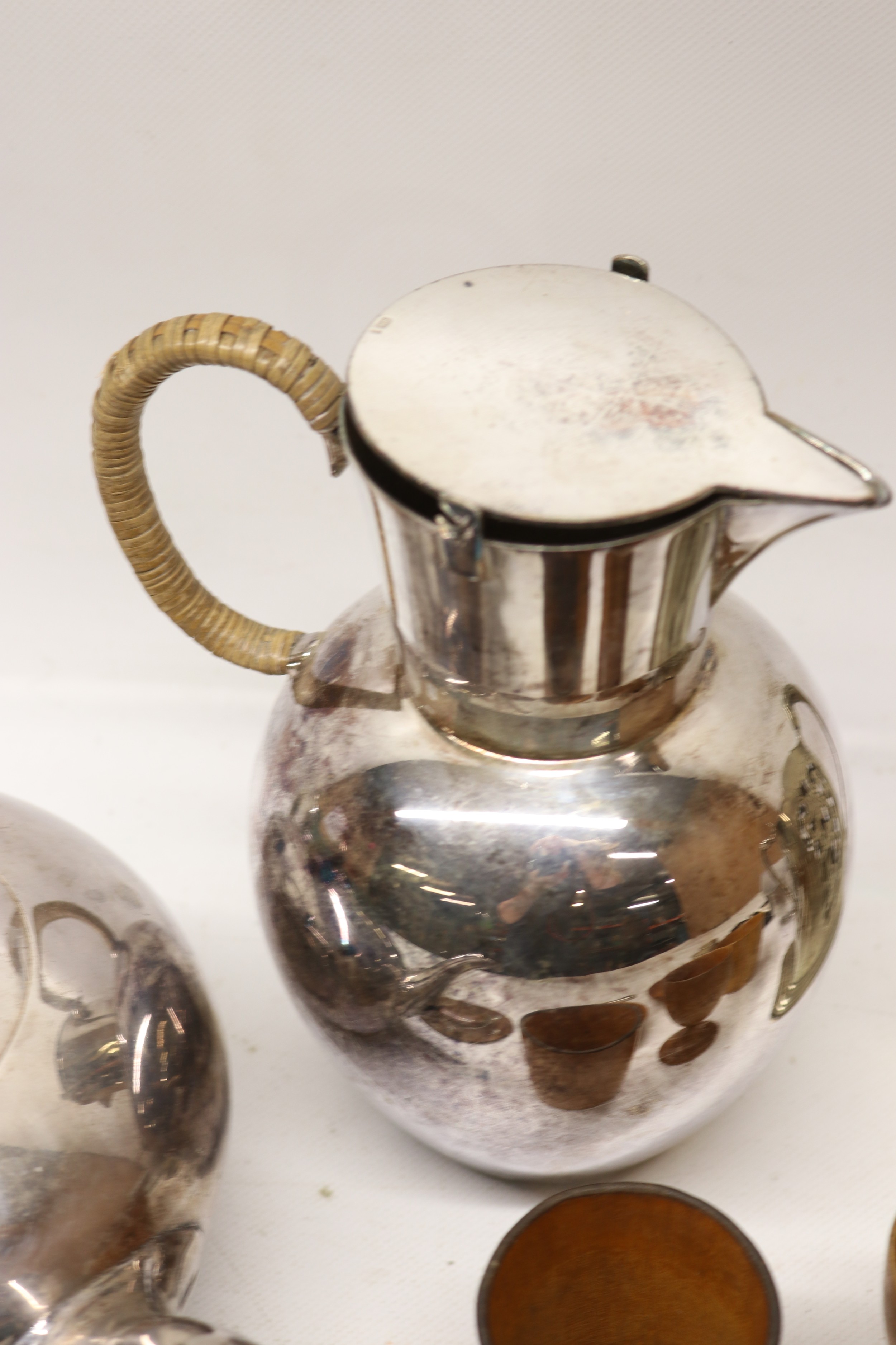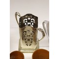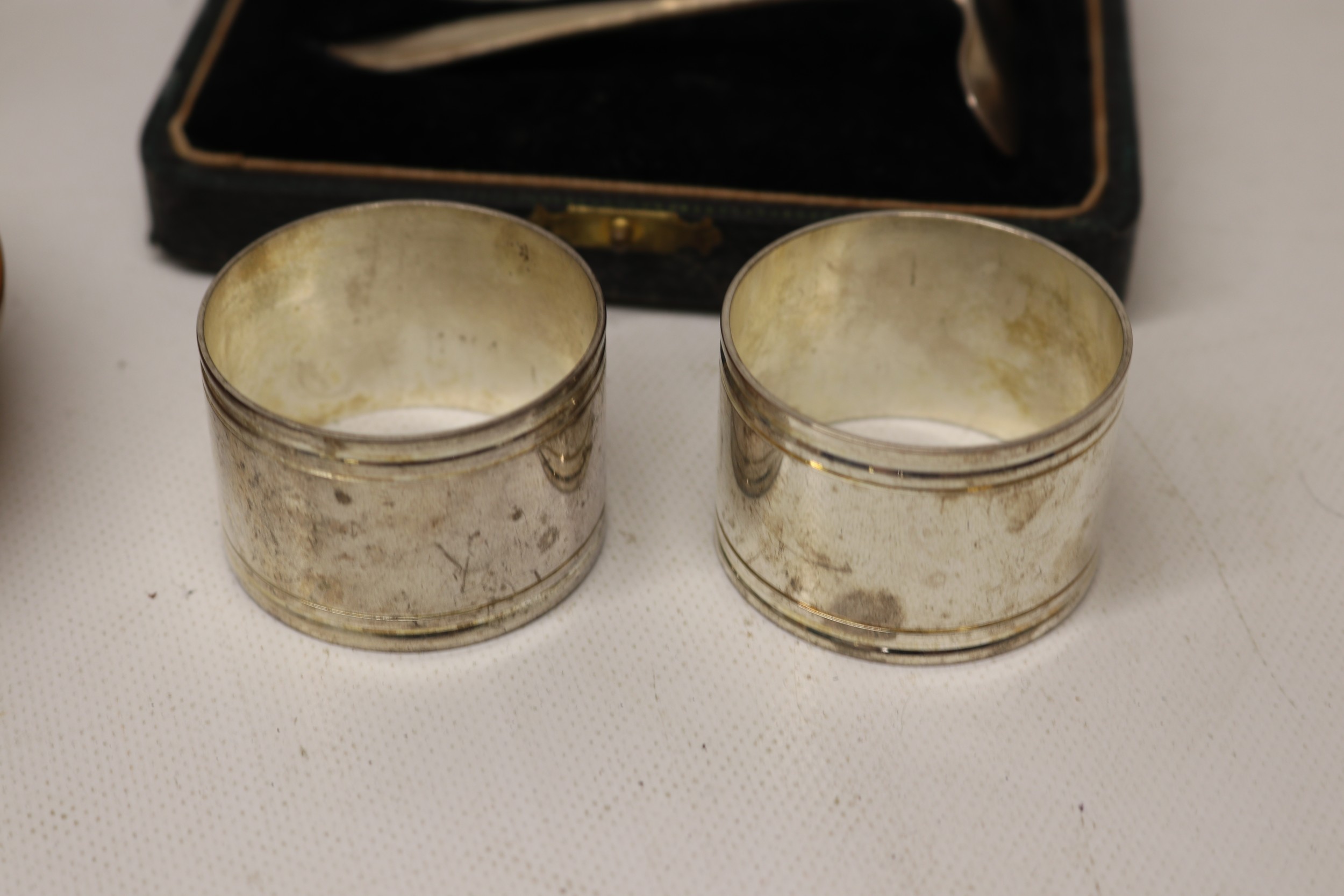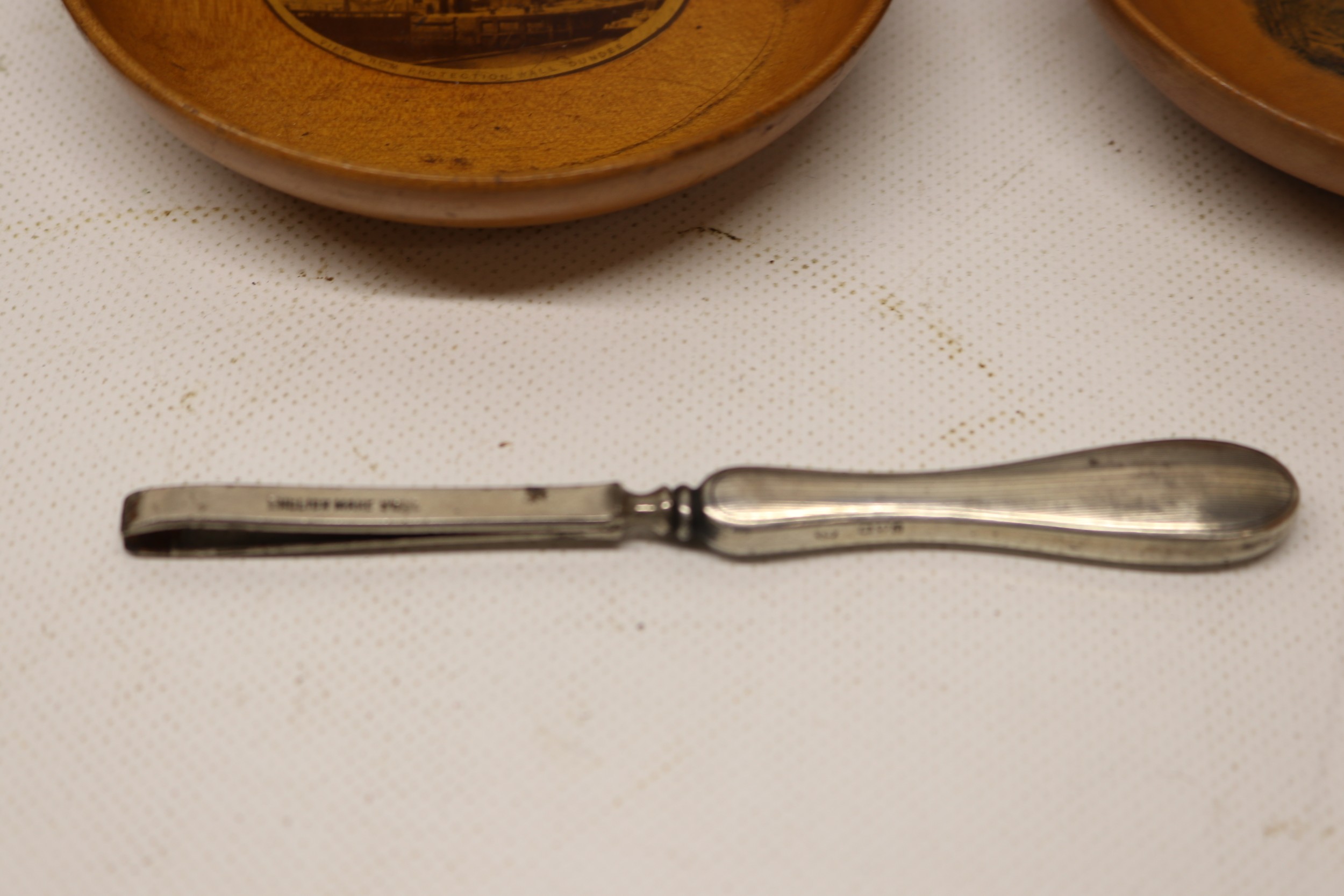 Tableware inc. George V cased christening set with spoon & pusher by Arthur Price & Co Ltd; Birmingham 1932, approx. 1.13ozt gross; silver collared salt cellar pair by Marson & Jones, Birmingham 1926; Chester silver handled tweezers, rubbed marks; WMF plated water pitcher with rattan handle, approx. H18.5cm; EPBM teapot with pomegranate finial by James Dixon & Sons, Sheffield; Art Nouveau-inspired EPNS openwork bottle holder; 2 plated napkin rings; magnalium sugar bowl; Arts & Crafts hammered copper dish, stamped JJ; Mauchline printed sycamore ware, etc. (16)