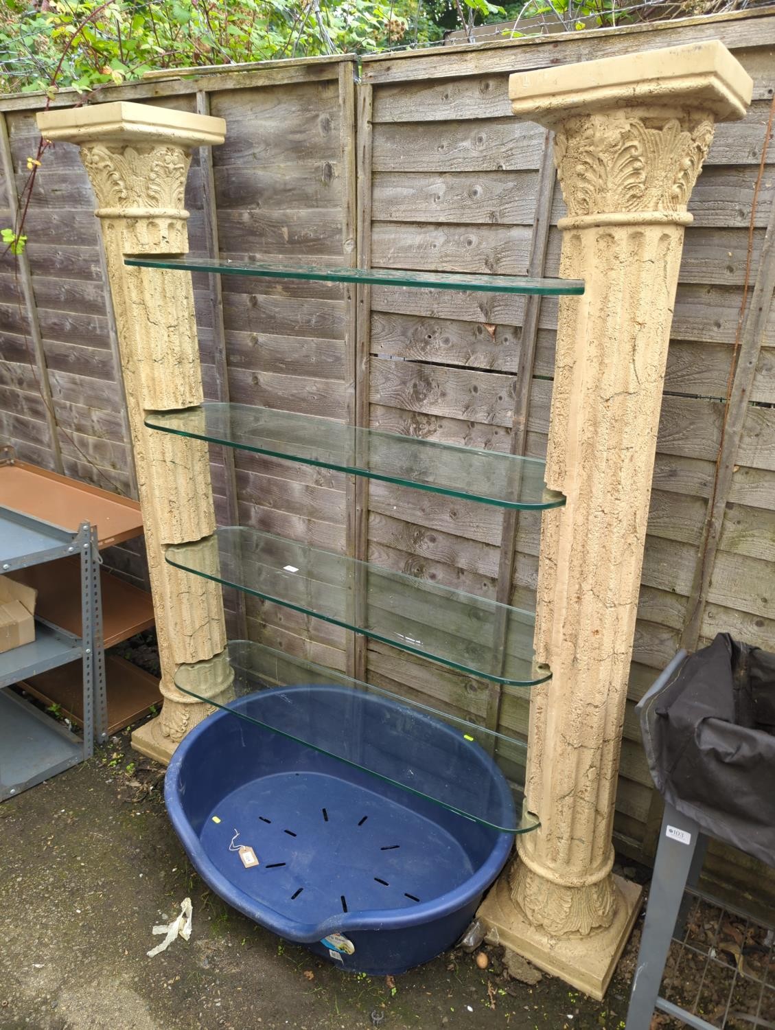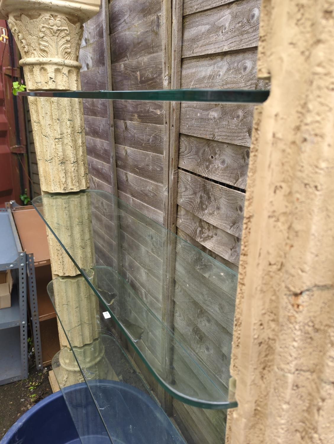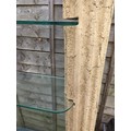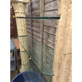 2 x fibreglass columns supporting 4 x reinforced glass shelves. Shelves are unsecured. W148cm D30cm H178cm.