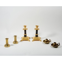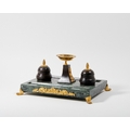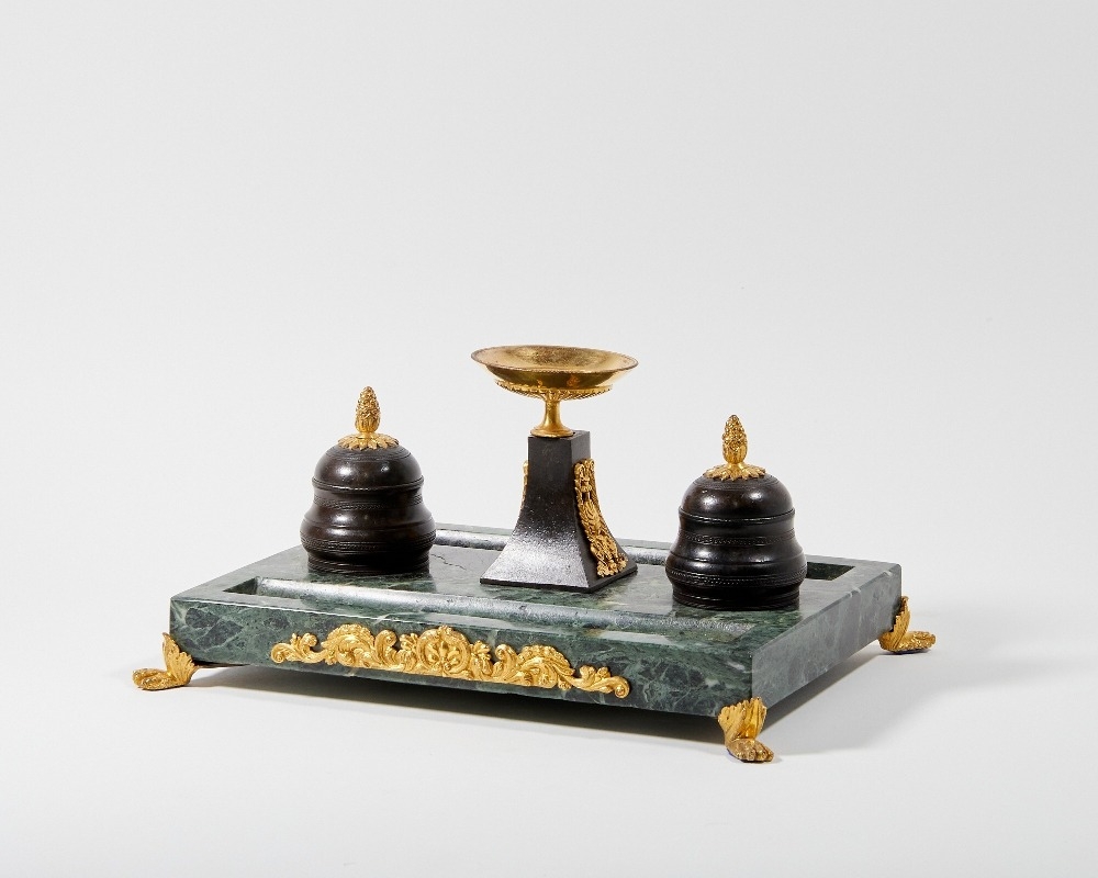 A French verde antico and gilt and patinated bronze encrier, of Restauration style, 20th century, with twin pen recesses, the waisted inkwells with berried finials to the covers flanking a central tazza raised on a swept plinth, on paw feet, 17cm high, 34cm wide, 25cm deep
