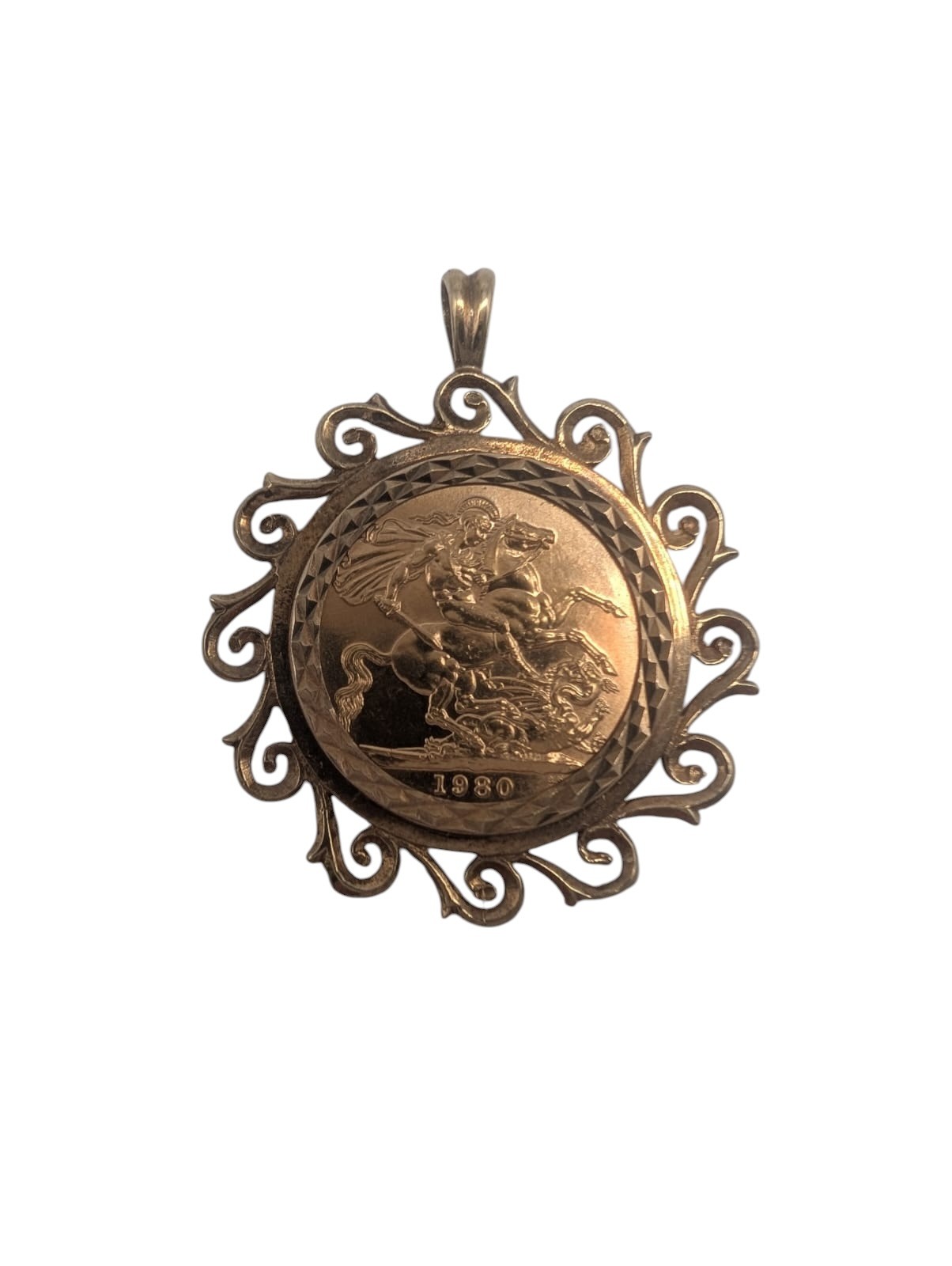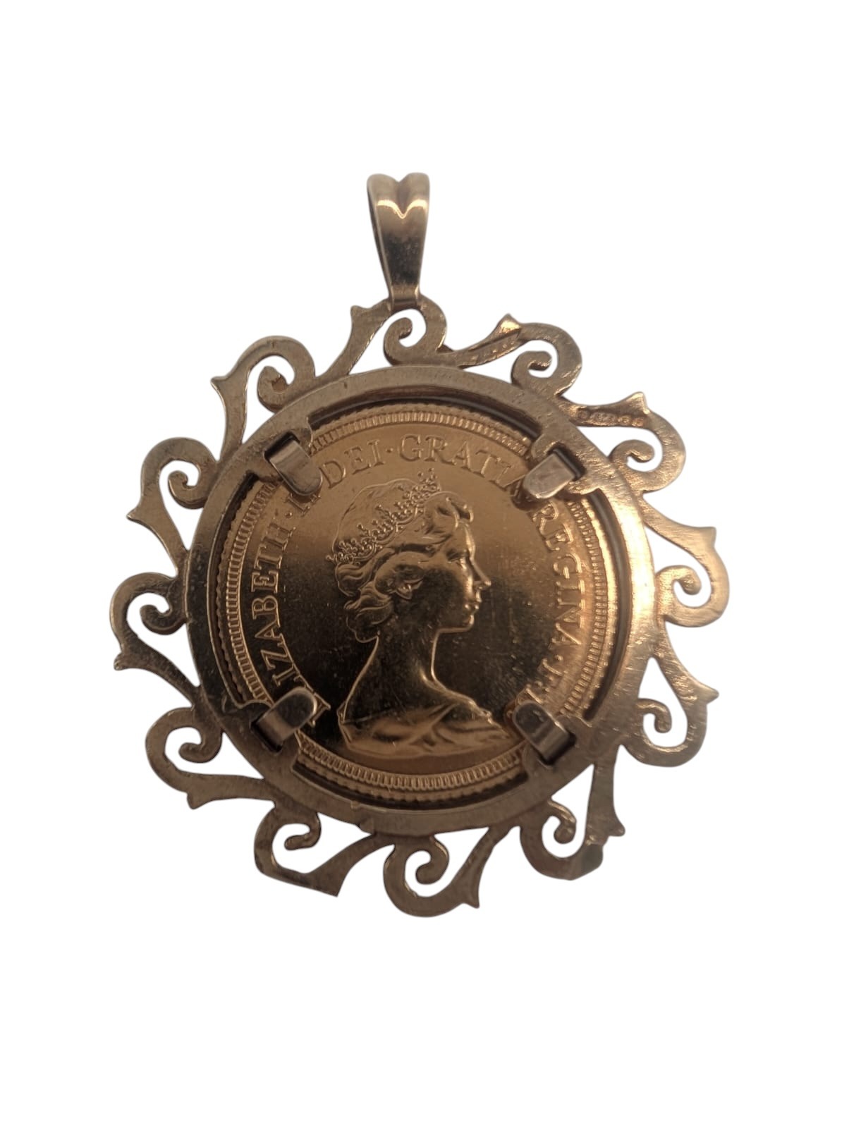 1980 Elizabeth Full Sovereign (7.98g) set within a 9ct yellow Gold decorative Mount pendent.