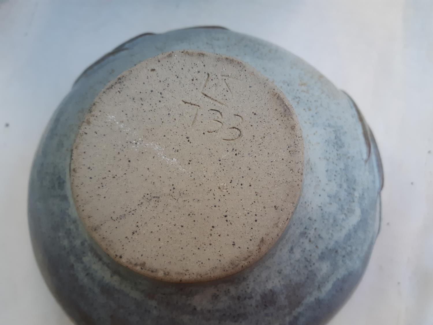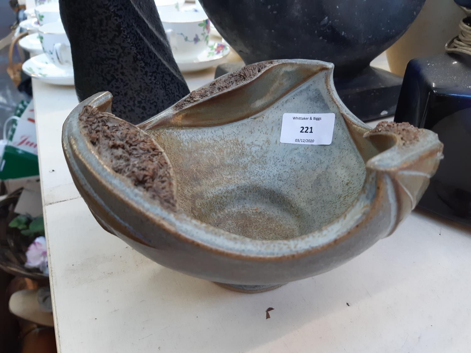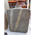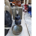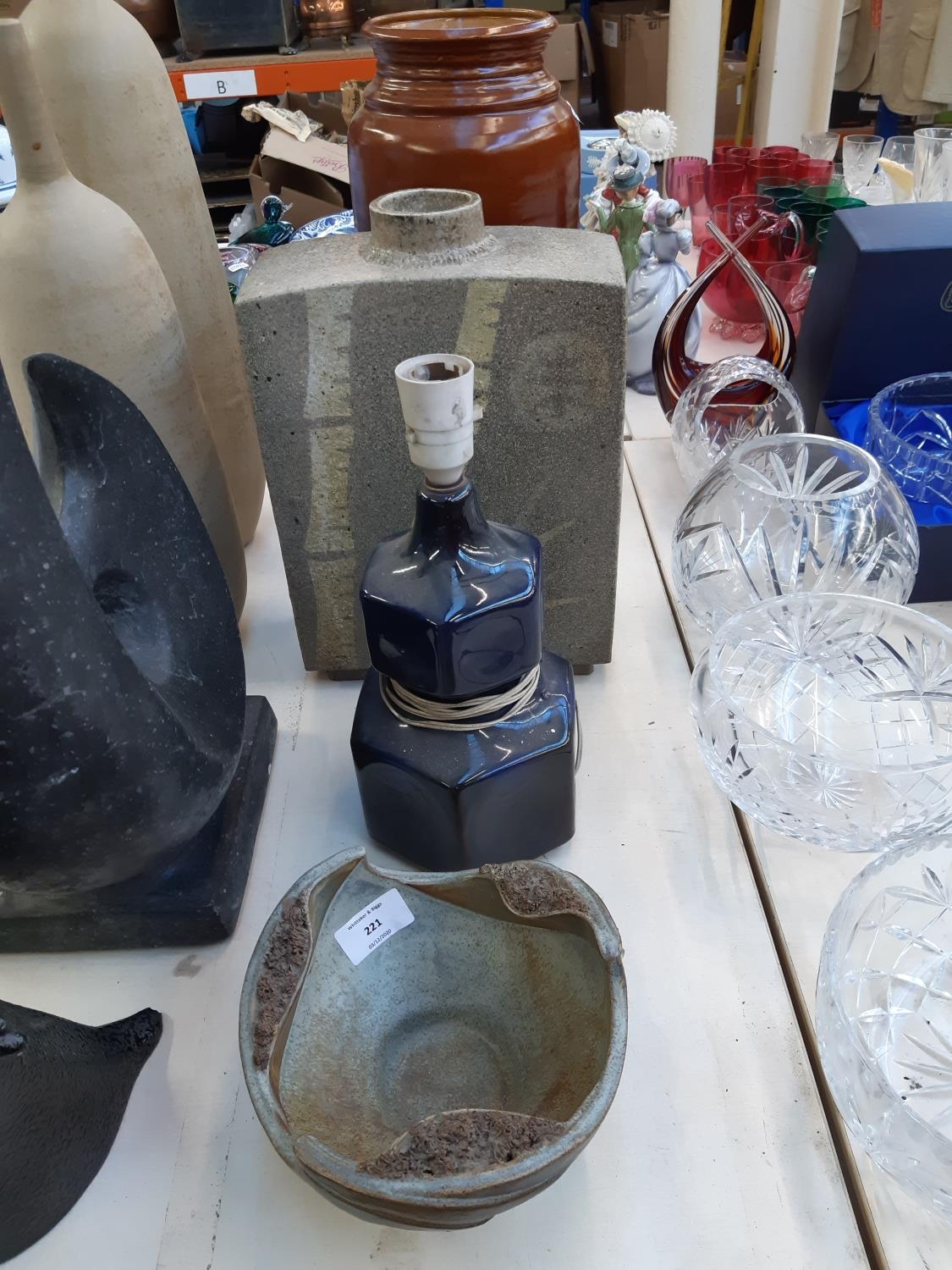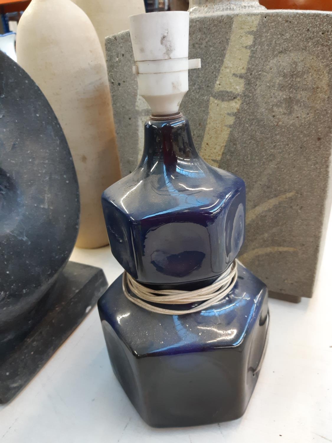 Four items to include a studio pottery bowl signed 'LK 733' to base, mid 20th century West German Bay Keramik 630-40 floor vase, mid 20th century cobalt blue table lamp and a studio pottery cuboid vase with bamboo shoot design and impressed potters mark to reverse (34cm x 23cm)