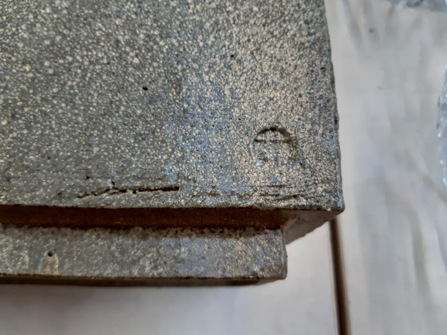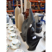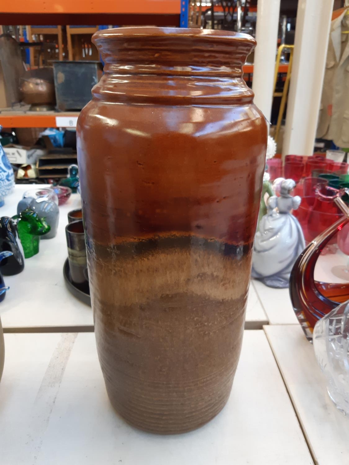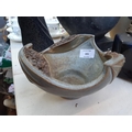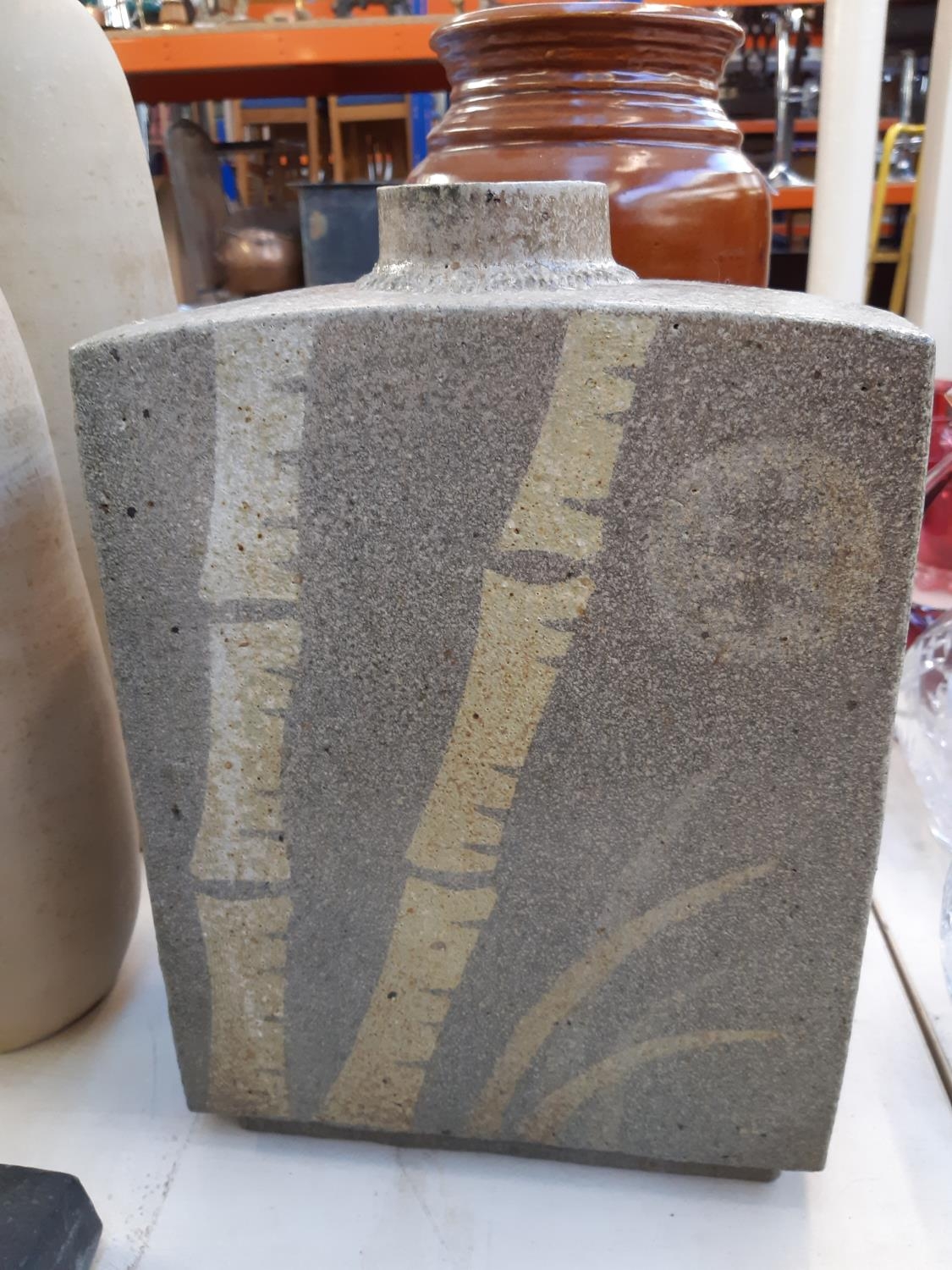 Four items to include a studio pottery bowl signed 'LK 733' to base, mid 20th century West German Bay Keramik 630-40 floor vase, mid 20th century cobalt blue table lamp and a studio pottery cuboid vase with bamboo shoot design and impressed potters mark to reverse (34cm x 23cm)