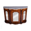A small Victorian marquetry inlaid marble top credenza, the serpentine top over a door front flanked by a pair of glazed side cabinets, height 77cm x width 150cm.