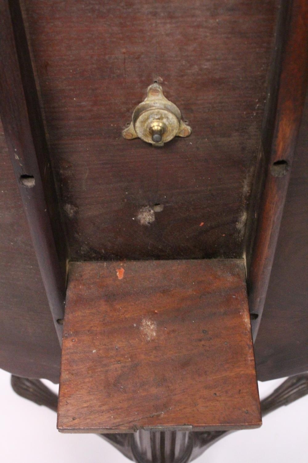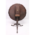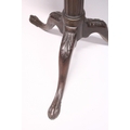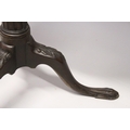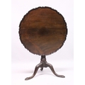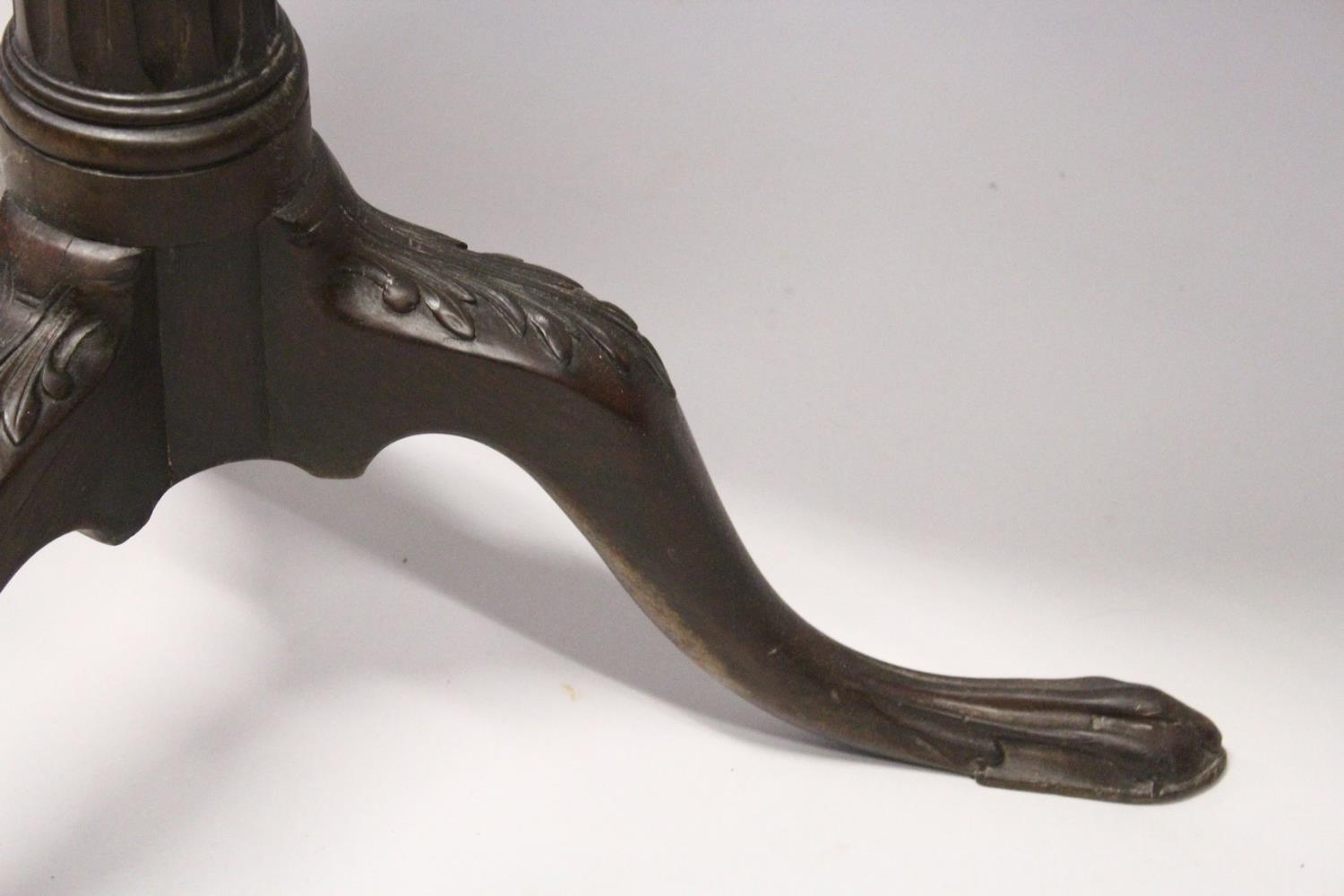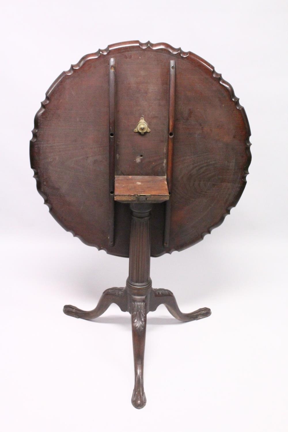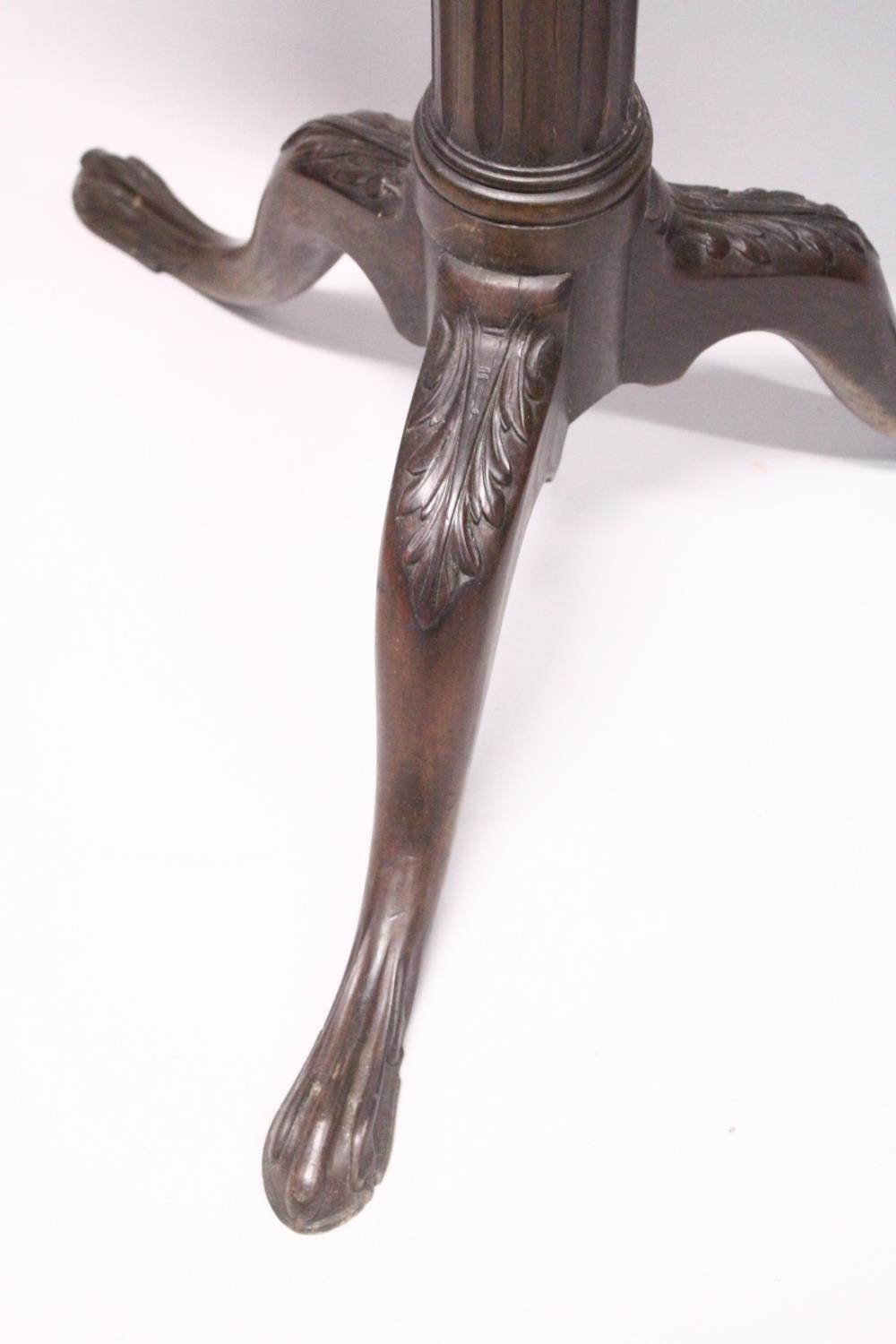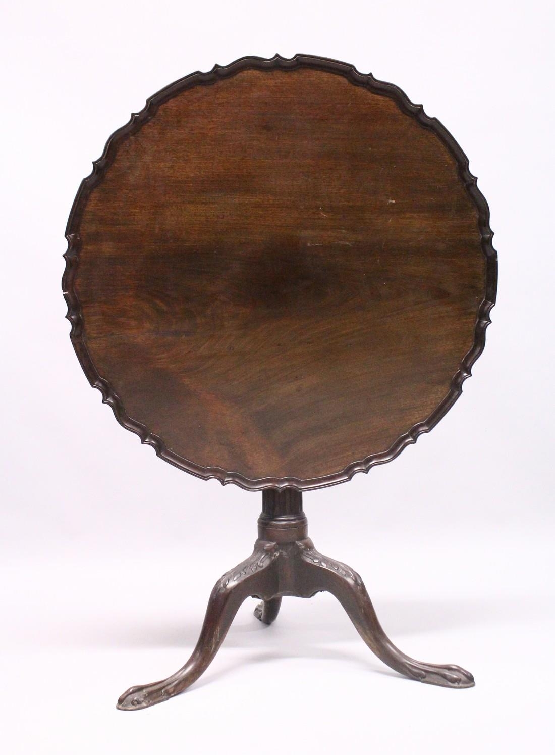 A CHIPPENDALE STYLE MAHOGANY TILT TOP TRIPOD TABLE with pie crust top, gun barrel support, curving legs with claw feet.