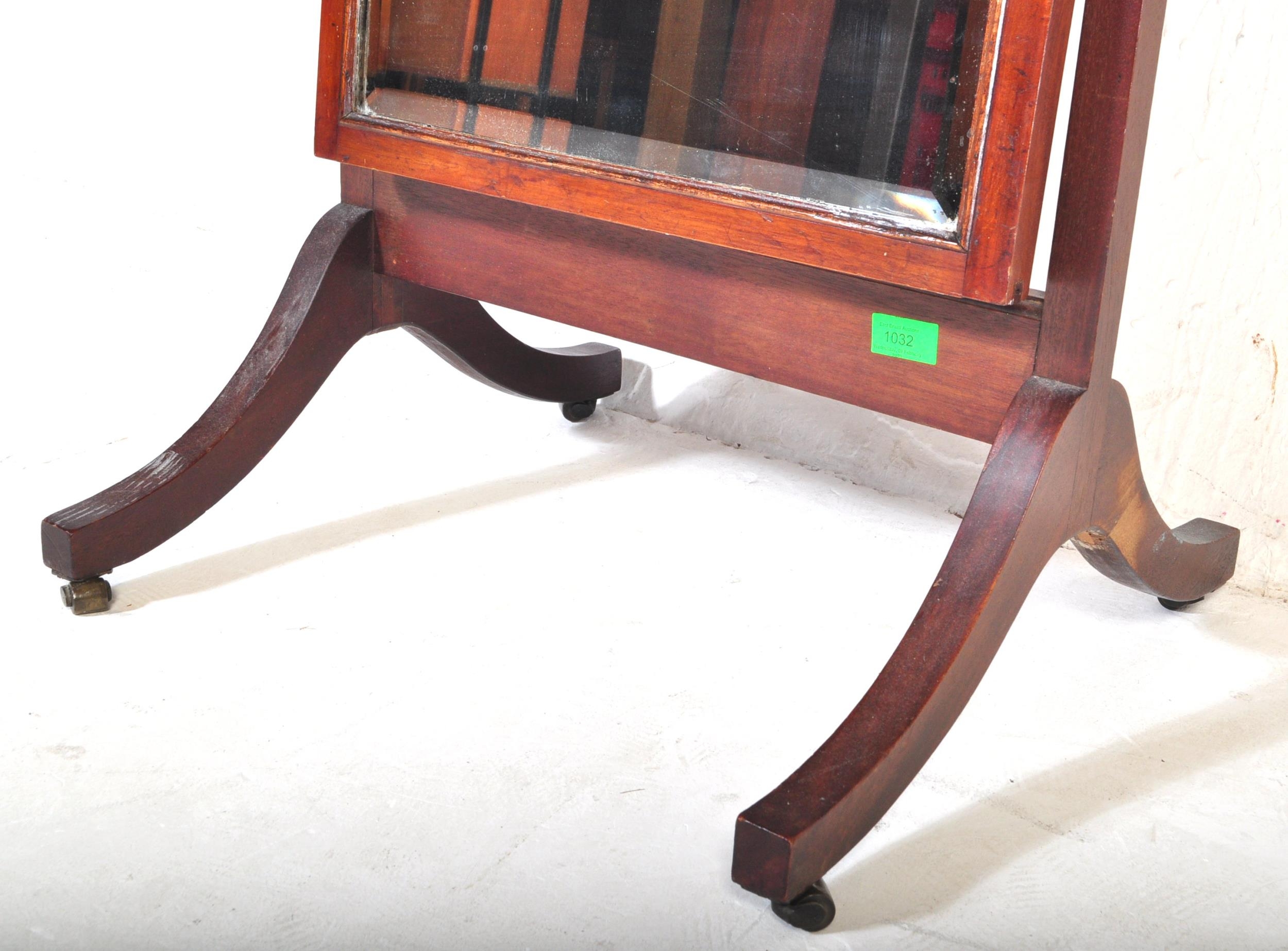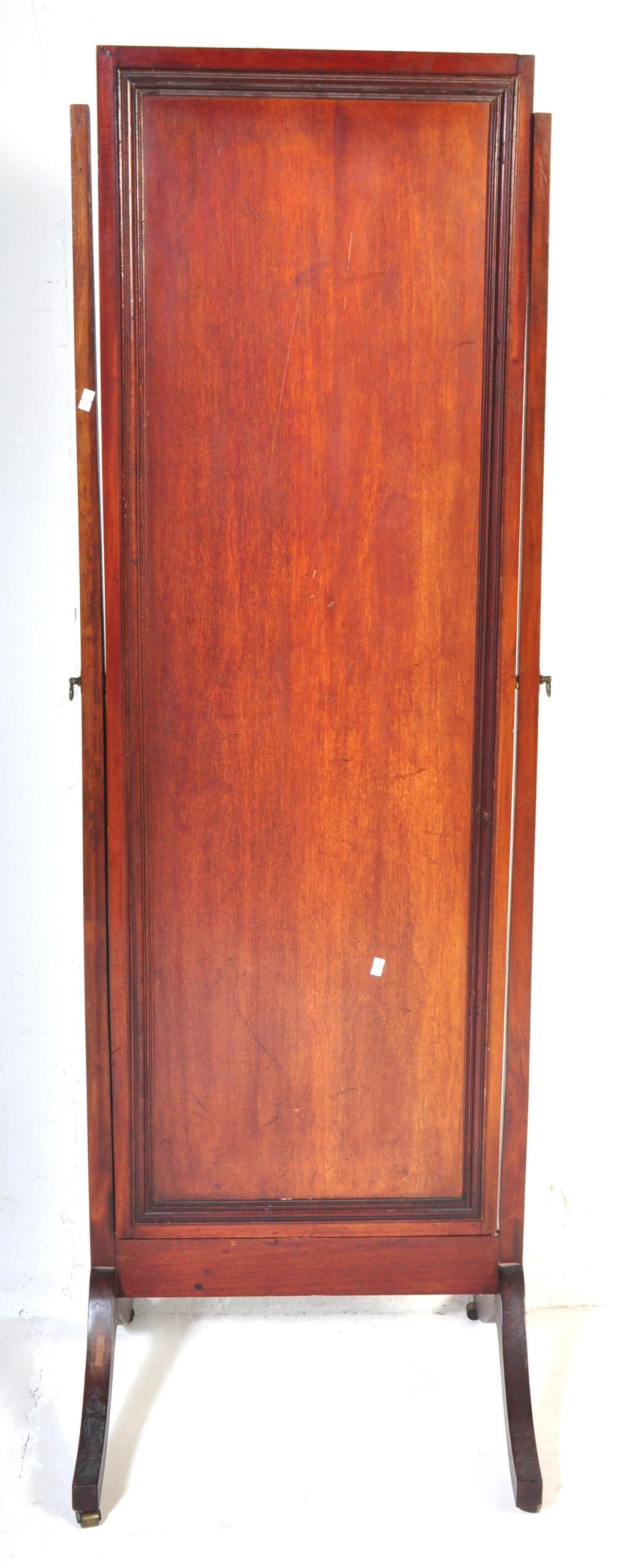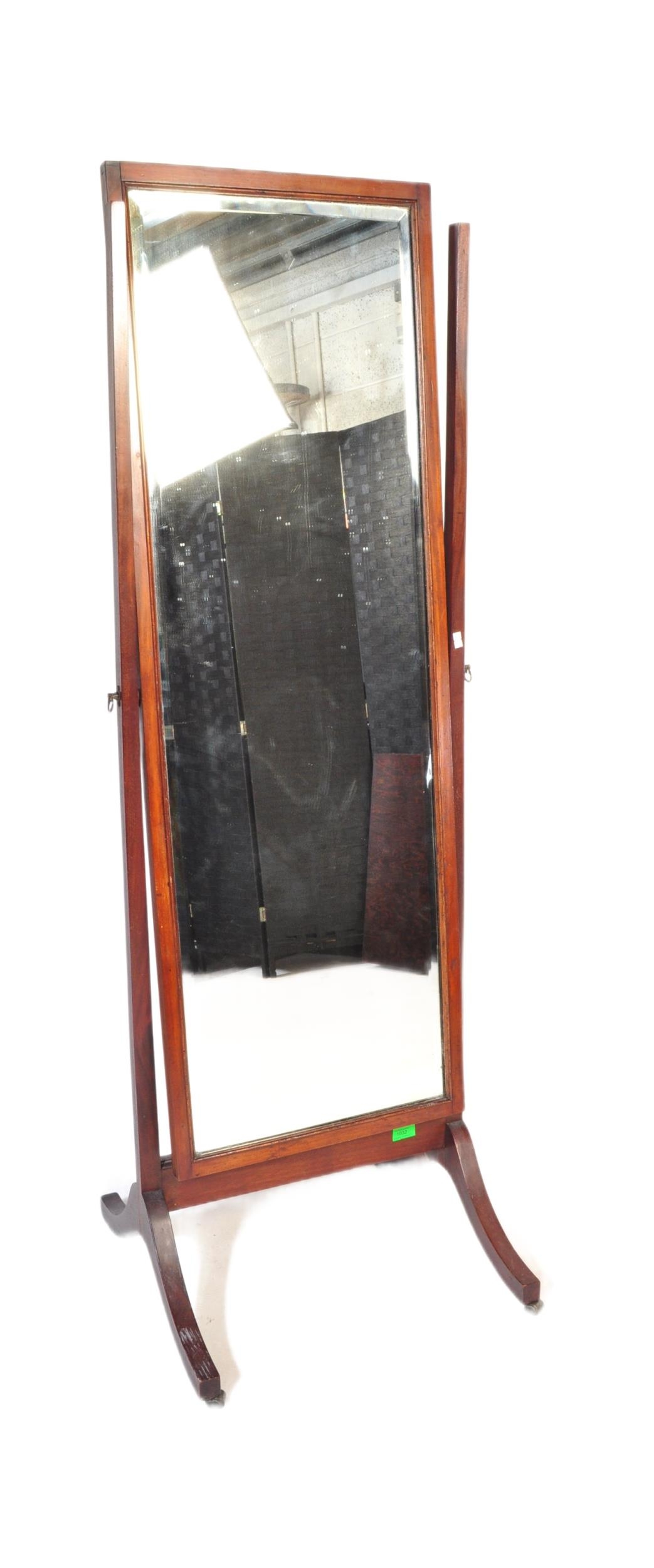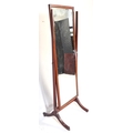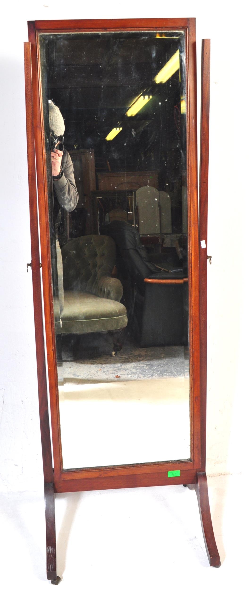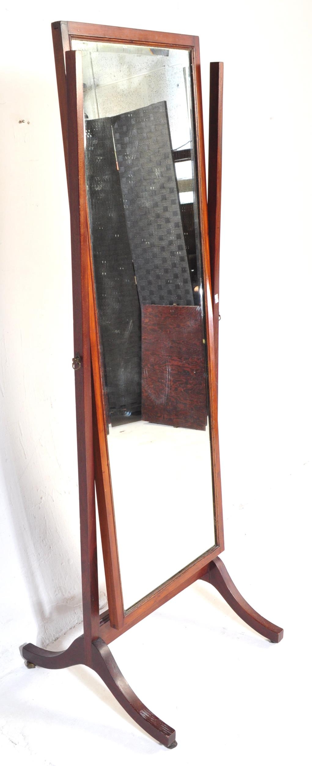 An early 20th Century circa 1920s mahogany Queen Anne revival cheval mirror. With two upright supports supported on trestle splayed legs with rectangular mirror with bevelled edge inset mirror. Measures approx.