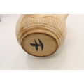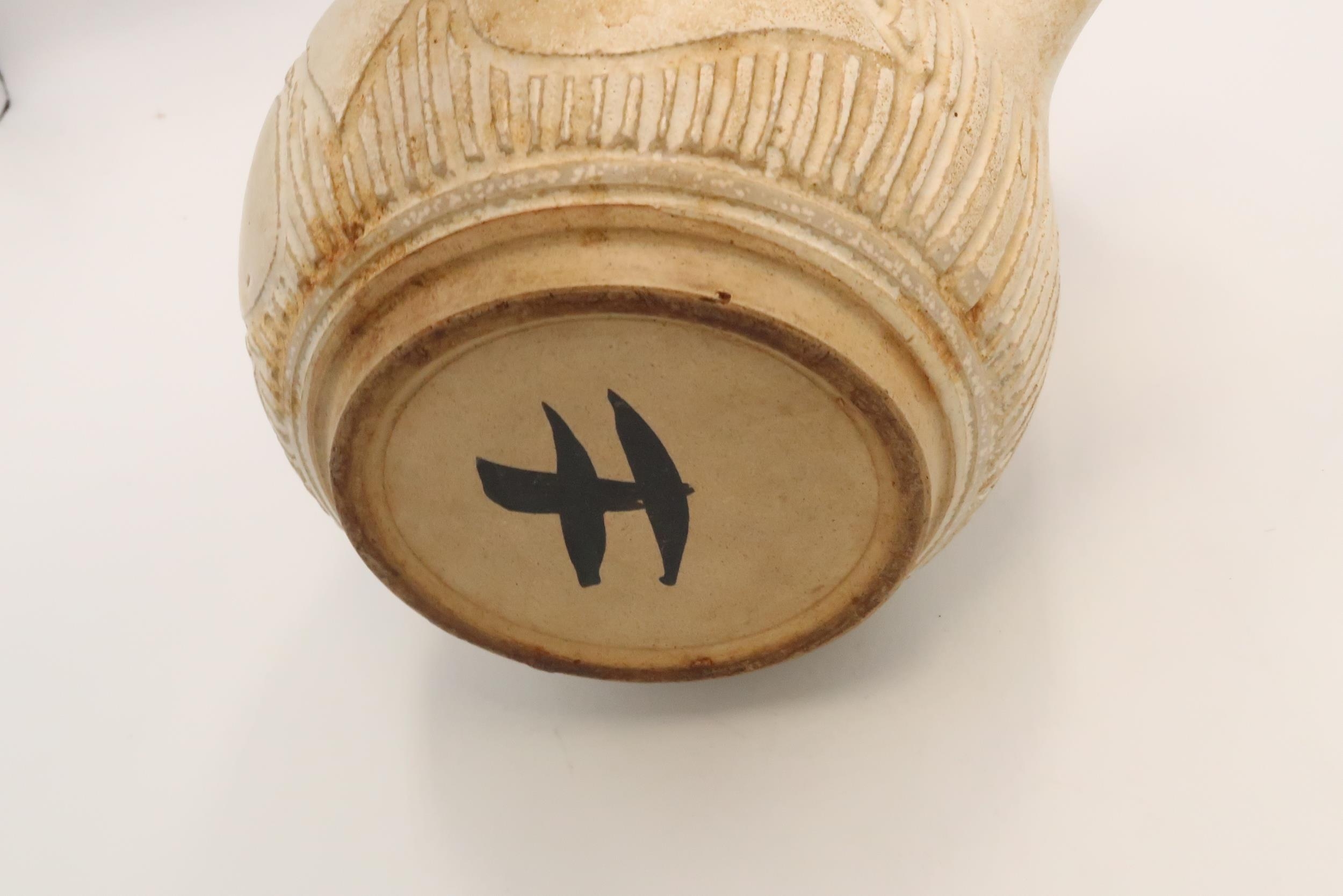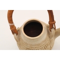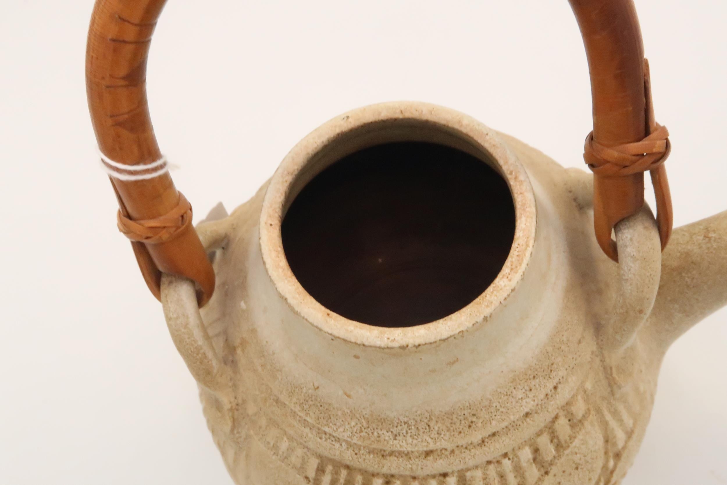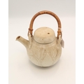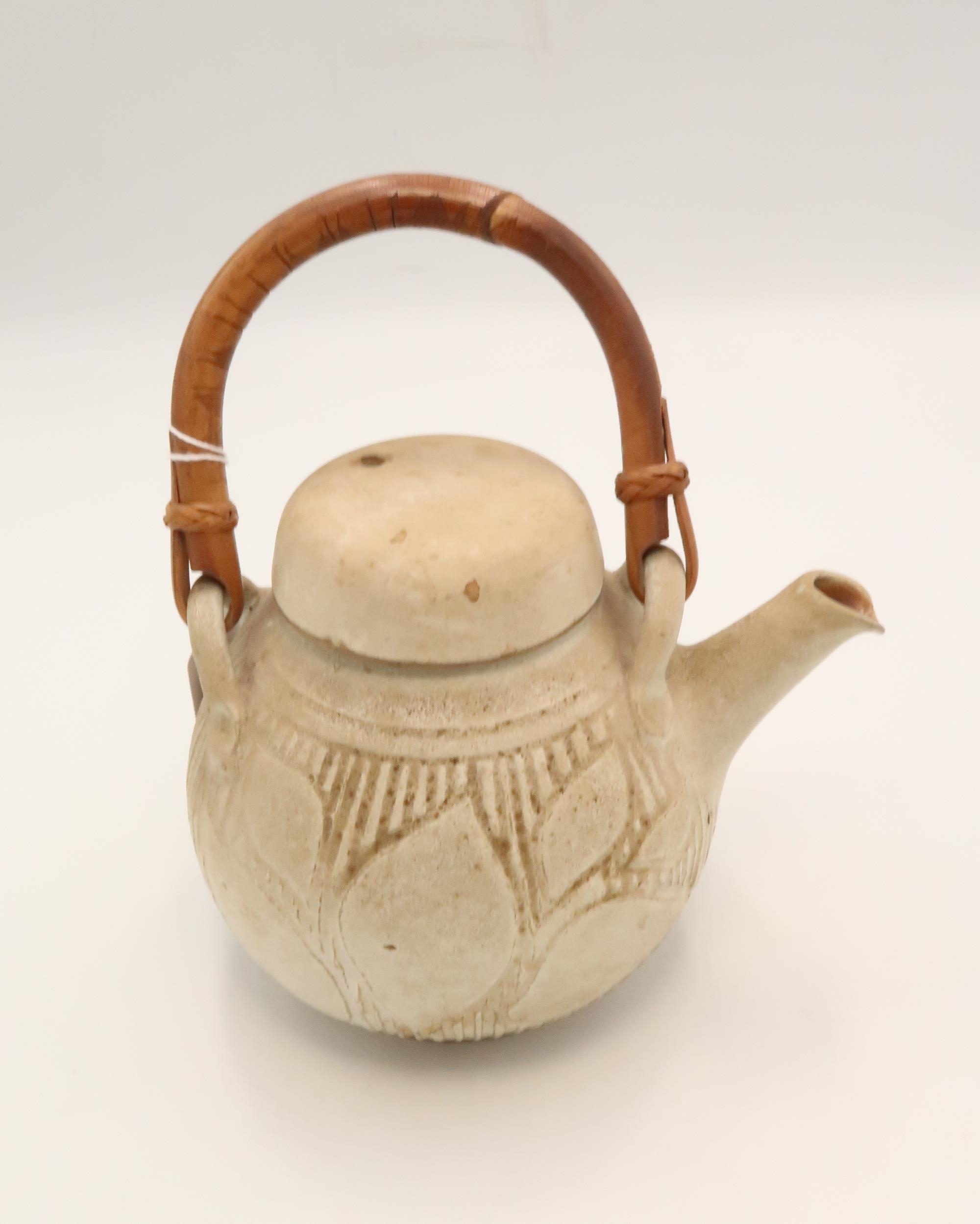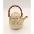 A Japanese stoneware teapot, with inscribed leaf and tree decoration, with bent bamboo handle, single signature character to the base, 20cm high including handle.