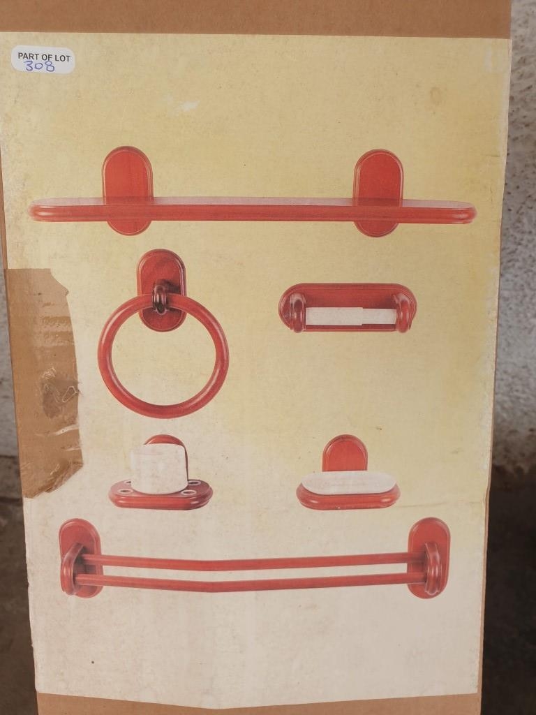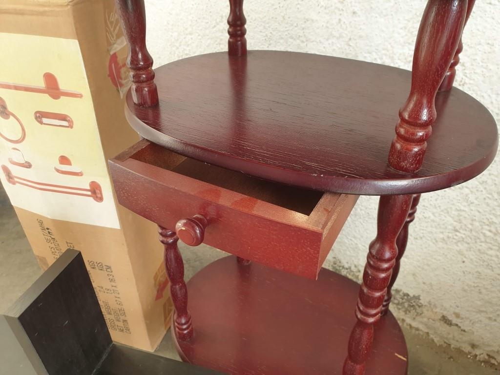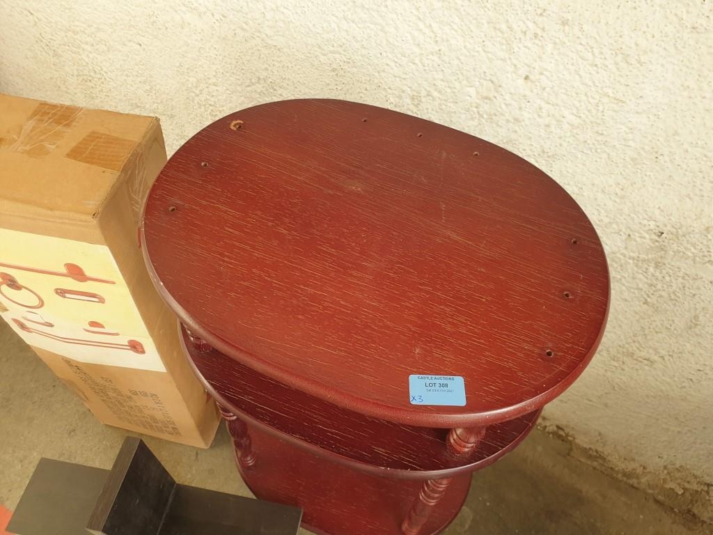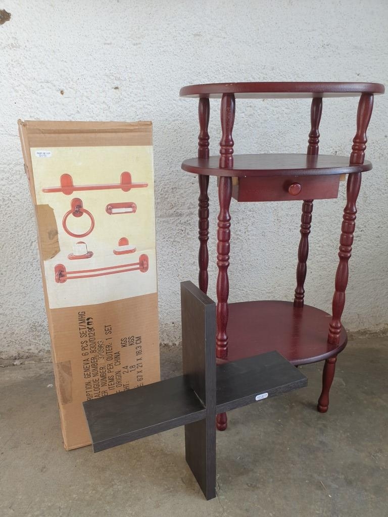 Dark Wood Oval / 3 - Tier Occasional / Side Table, Together with "X" Wall Shelf and 6 PC Mahogany Colour Bathroom Set (H:72cm x 39cm x 30cm)