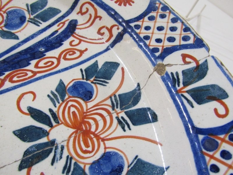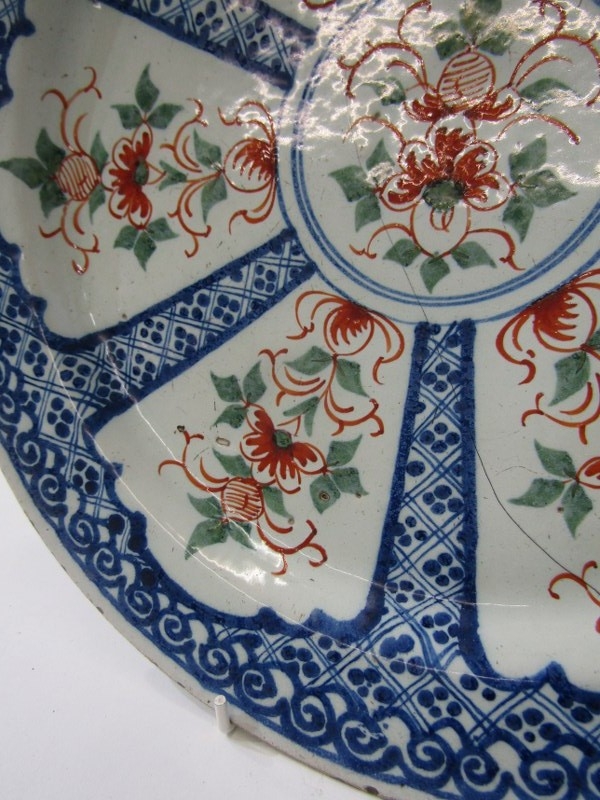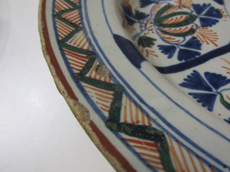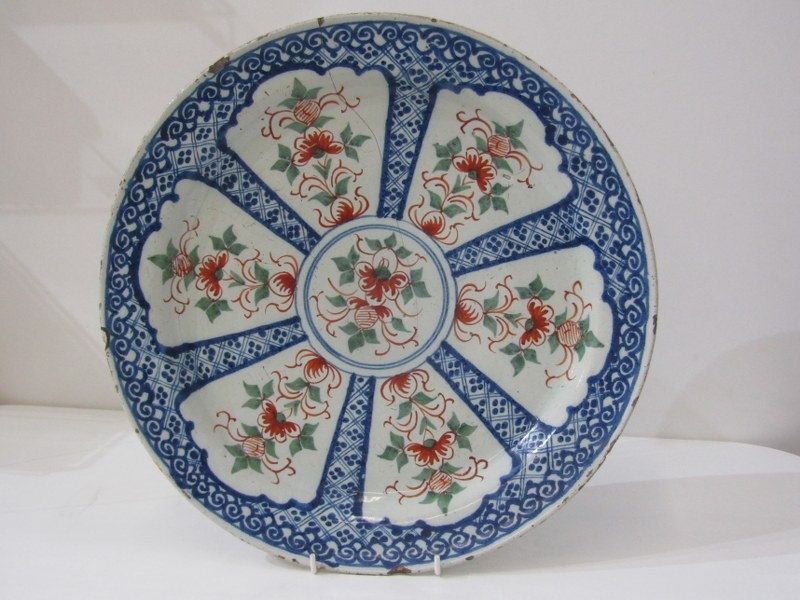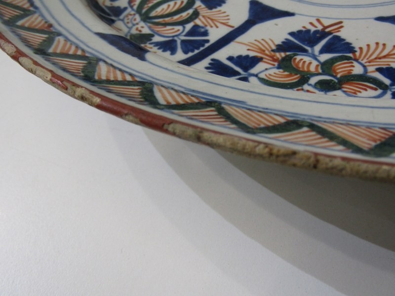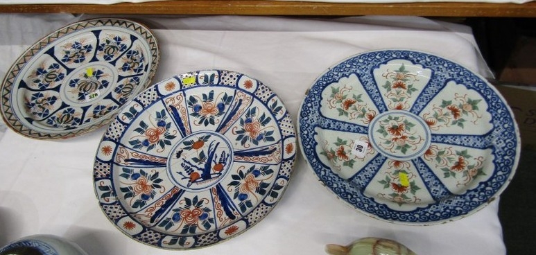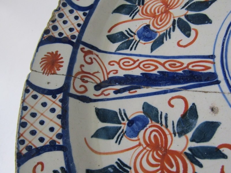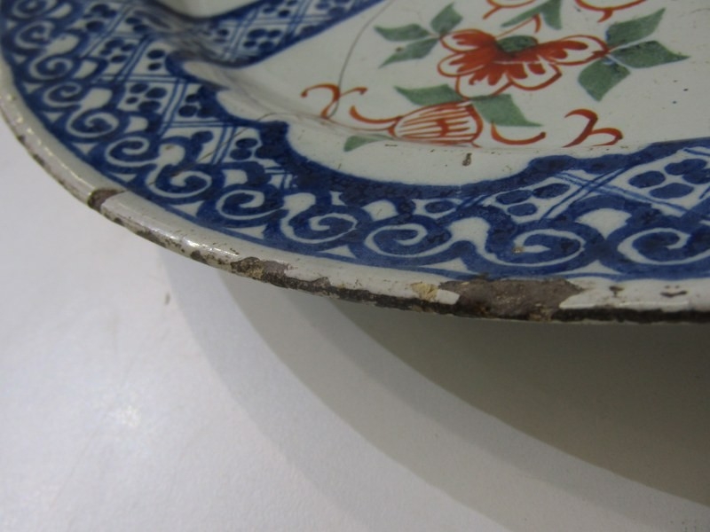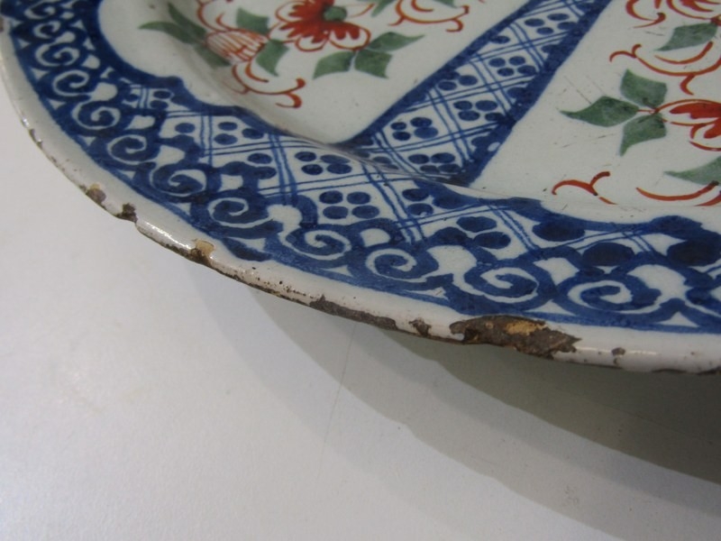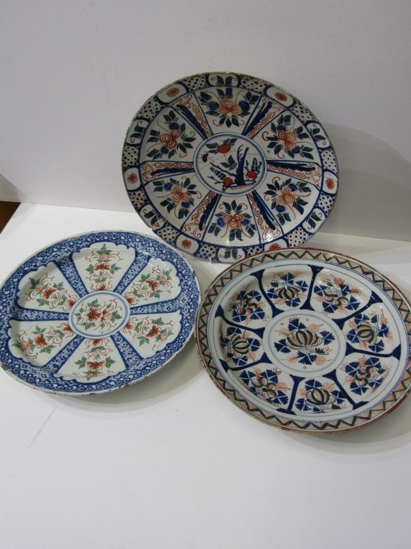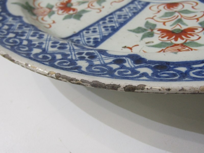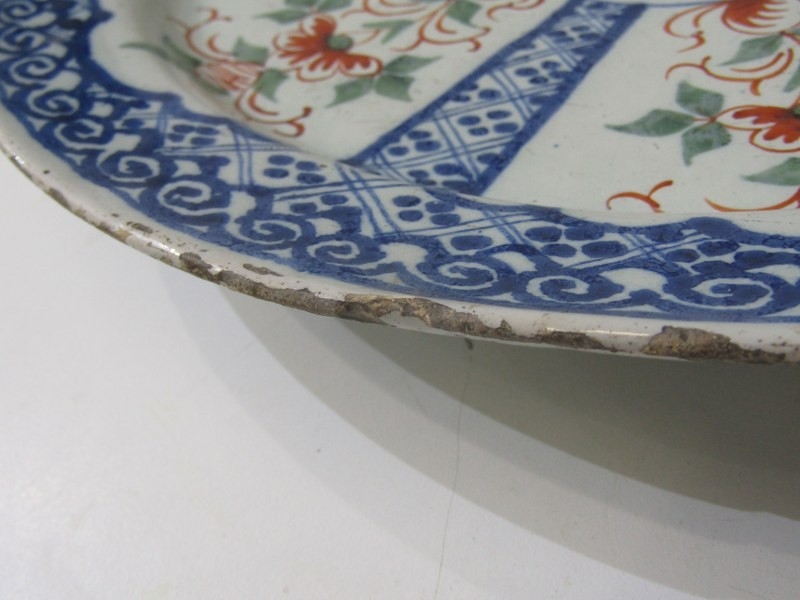 EARLY DELFT, 3 various polychromed chargers with floral decorated panels, maximum diameter 35cms (2 with extended cracks)