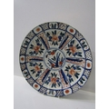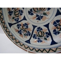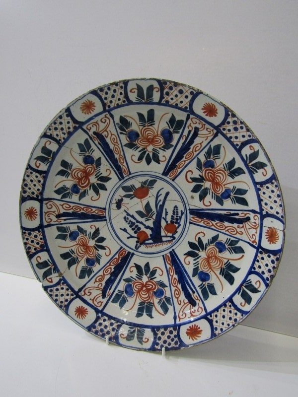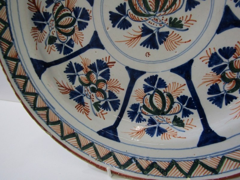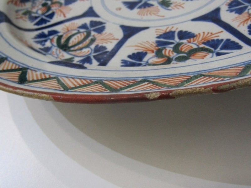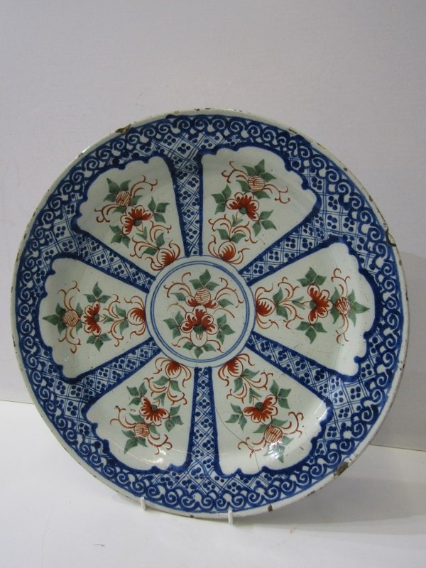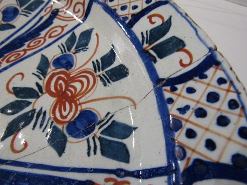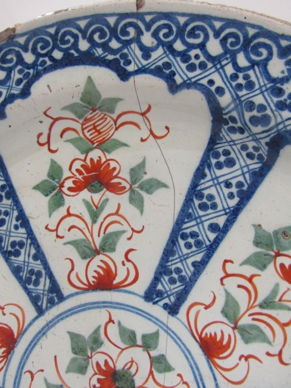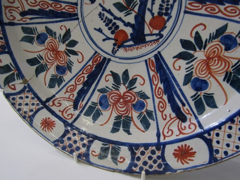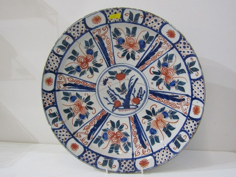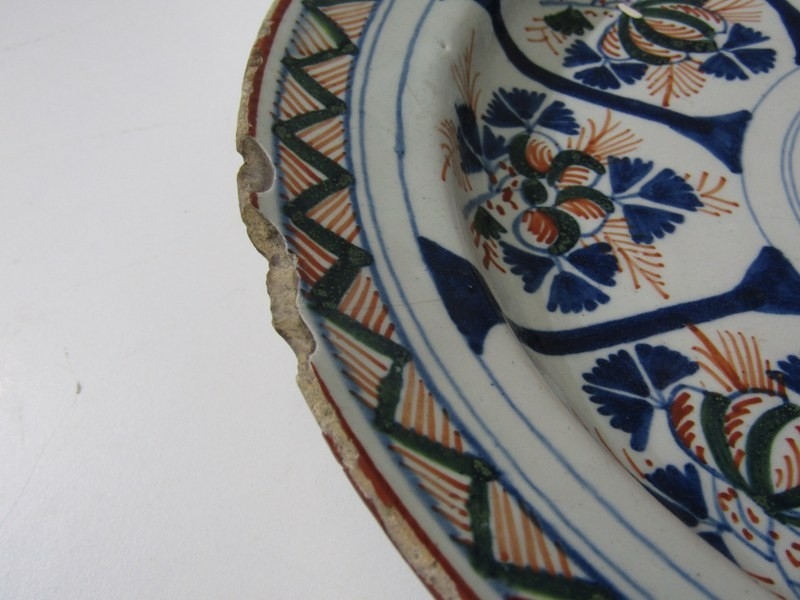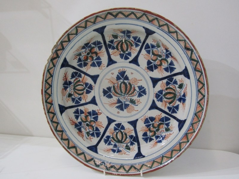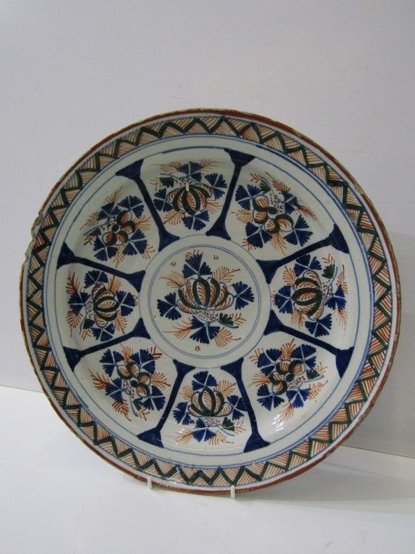 EARLY DELFT, 3 various polychromed chargers with floral decorated panels, maximum diameter 35cms (2 with extended cracks)