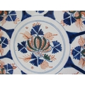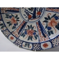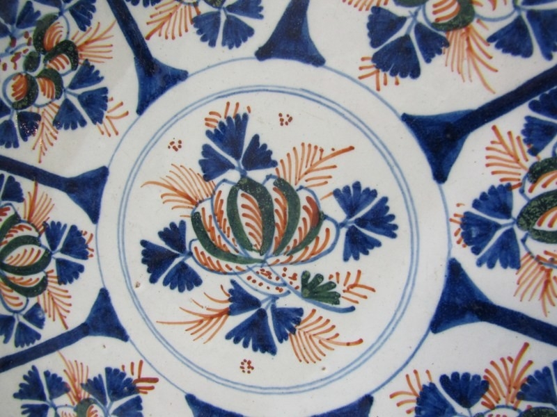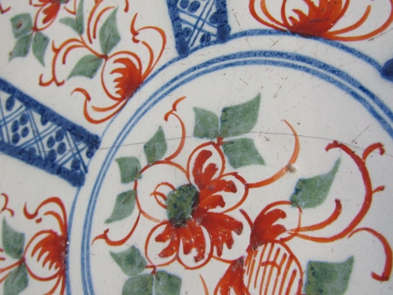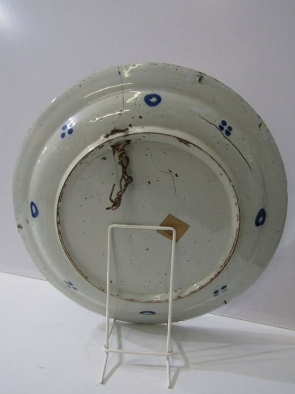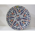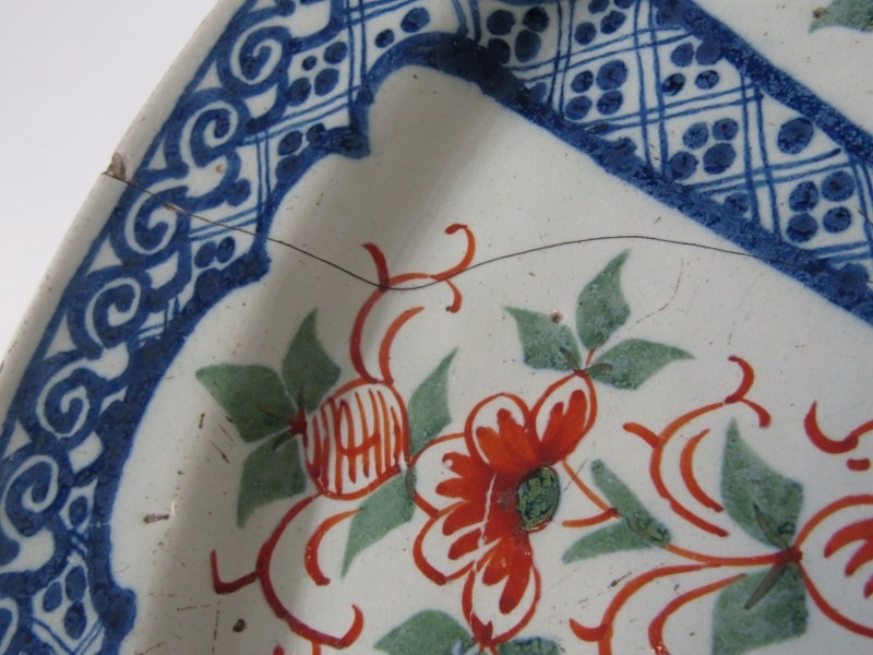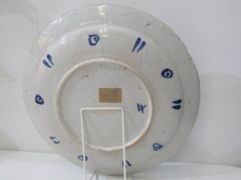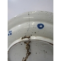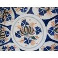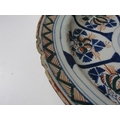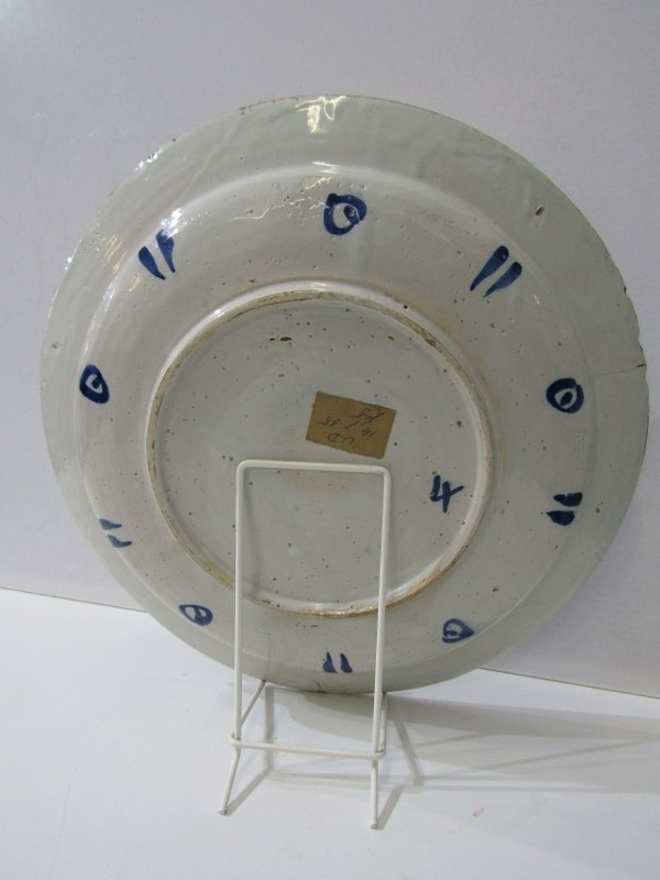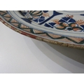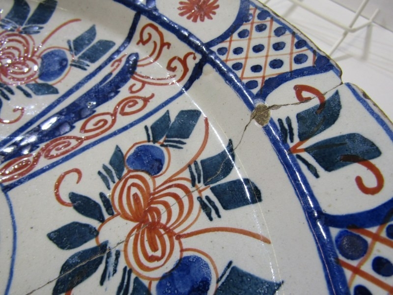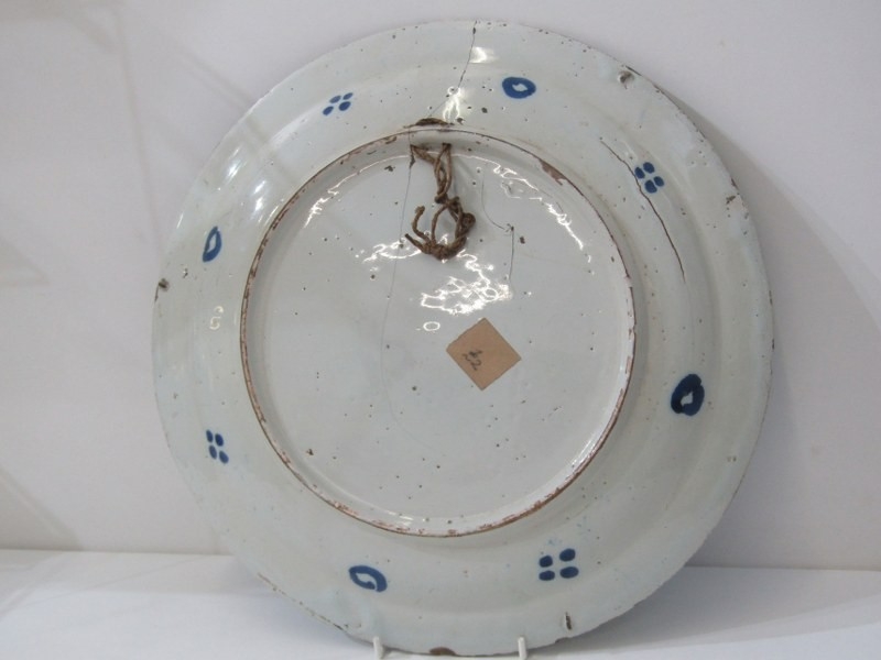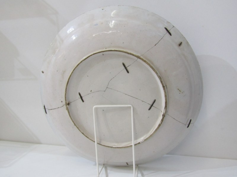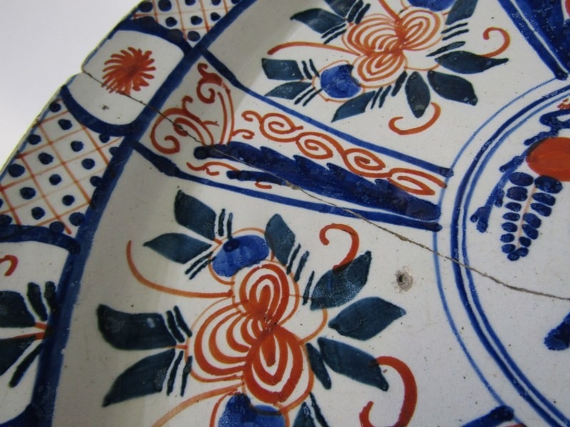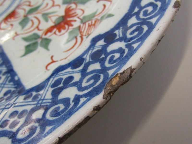 EARLY DELFT, 3 various polychromed chargers with floral decorated panels, maximum diameter 35cms (2 with extended cracks)