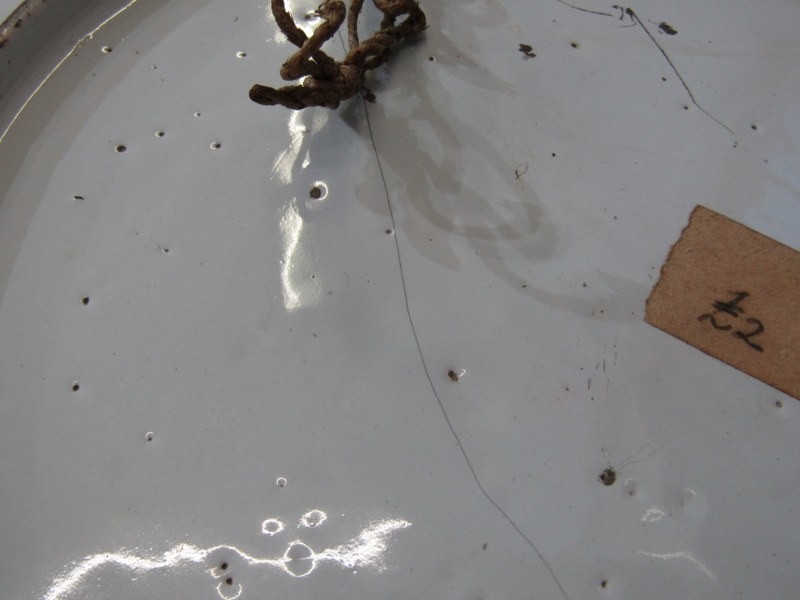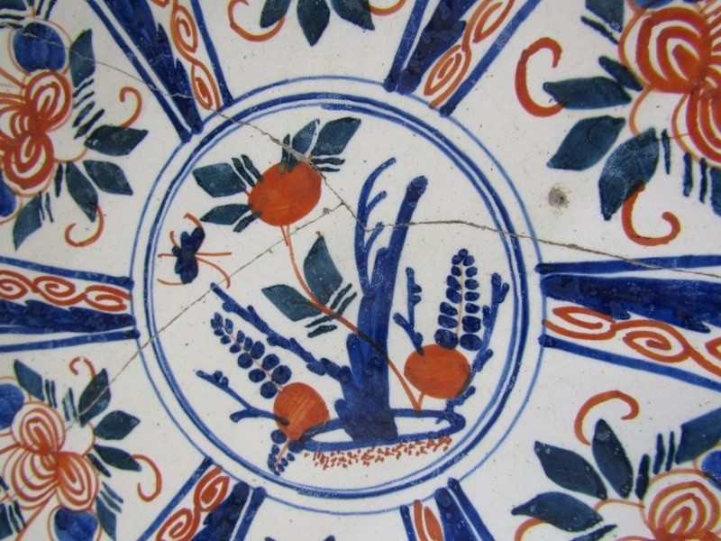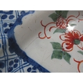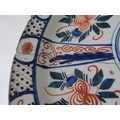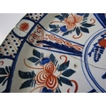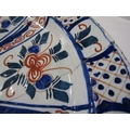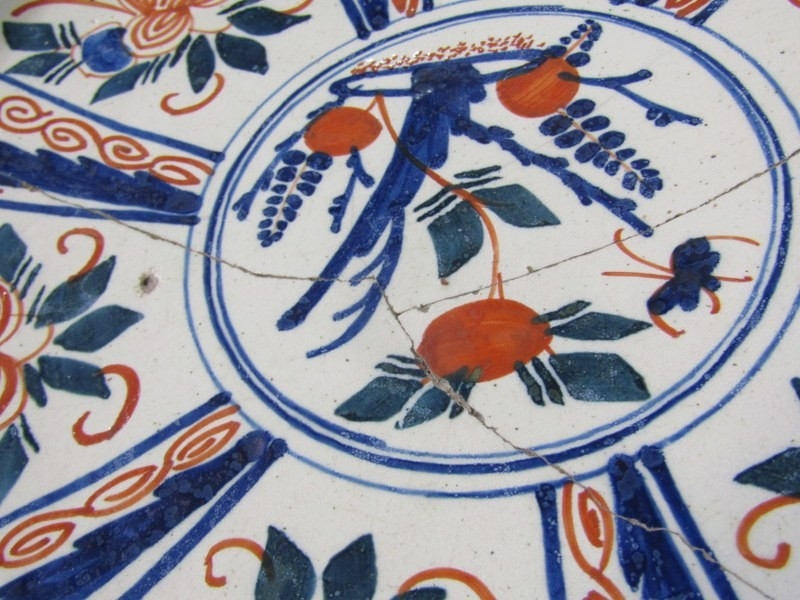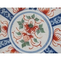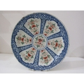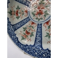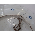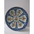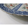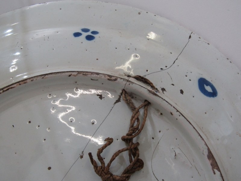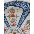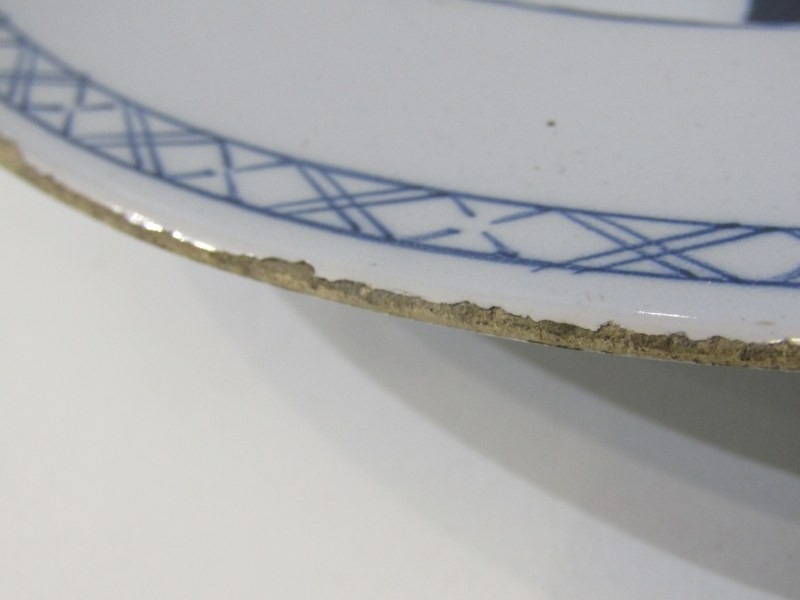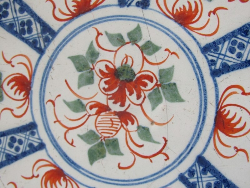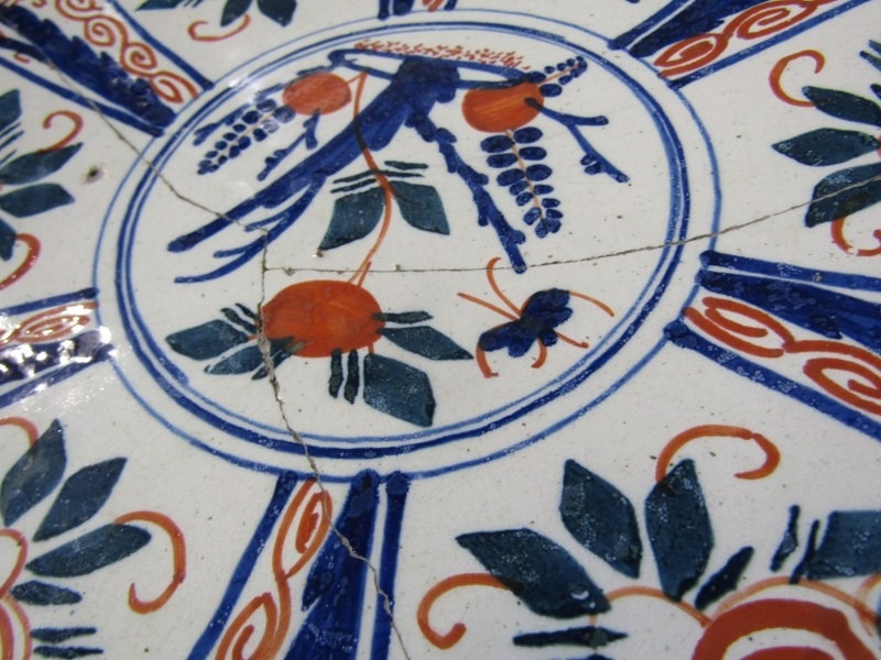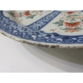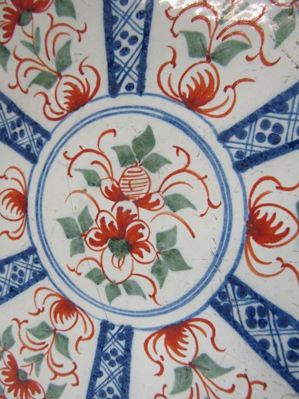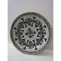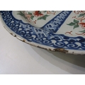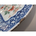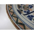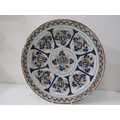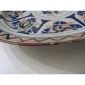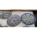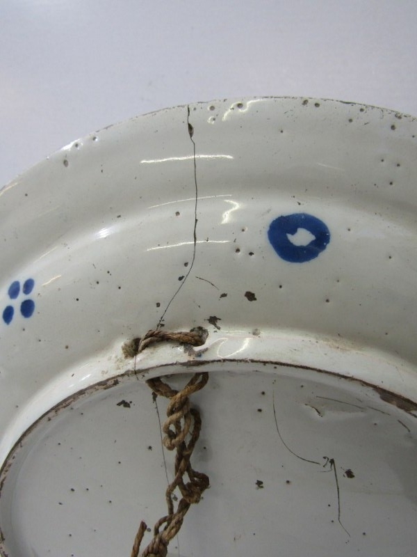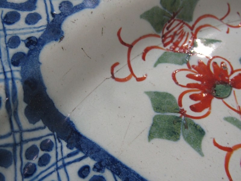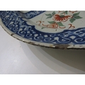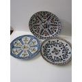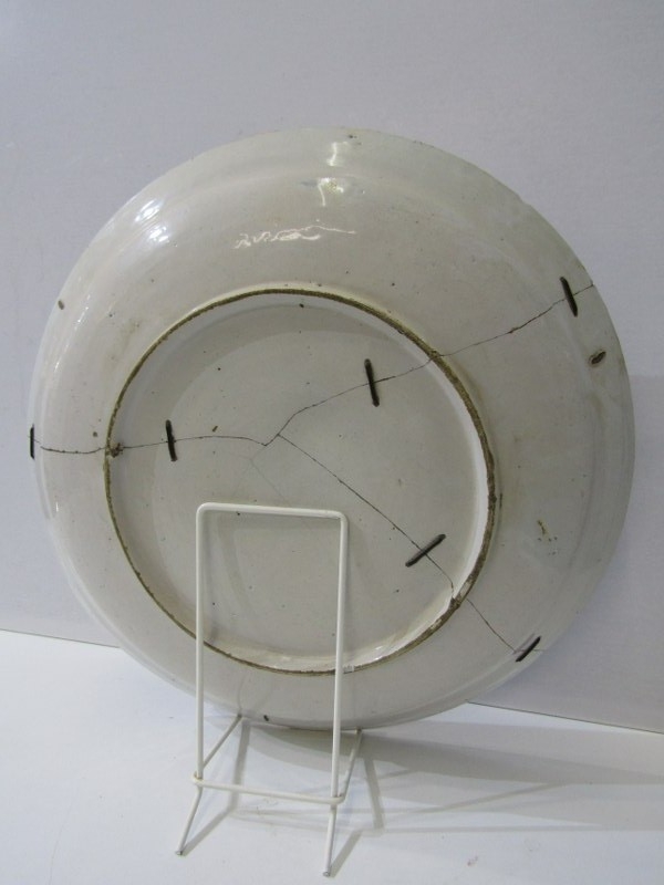 EARLY DELFT, 3 various polychromed chargers with floral decorated panels, maximum diameter 35cms (2 with extended cracks)