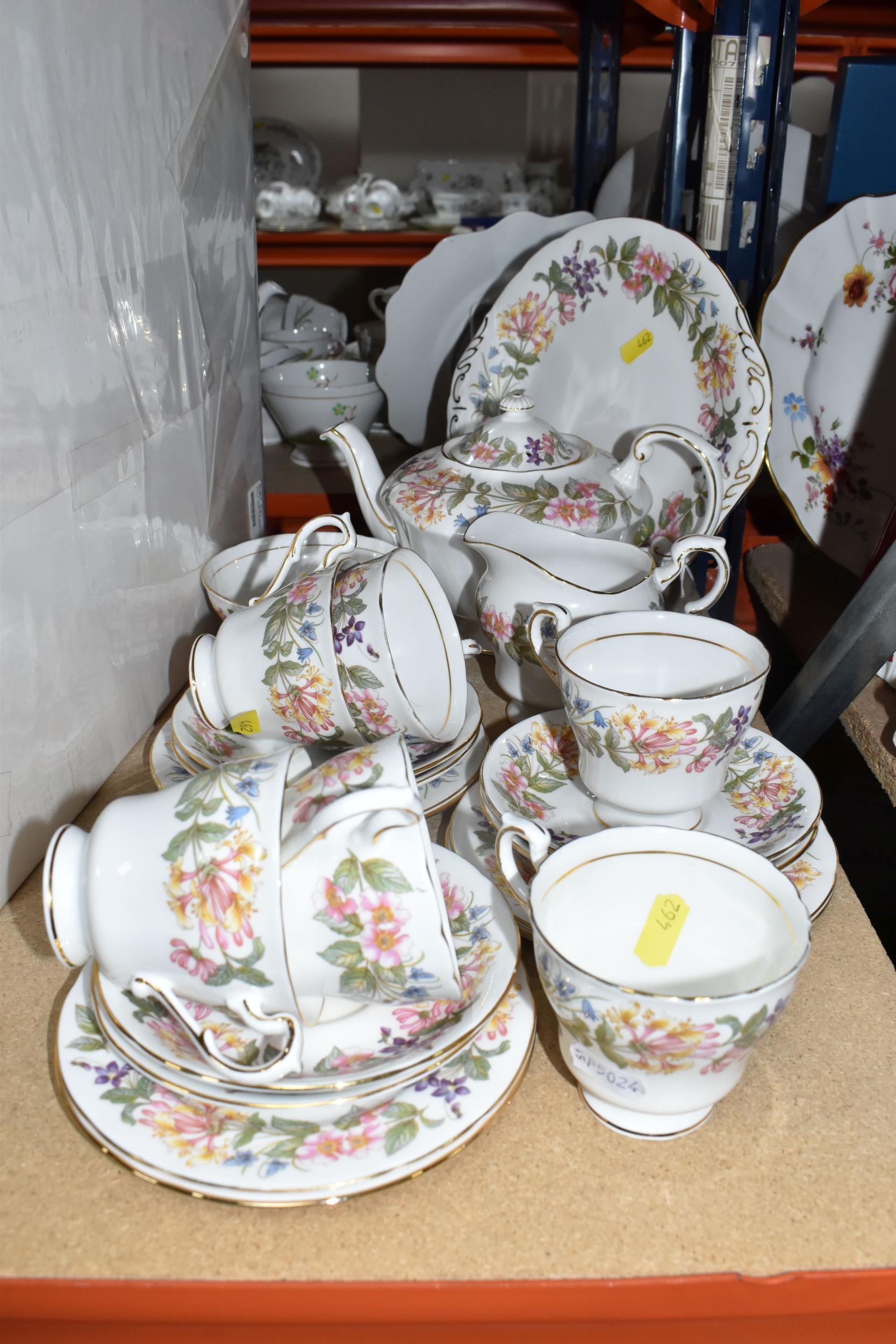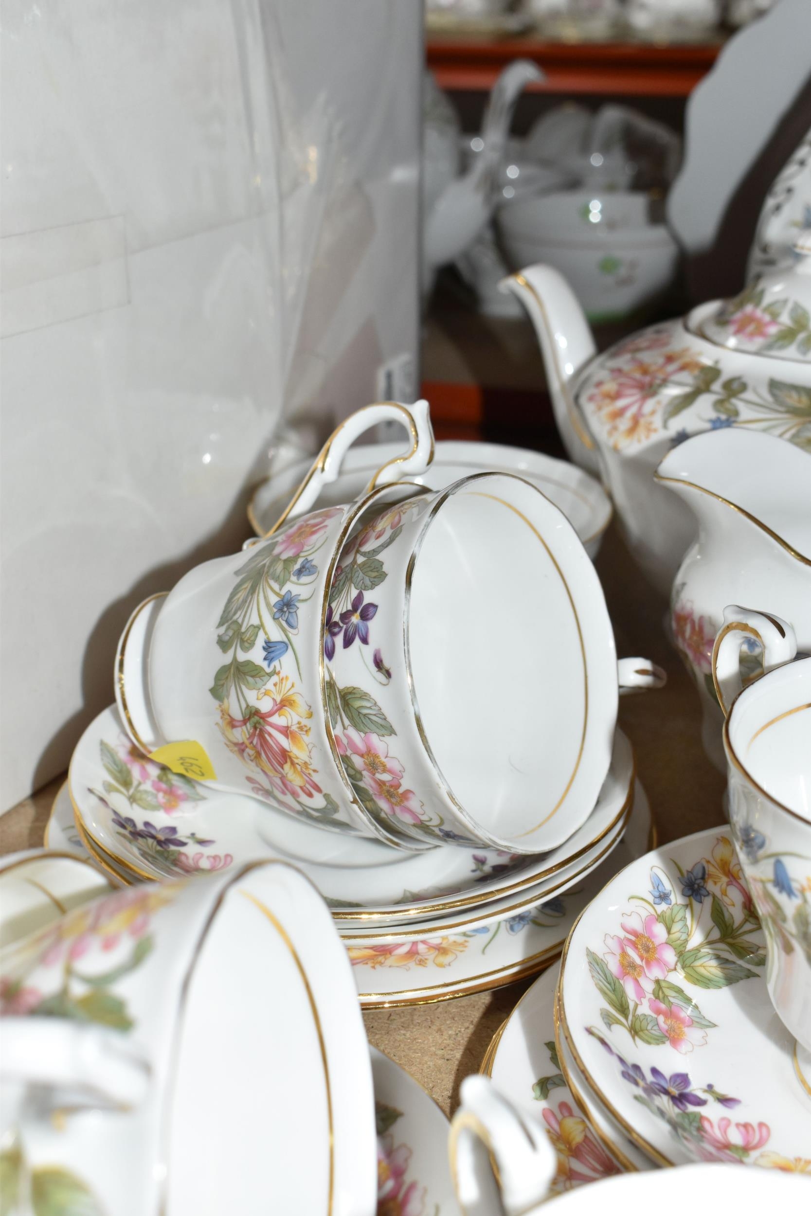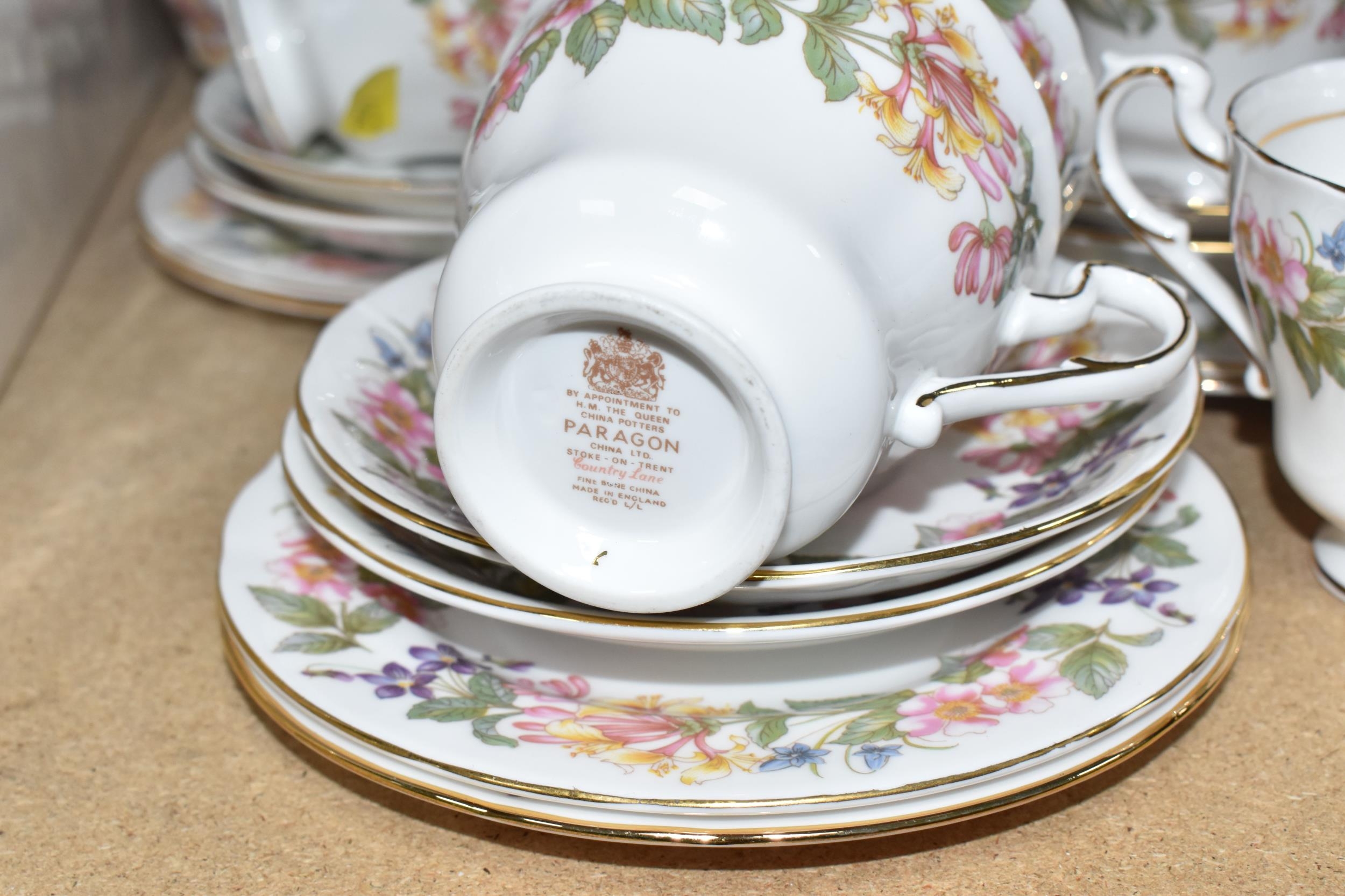 TWENTY-TWO PIECES OF PARAGON 'COUNTRY LANE' TEAWARE comprising six tea cups, six saucers, six side plates, a teapot, a milk jug, a sugar bowl, and a double handled cake plate (22) (Condition Report: all items appear in fair condition)