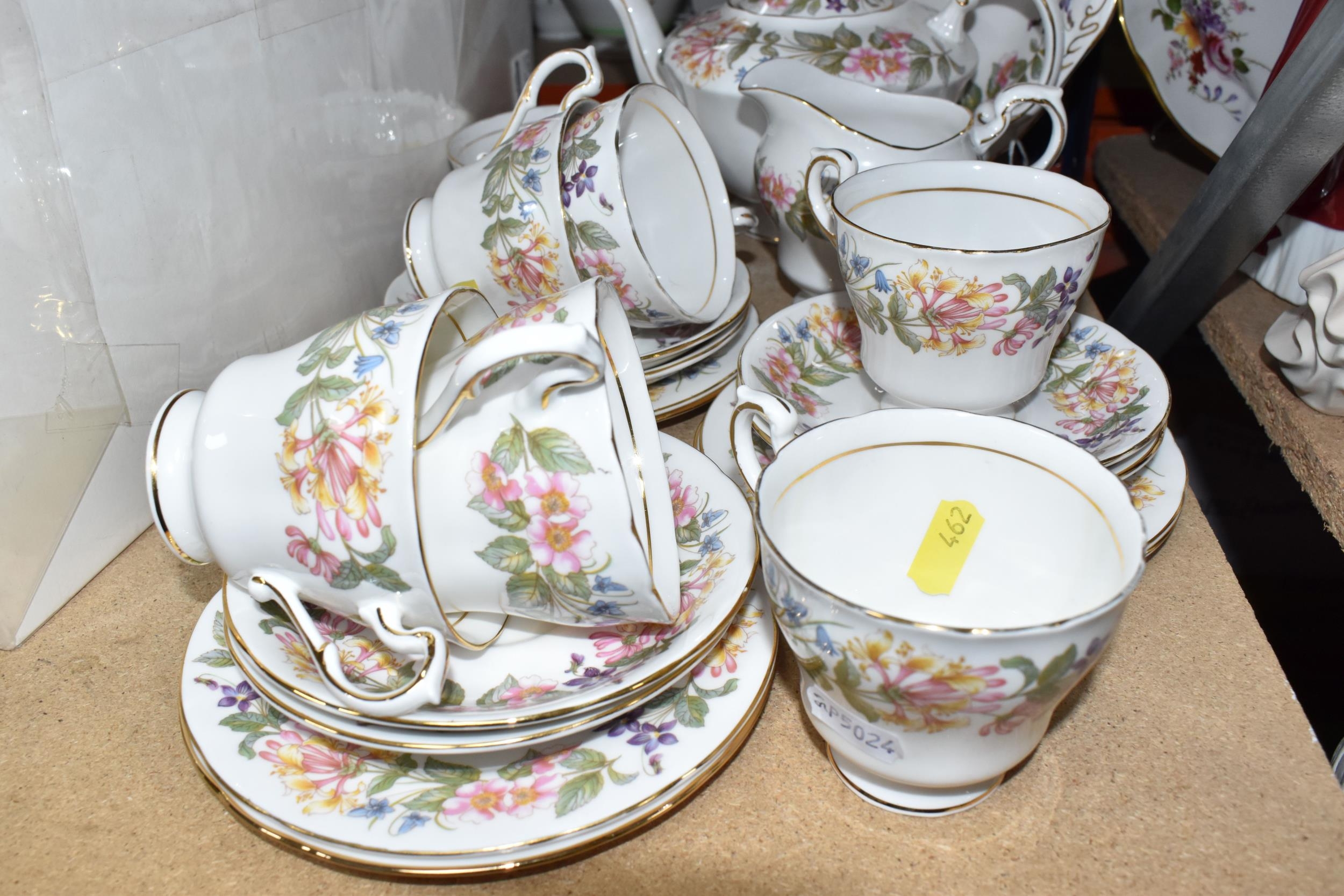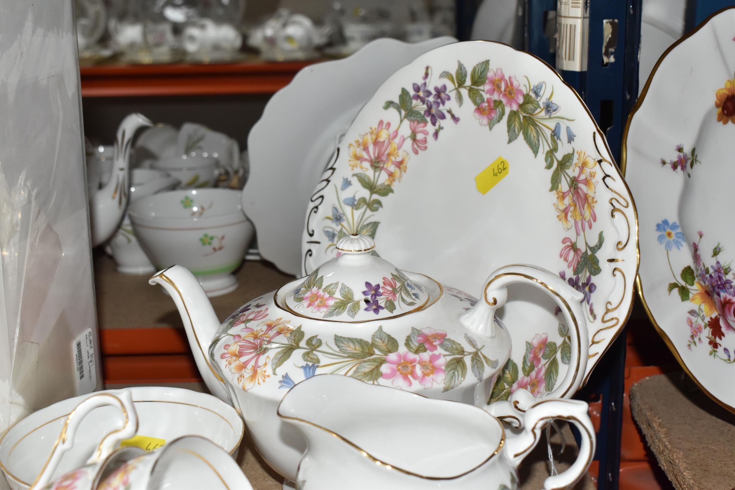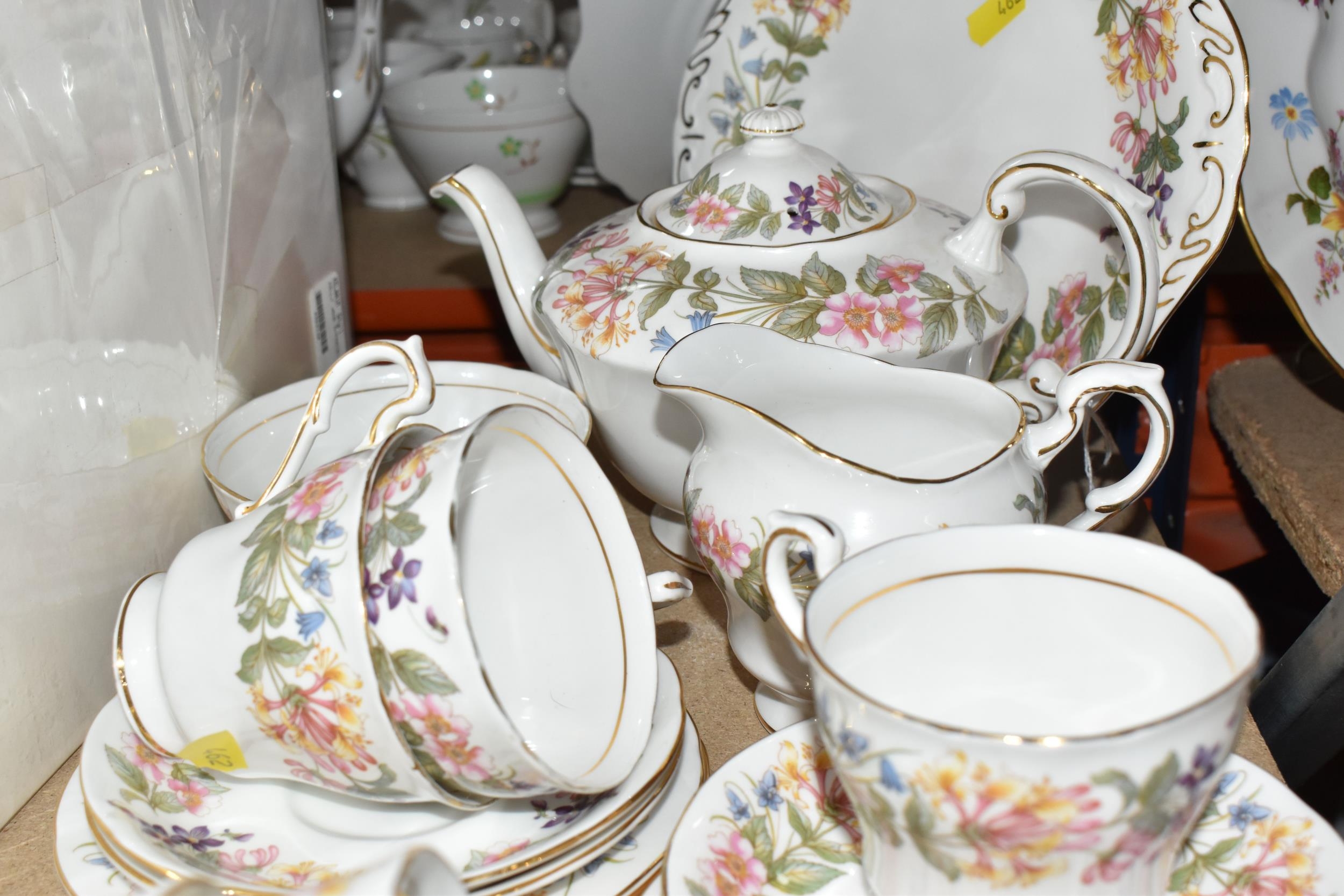 TWENTY-TWO PIECES OF PARAGON 'COUNTRY LANE' TEAWARE comprising six tea cups, six saucers, six side plates, a teapot, a milk jug, a sugar bowl, and a double handled cake plate (22) (Condition Report: all items appear in fair condition)
