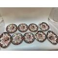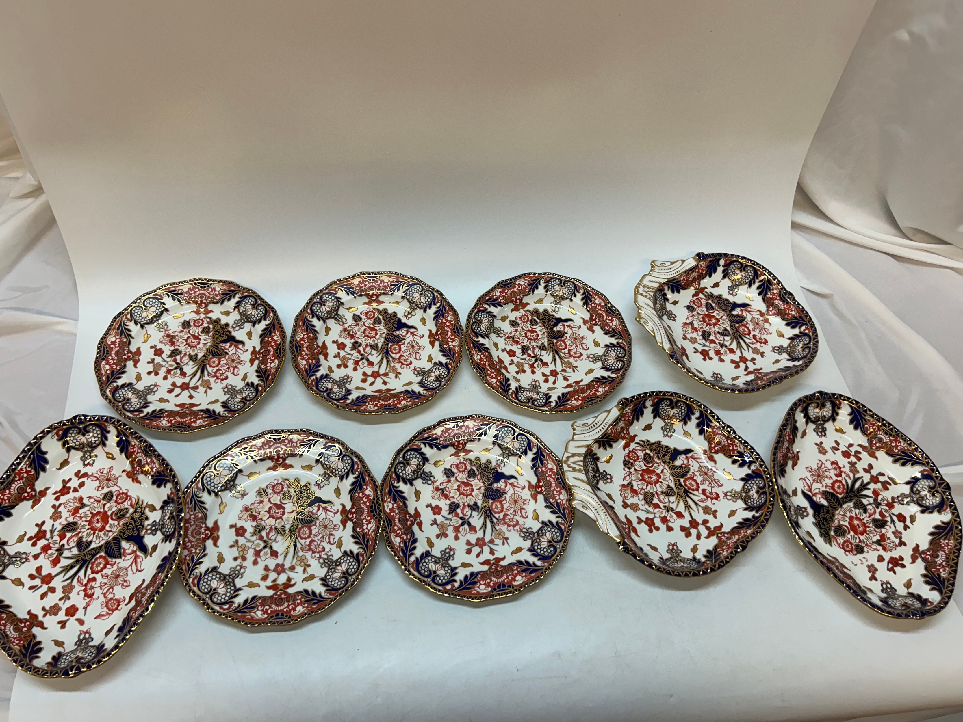 A pair of Royal Crown Derby shell shaped dishes pattern number 383, a pair of matching lozenge shaped dishes and five plates, all decorated in Imari colours highlighted with gilding
