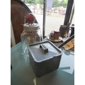 A bygone "Blow" butter churn and a Siddons square form cast iron blue enamelled pan