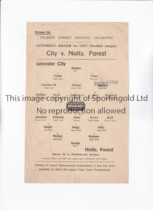 1947 LEICESTER CITY V NOTTINGHAM FOREST A single sheet for the league game at Filbert Street on 1/3/47. One pencil team change. Generally good