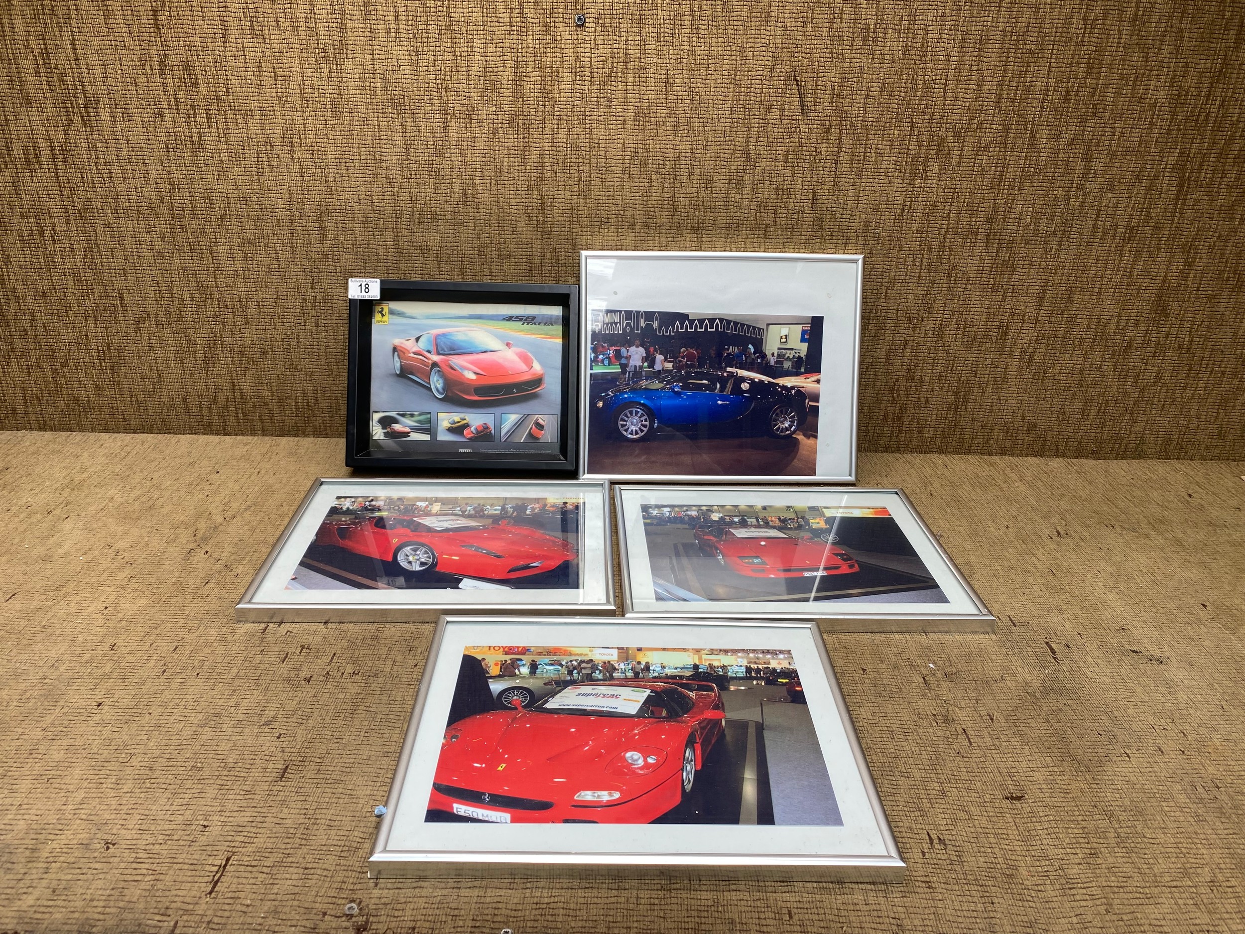 5 framed pictures of sports cars, including a Ferrari and a Bugatti Veyron.