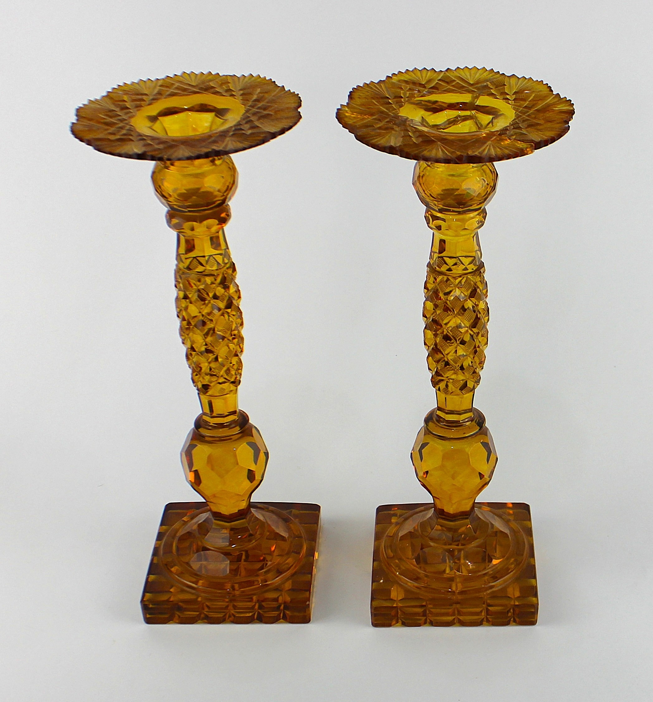 A pair of 19th century amber coloured glass candlesticks, with faceted decoration throughout, 33cm high, (one with damaged sconce).