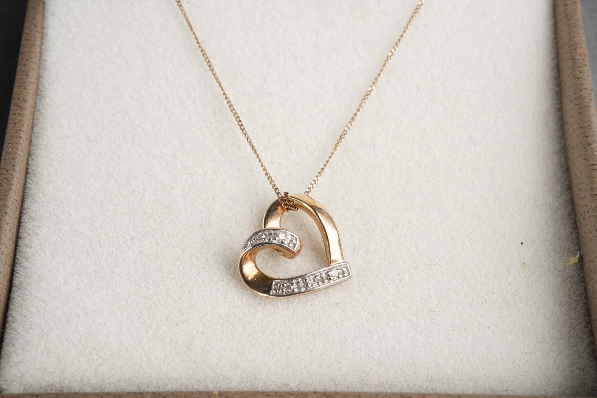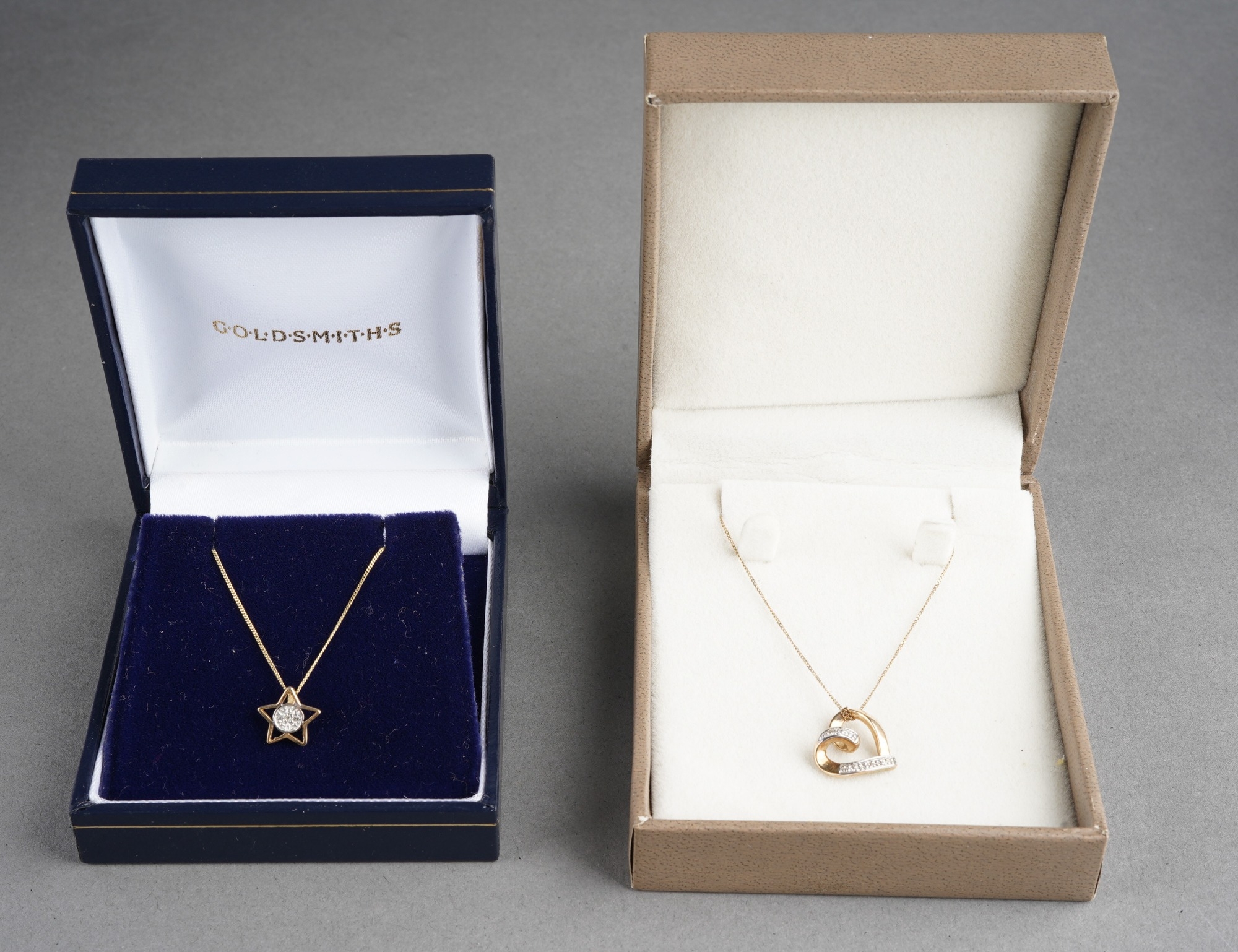 Two diamond set yellow metal pendant wit chain. Pendants stamped 375 or 9ct, approx length pendants 10mm and 12mm, approx gross weight 2.23grams.
