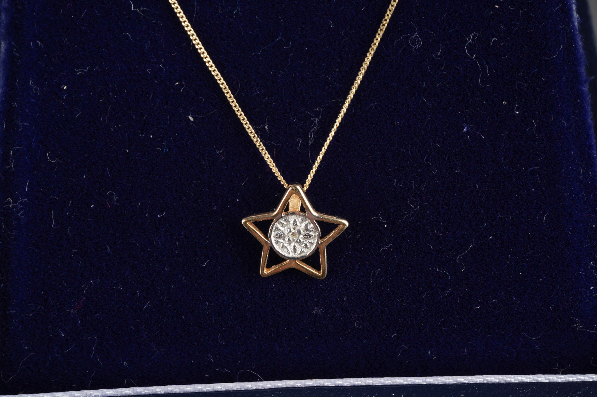Two diamond set yellow metal pendant wit chain. Pendants sta...