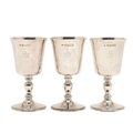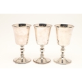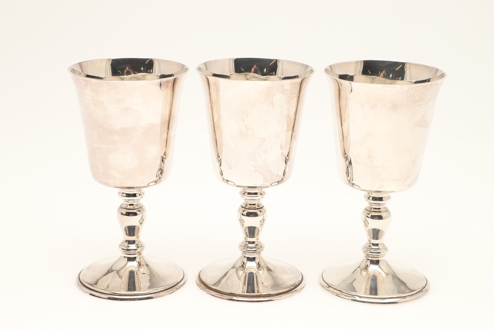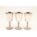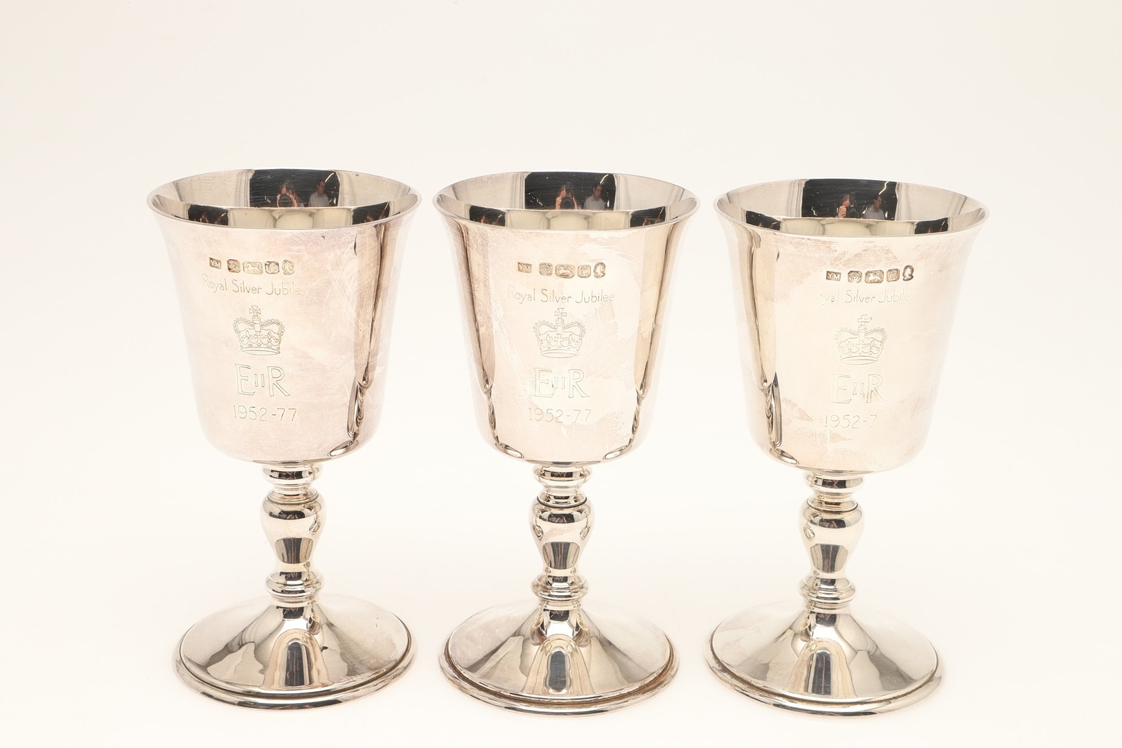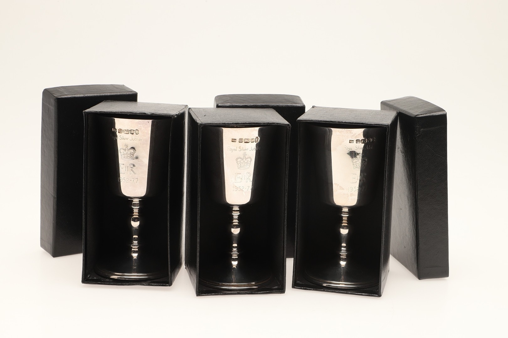 A SET OF THREE BOXED QUEEN ELIZABETH II SILVER JUBILEE GOBLETS. Engraved with 'Royal Silver Jubilee EIIR 1952-1977', hallmarked Yorkshire Mint (probably), Sheffield, 1977 (with silver jubilee mark). Height 13.5cm x Diameter 7cm. Total silver weight 14.6ozt. (3).