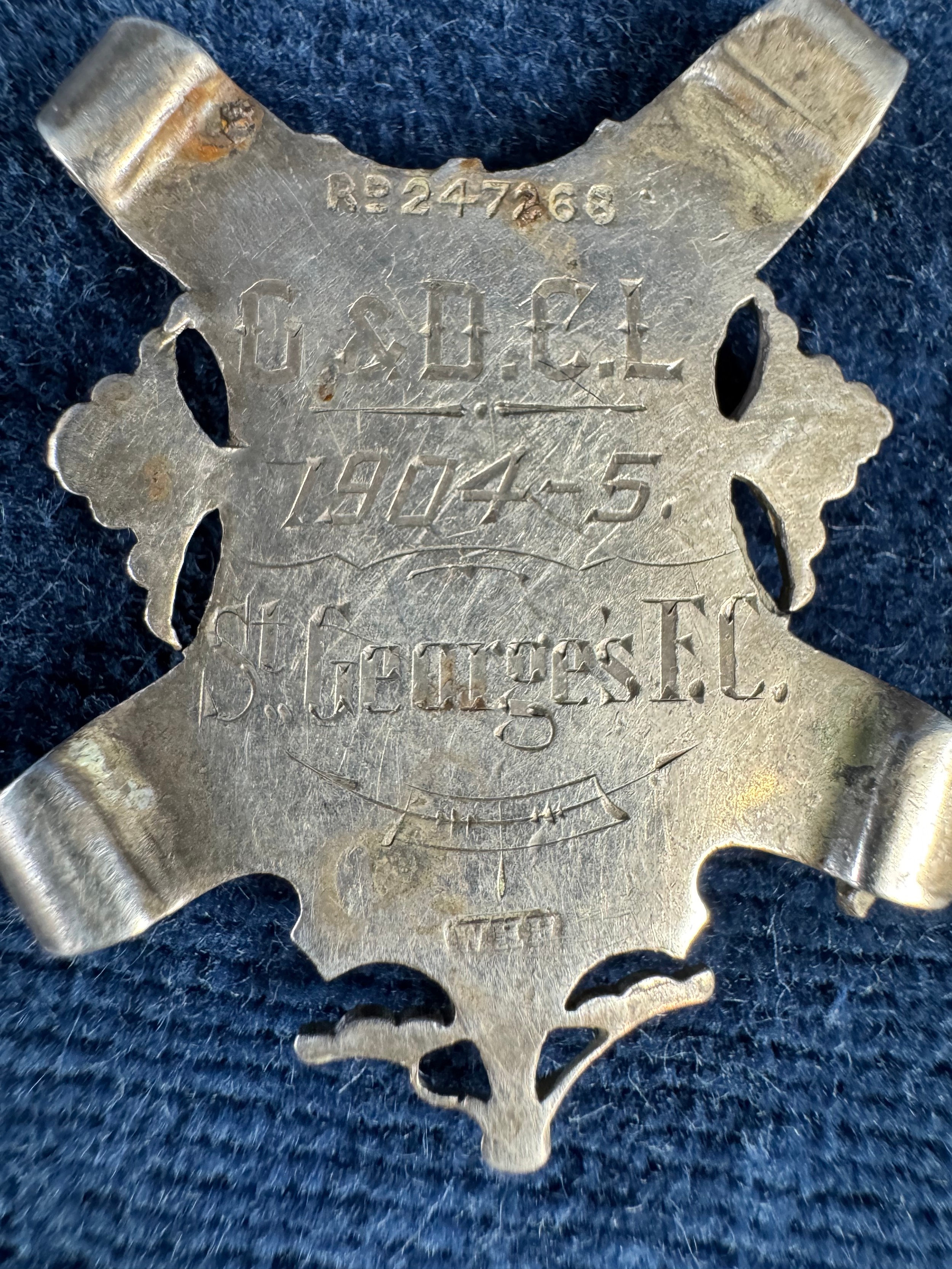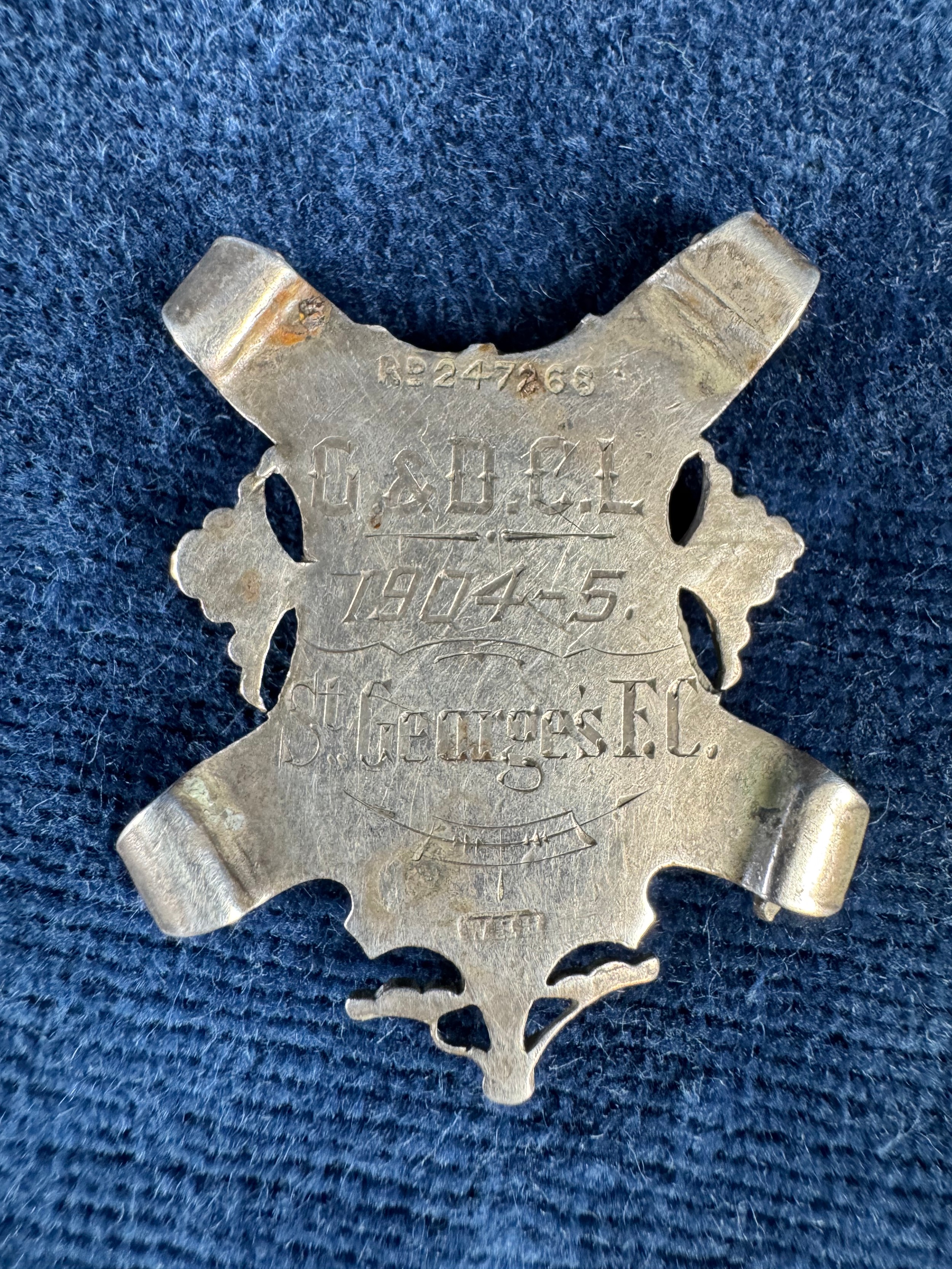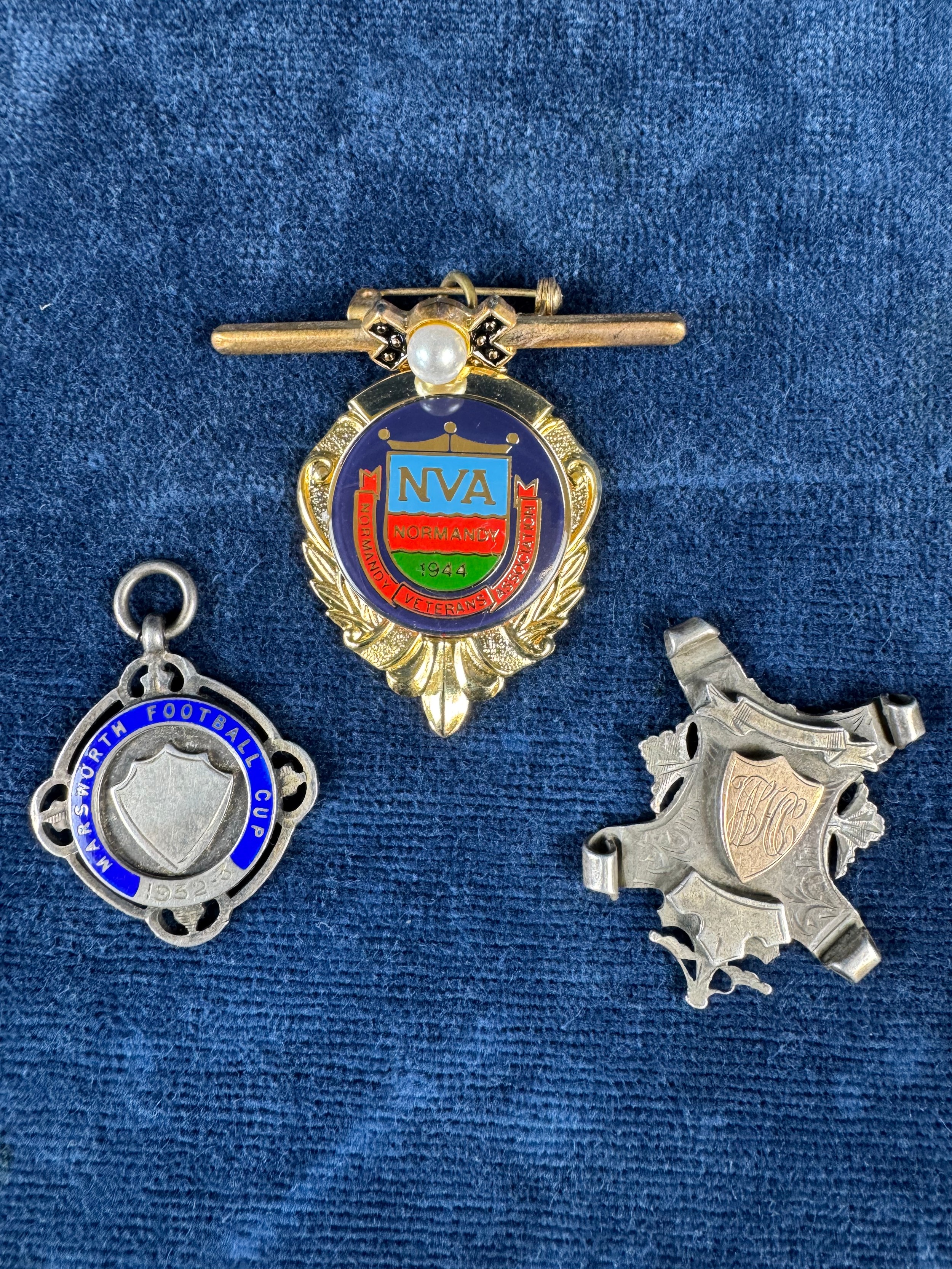 A vintage white metal medallion St George's FC 1904-1905, a hallmarked silver fob medallion 'Marsworth Football Cup 1932-1933', and a Normandy Veterans Association badge and bar clip.